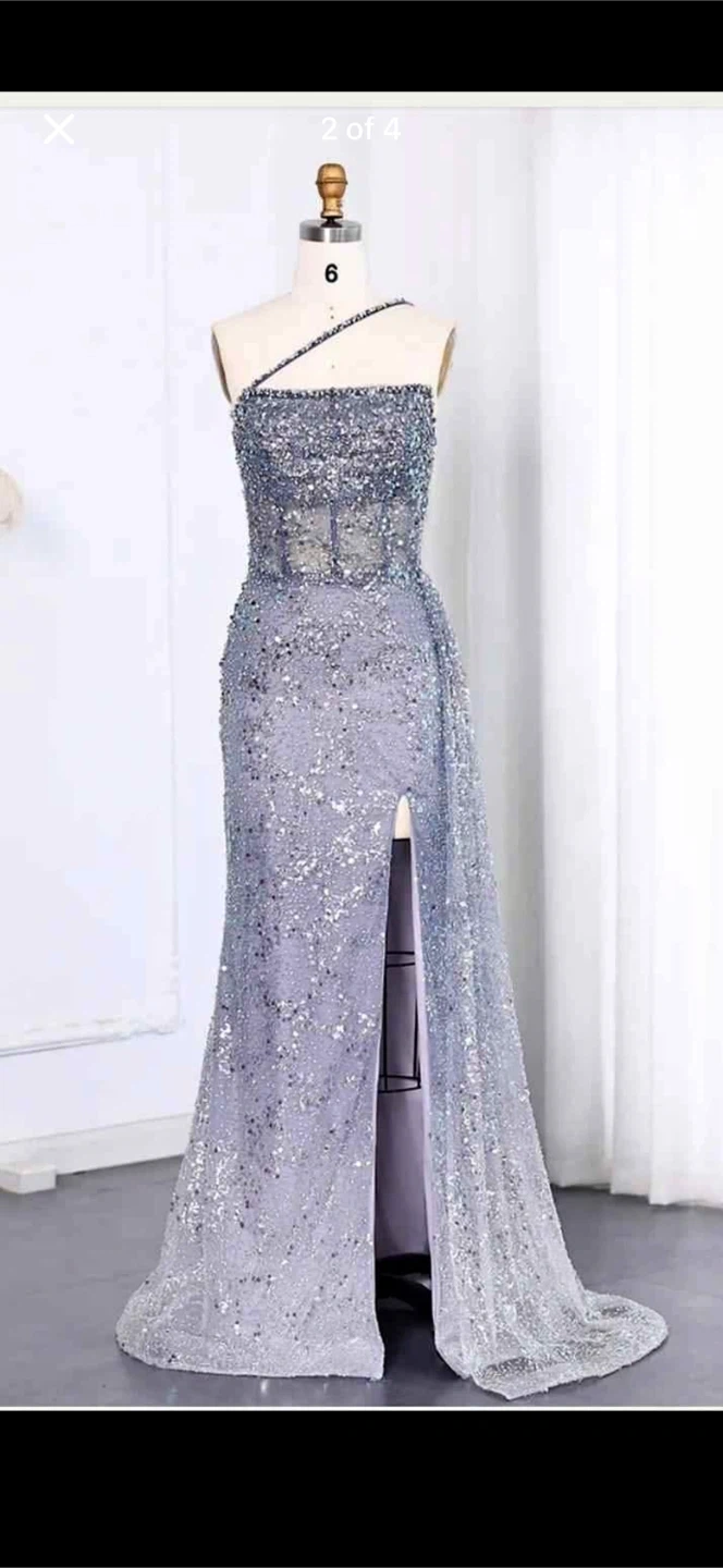 This stunning gown features a dazzling all-over sequin and bead embellishment on a lavender base. It has a flattering one-shoulder neckline and a dramatic thigh-high slit with a sweep train. It's perfect for proms, galas, or any formal event!
