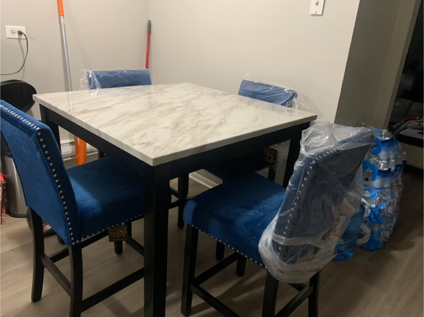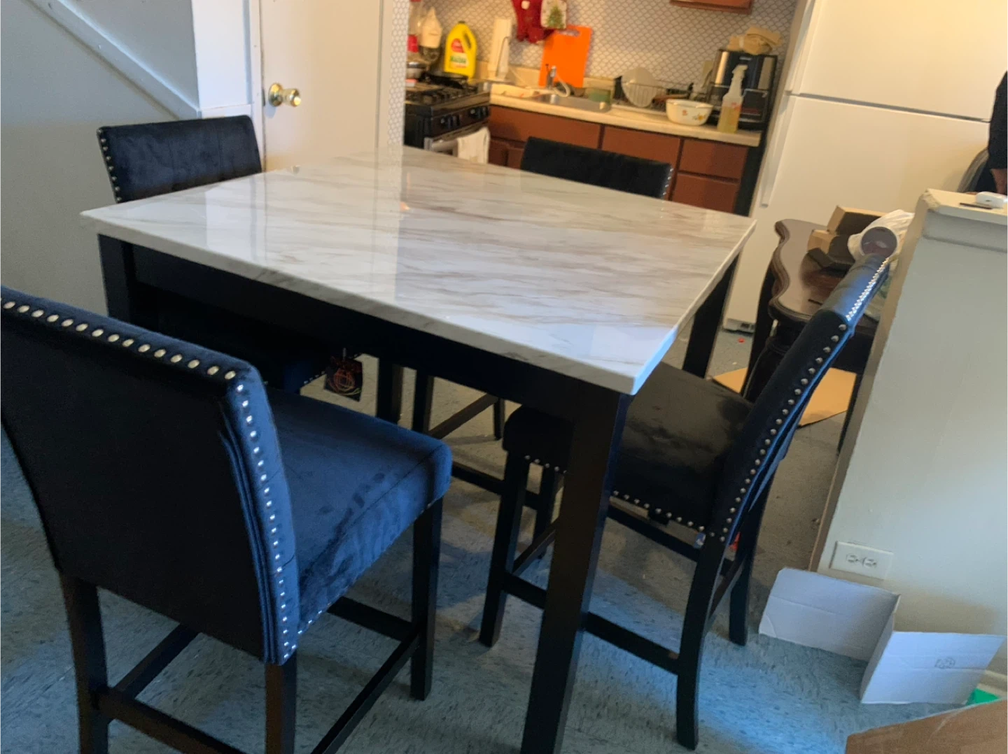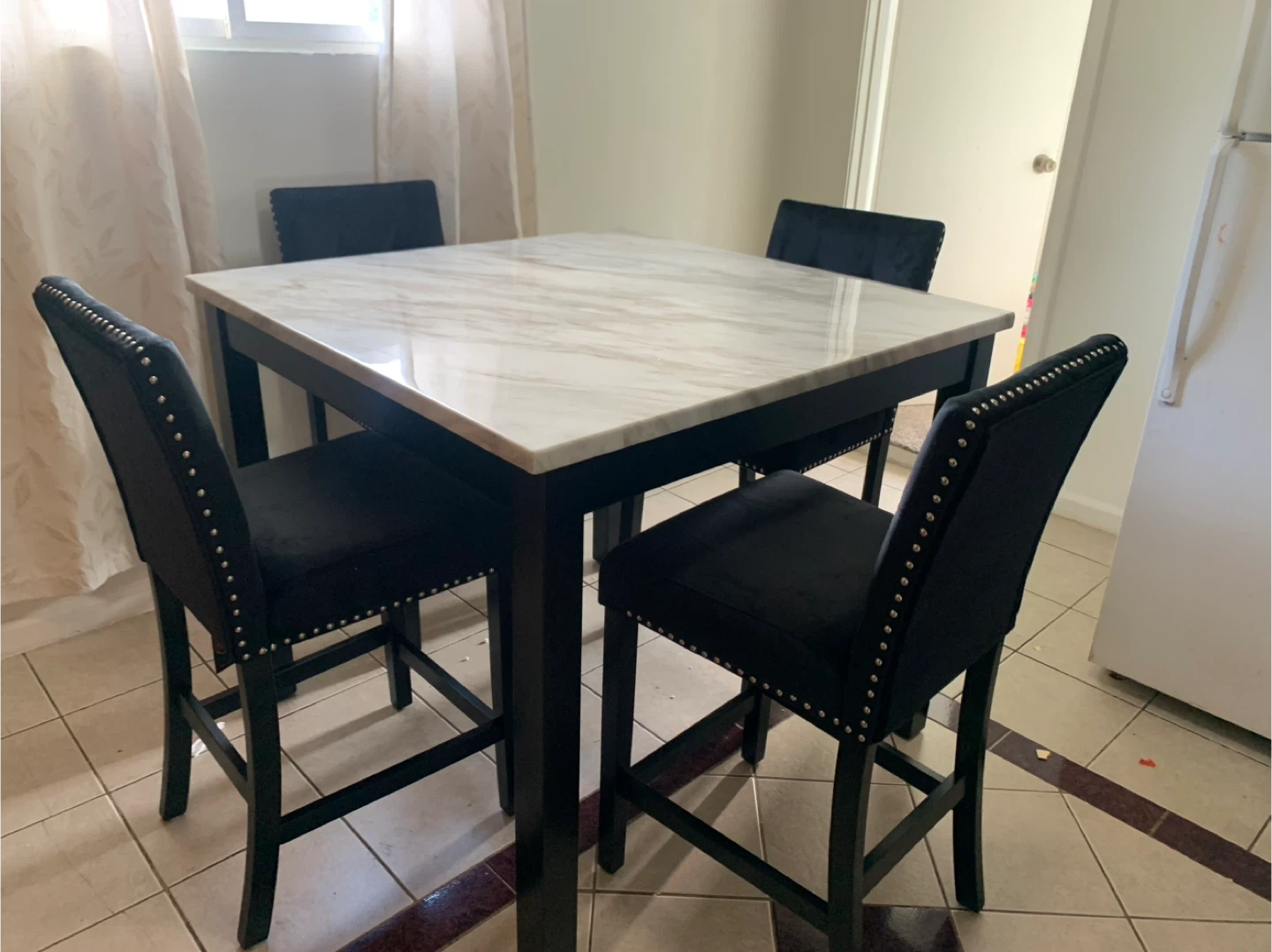 This dining set features a square bar height table with a marble-look top and four upholstered bar stools. The table has a sturdy black frame. The stools are upholstered in dark velvet with silver nailhead trim and black legs. They look great in any modern dining space!
