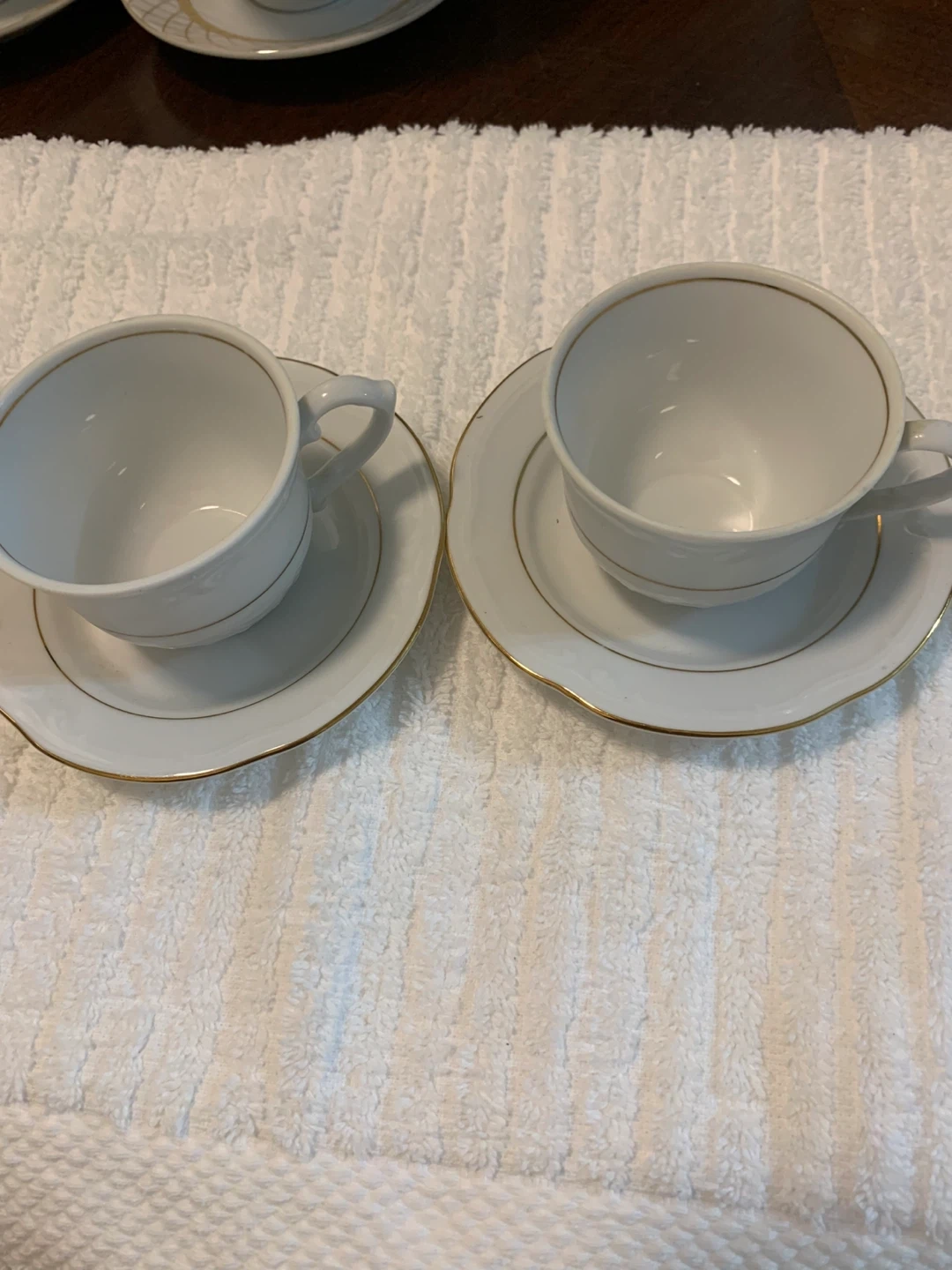 Selling these teacups with saucers. They're white with a delicate gold trim, perfect for tea or coffee. They are in good condition
