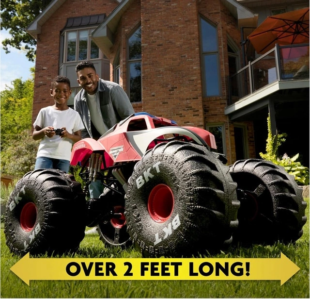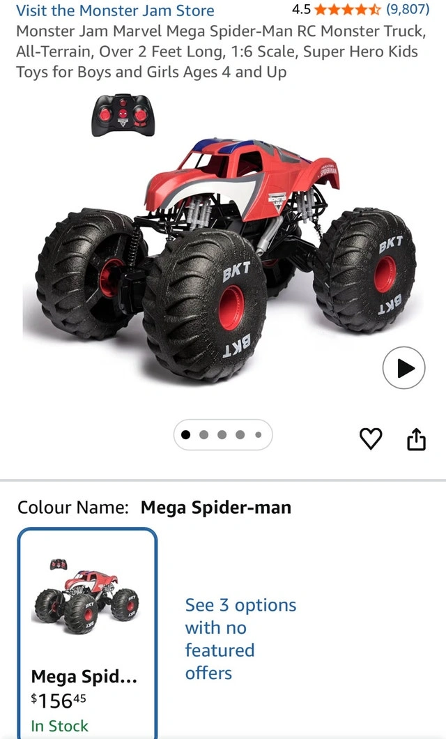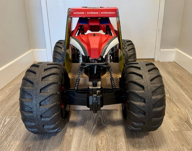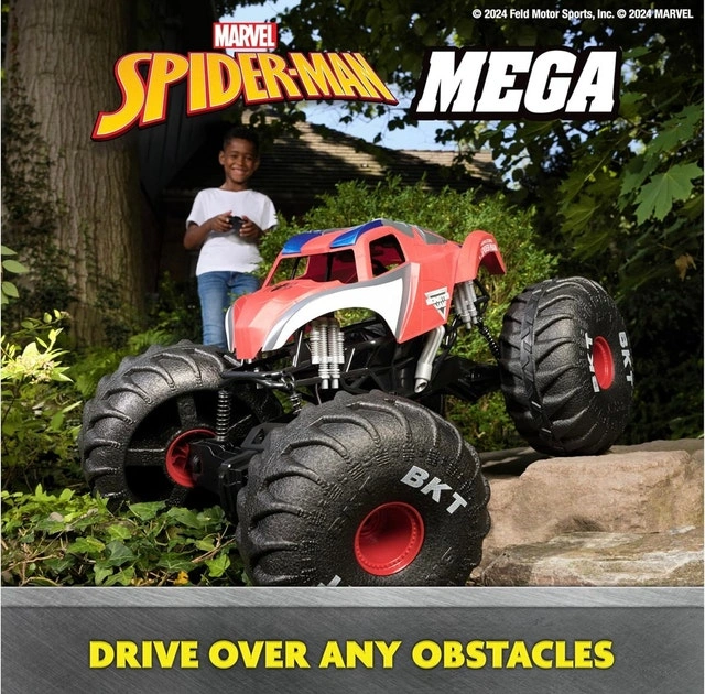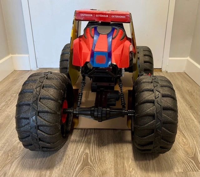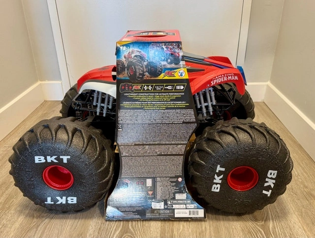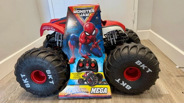 Brand new Monster Jam Marvel Mega Spider-Man RC monster truck. It's over 2 feet long, a huge 1:6 scale, and all-terrain so it can drive anywhere. Comes with its remote control.
