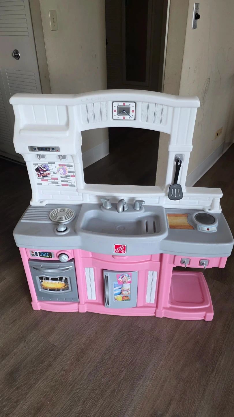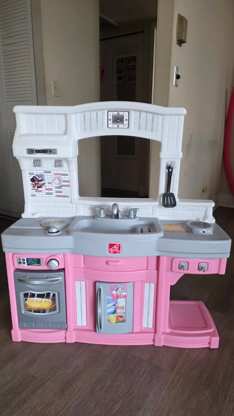 A Step2 play kitchen set in pink and white. It features a sink, stovetop, oven, microwave, and refrigerator. Includes a spatula accessory.