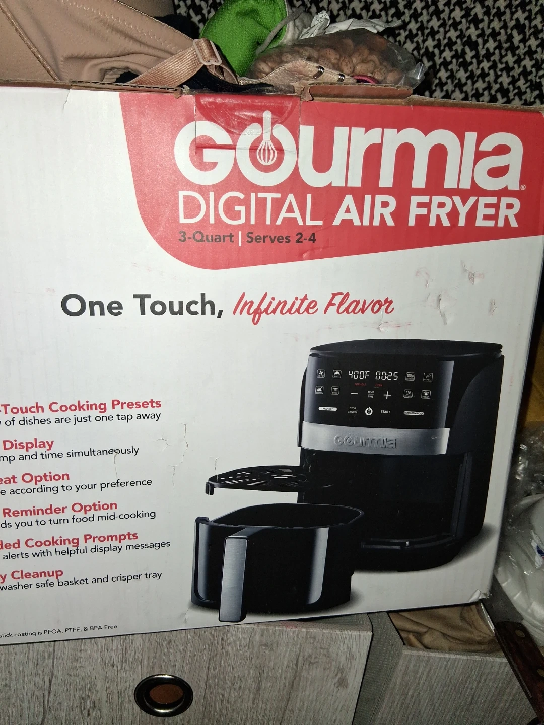 Gourmia 3-Quart Digital Air Fryer. Serves 2-4 people. Features one-touch cooking presets and a digital display. Dishwasher safe basket and crisper tray for easy cleanup.