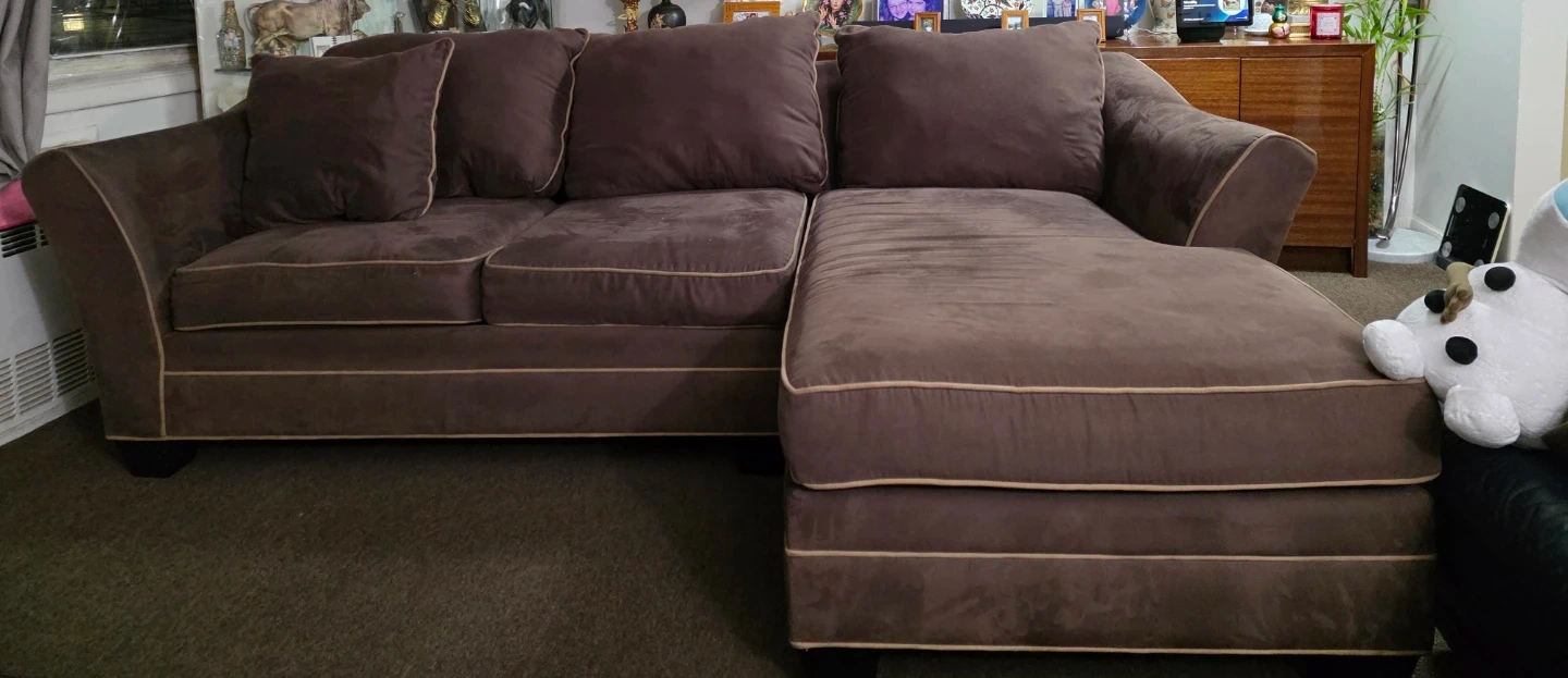 This brown sectional sofa features a chaise lounge. It's upholstered in a soft, suede-like fabric with contrasting piping. Includes multiple throw pillows.