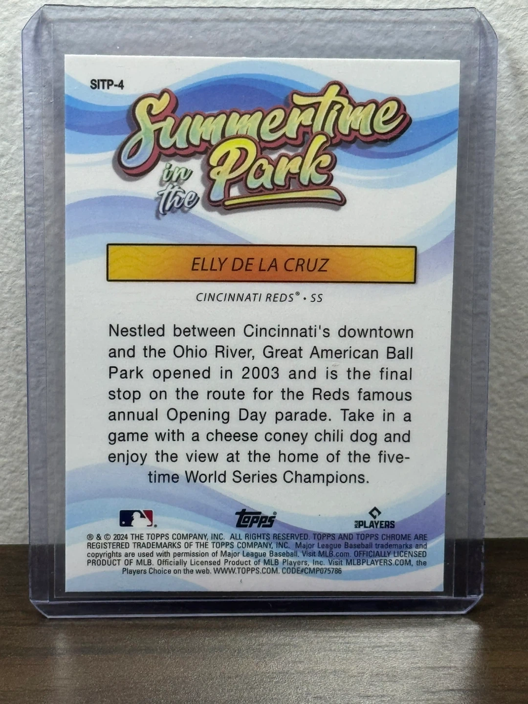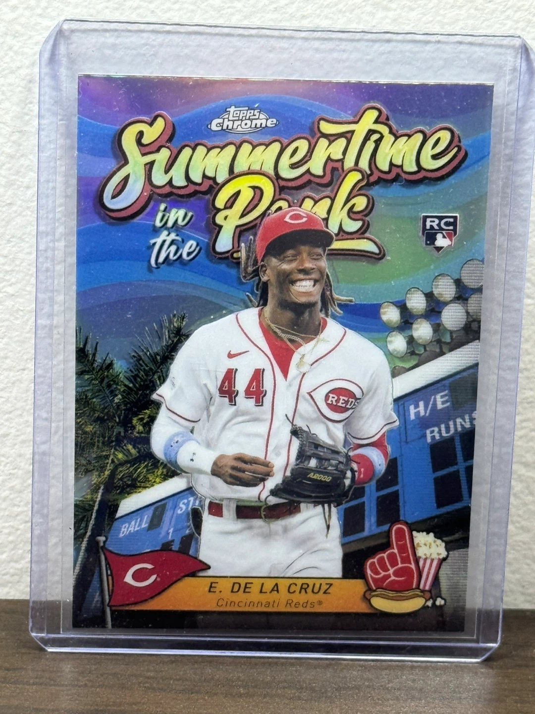 Selling an Elly De La Cruz Cincinnati Reds rookie card from the Topps Chrome Summertime in the Park series. This card features a vibrant design and is in great condition. It's a fantastic addition for any baseball card collector or Reds fan!