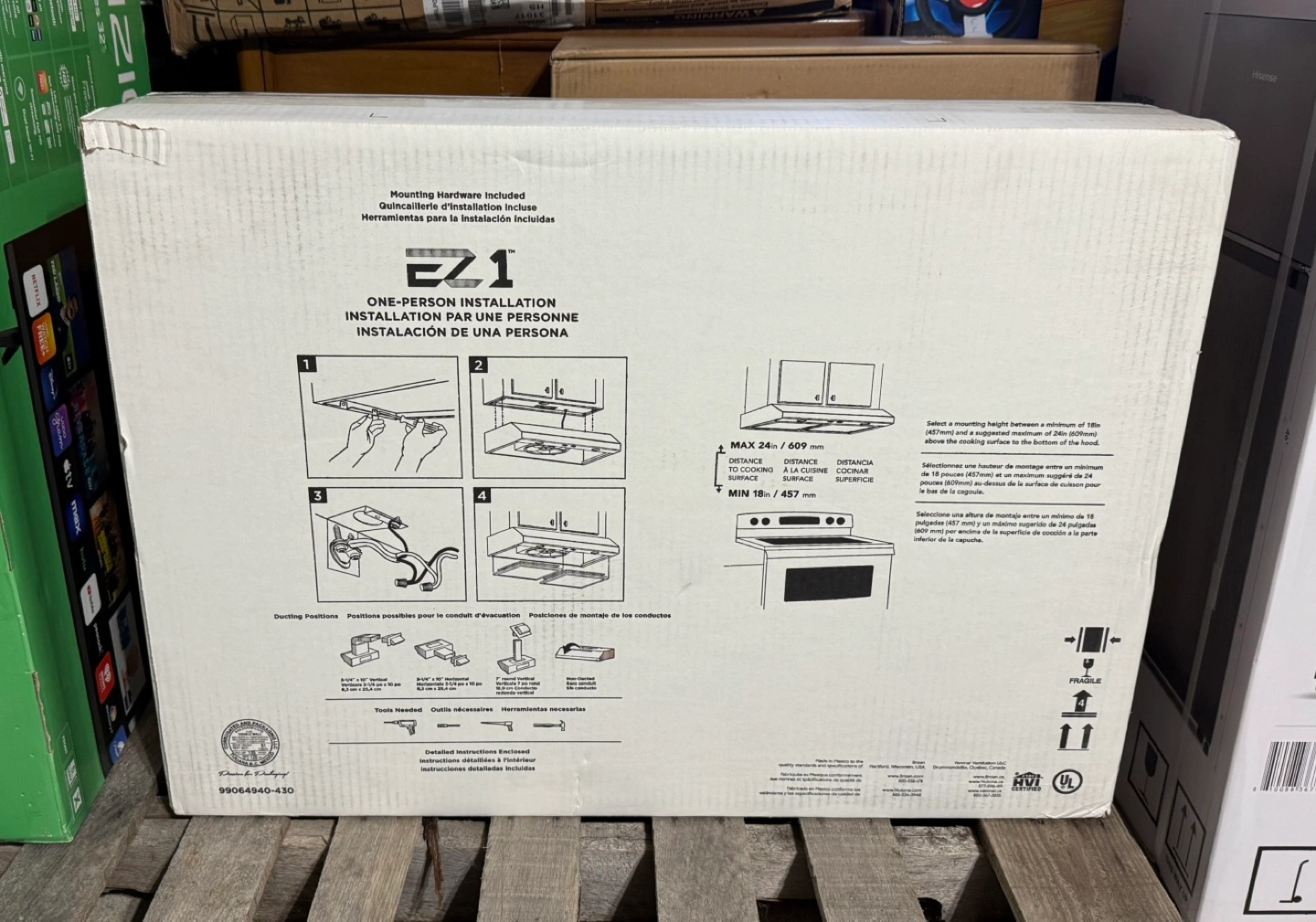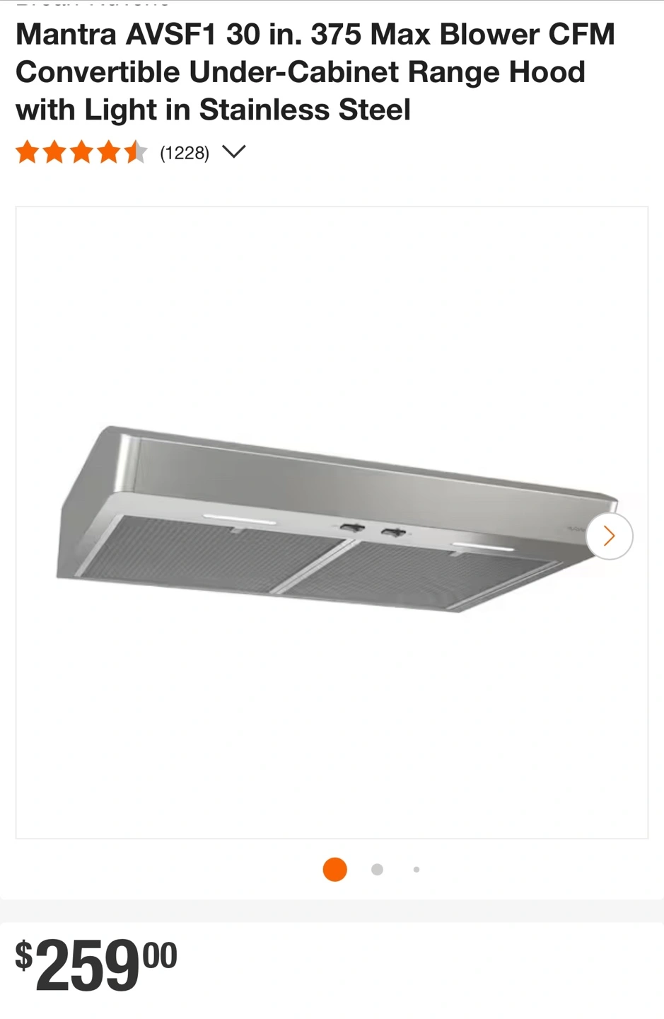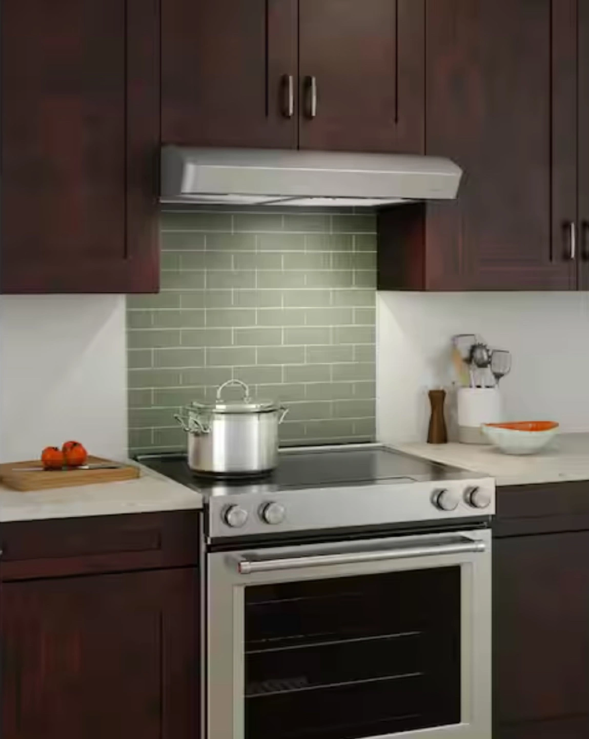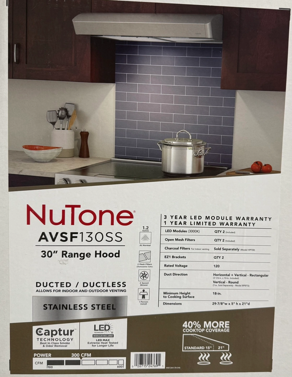 30" range hood. Ducted/ductless. Stainless steel. Includes installation hardware. 40% more cooktop coverage than standard.