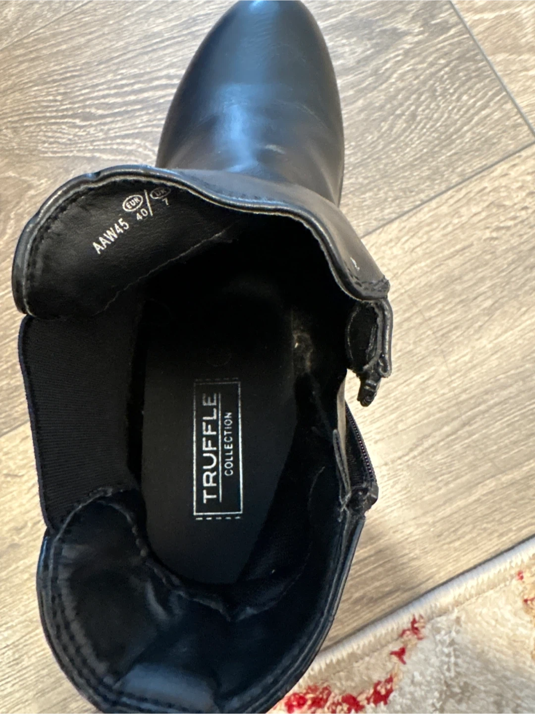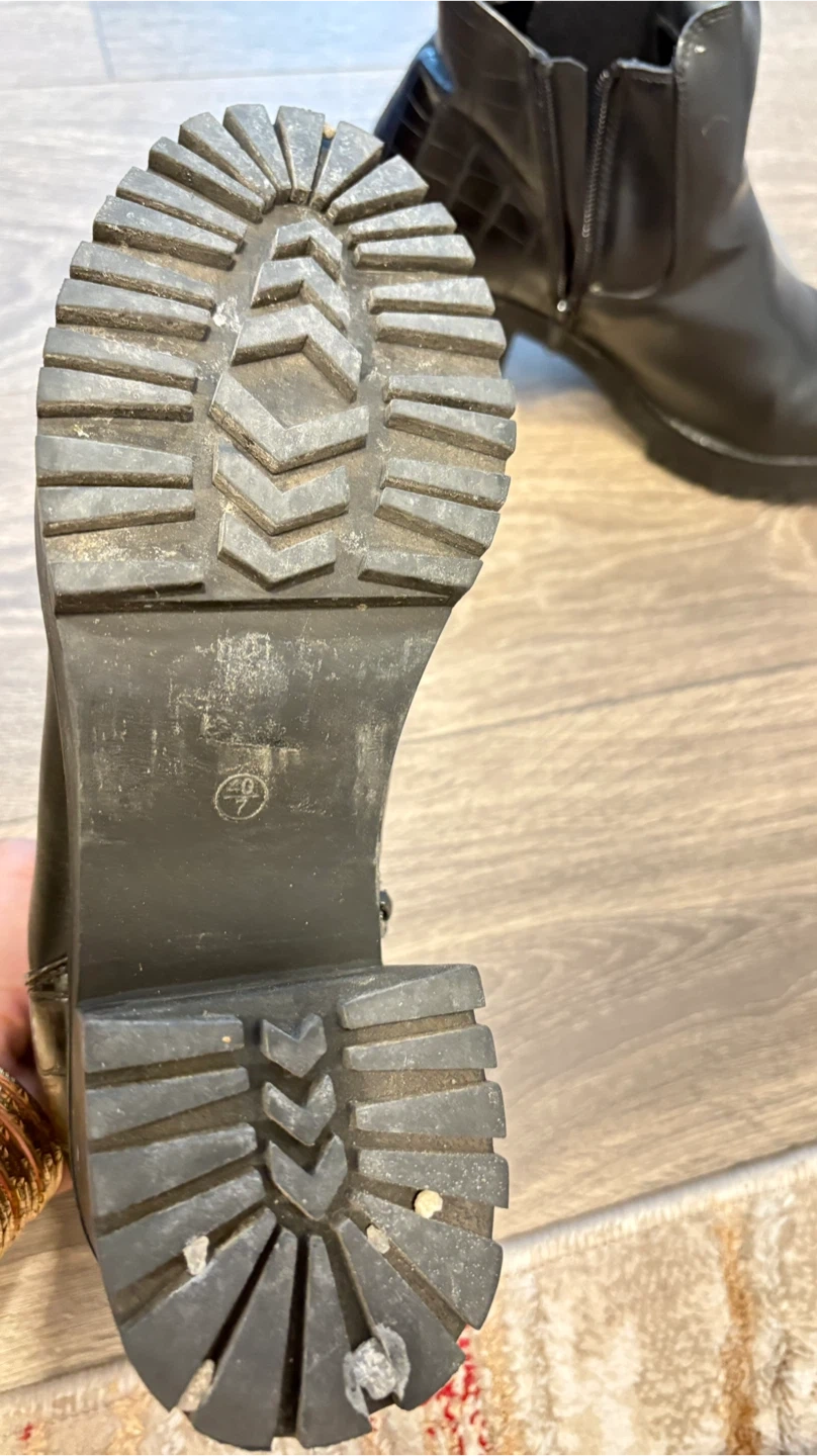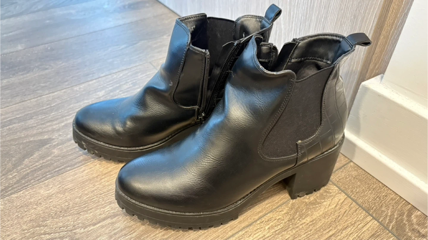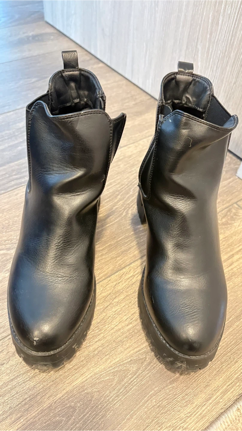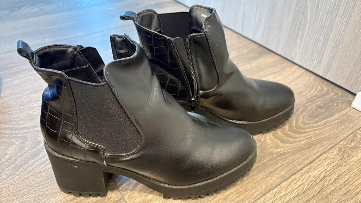 Black faux leather ankle boots from Truffle Collection. Features a side zipper, elastic gore, and a croc-embossed heel detail. Lug sole and block heel for a sturdy fit.