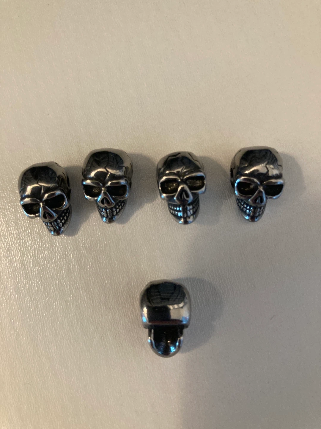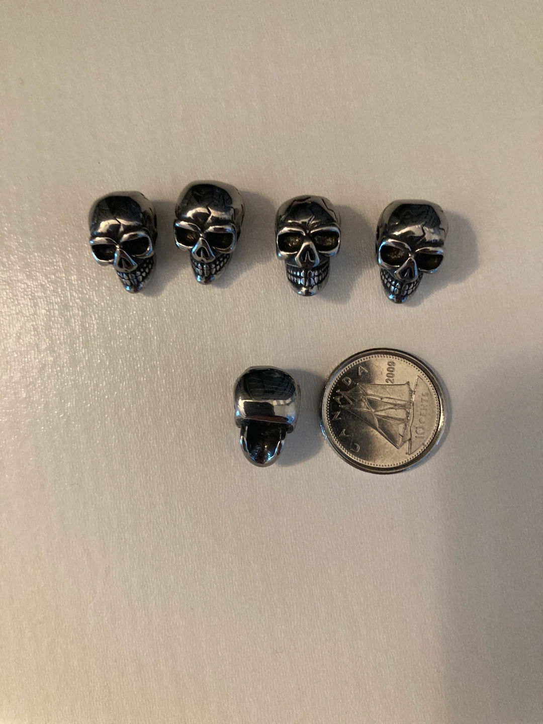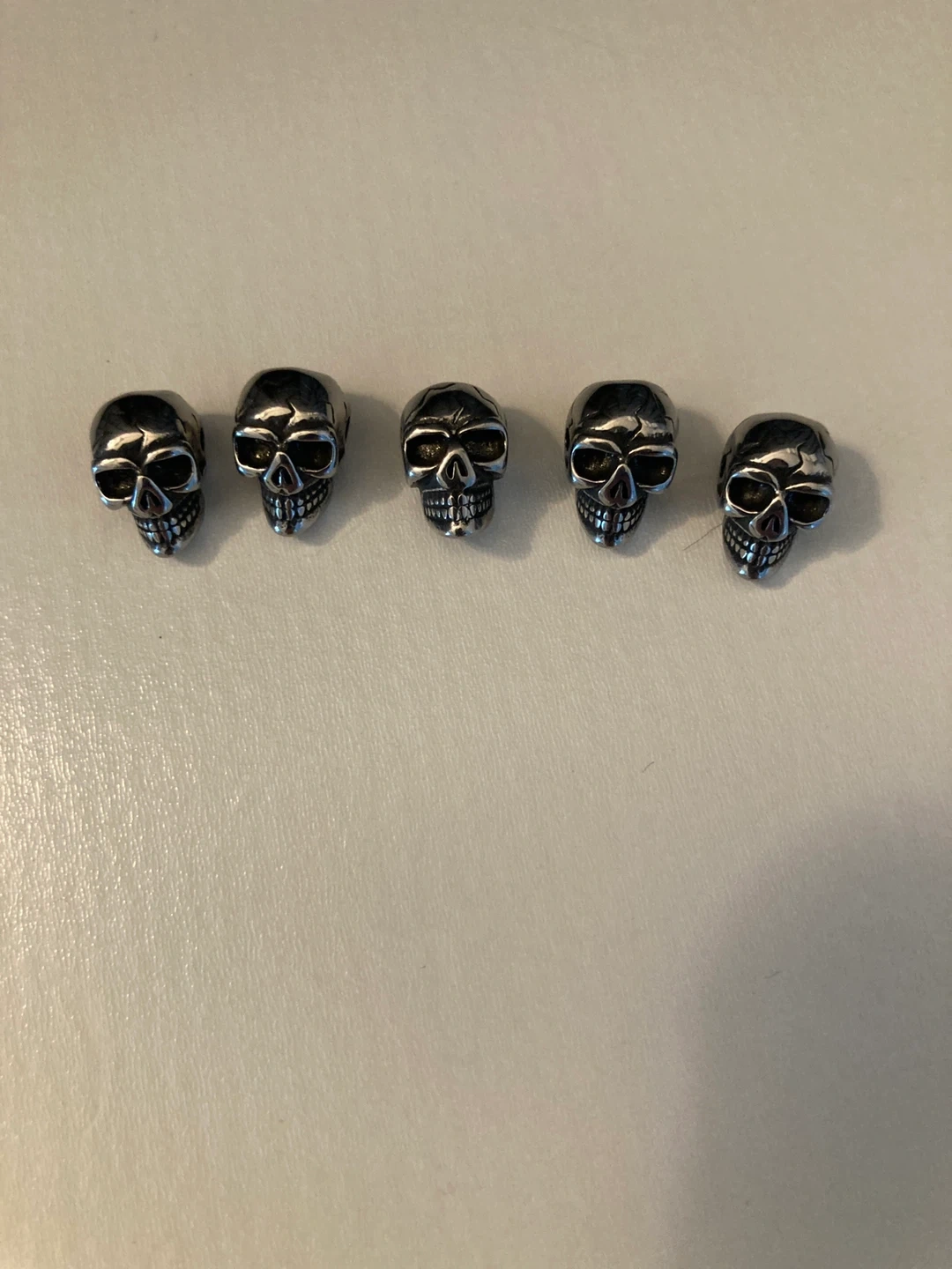 Set of 5 silver-tone skull charms. Each charm is approximately 1.5cm tall. They're great for DIY jewellery making or customizing accessories!