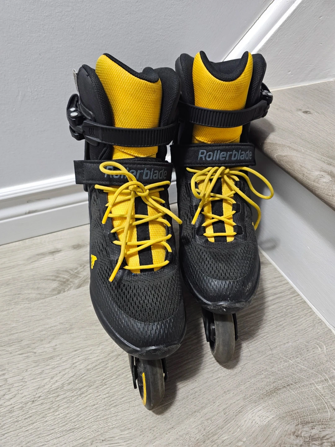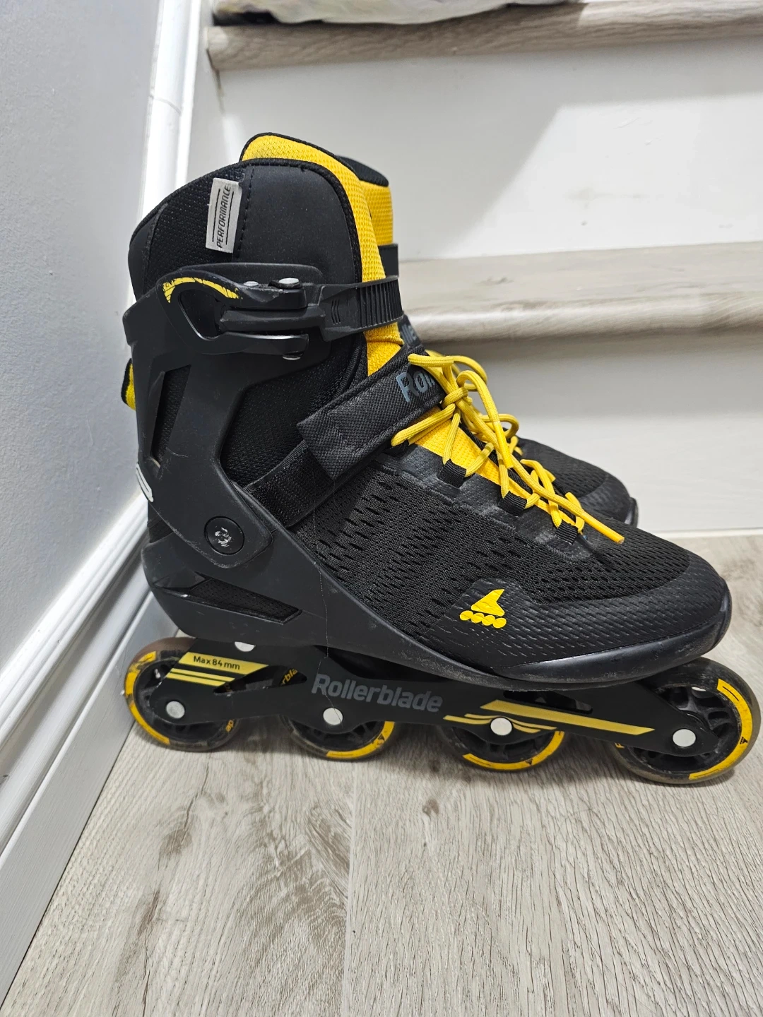 These Rollerblade Spark 80 inline skates are black with yellow accents. They feature a durable shell and secure lacing system. Max wheel size is 84mm. They're great for recreational skating! One strap has a tear but doesn't affect the performance. Price negotiable. 😊