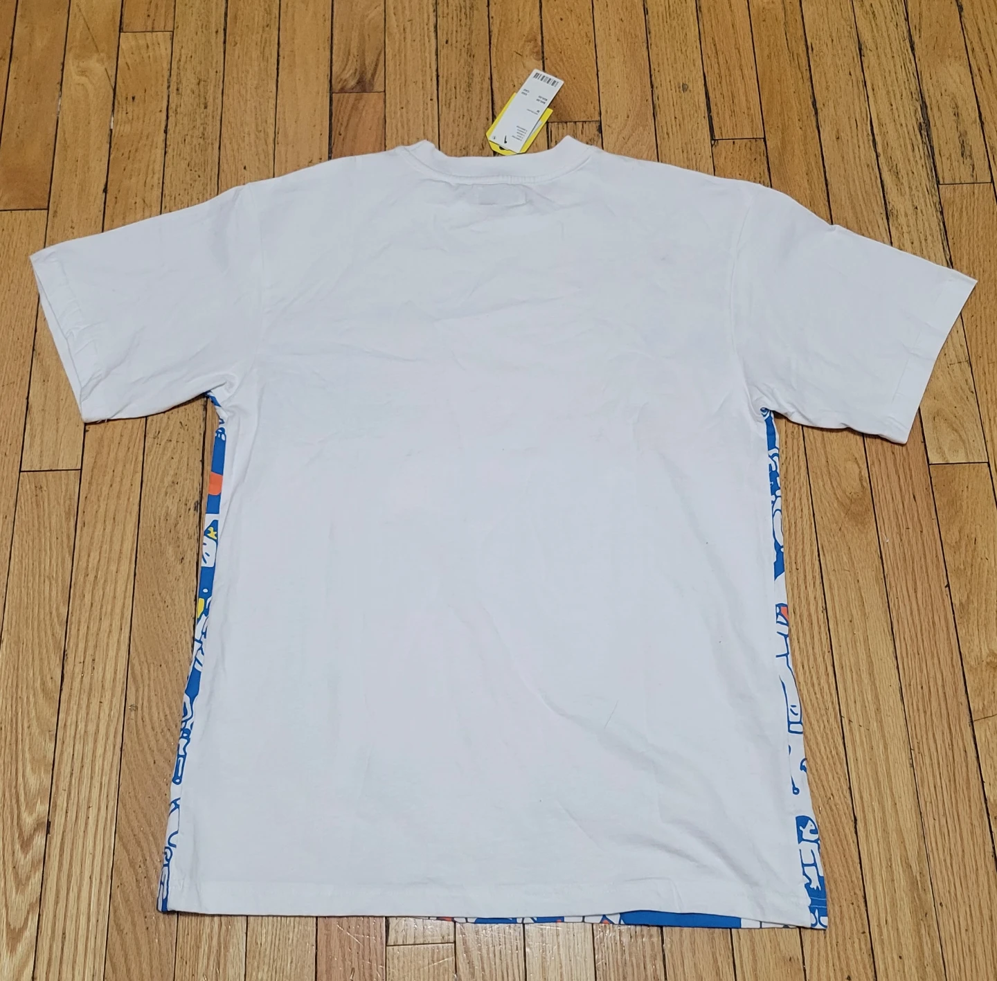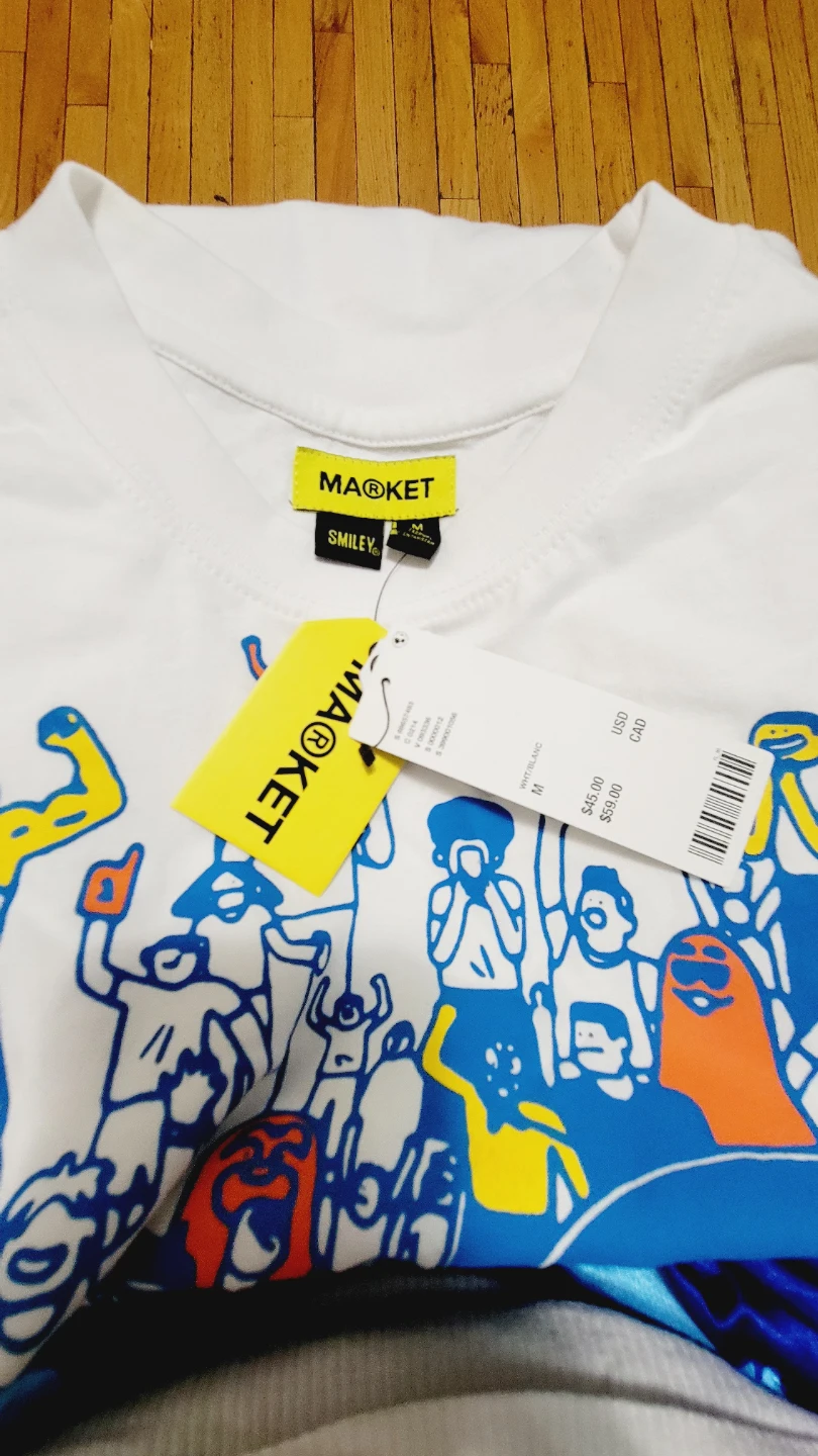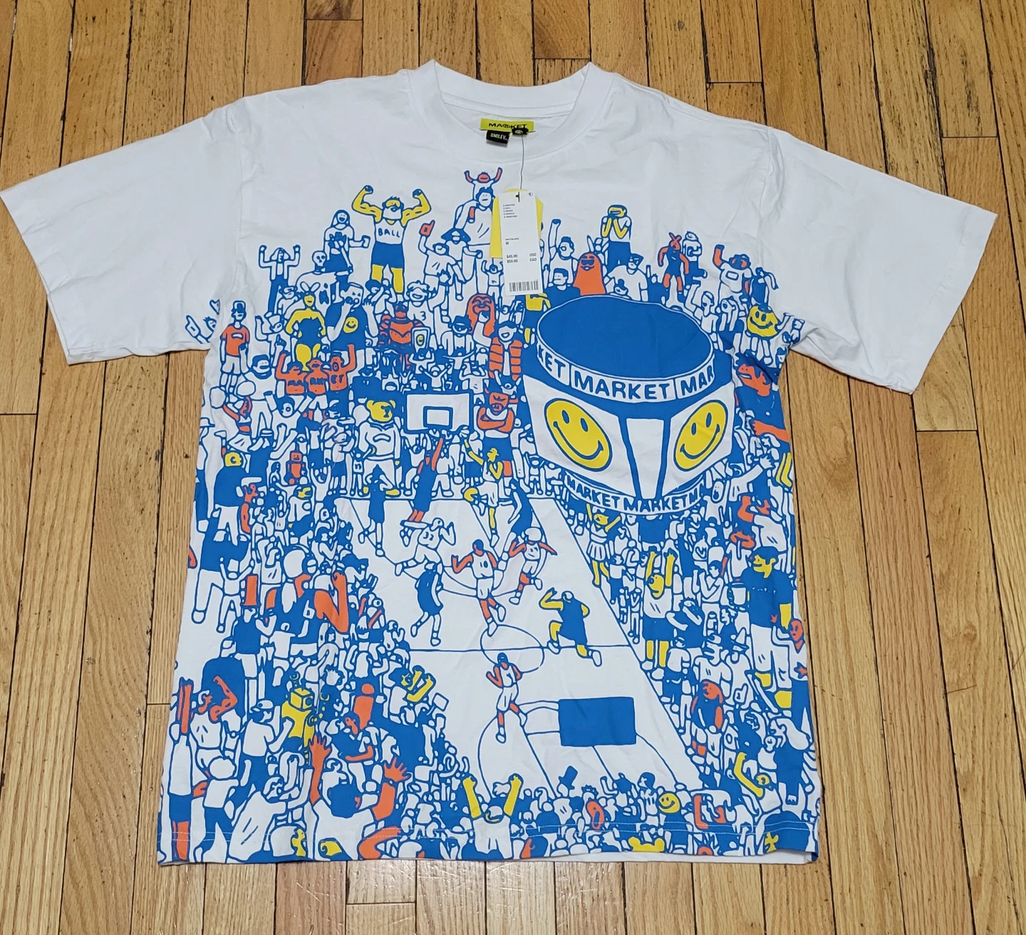 This is a MARKET brand white t-shirt with a graphic design featuring a basketball game and crowd. It's a size medium. The shirt is made of cotton.