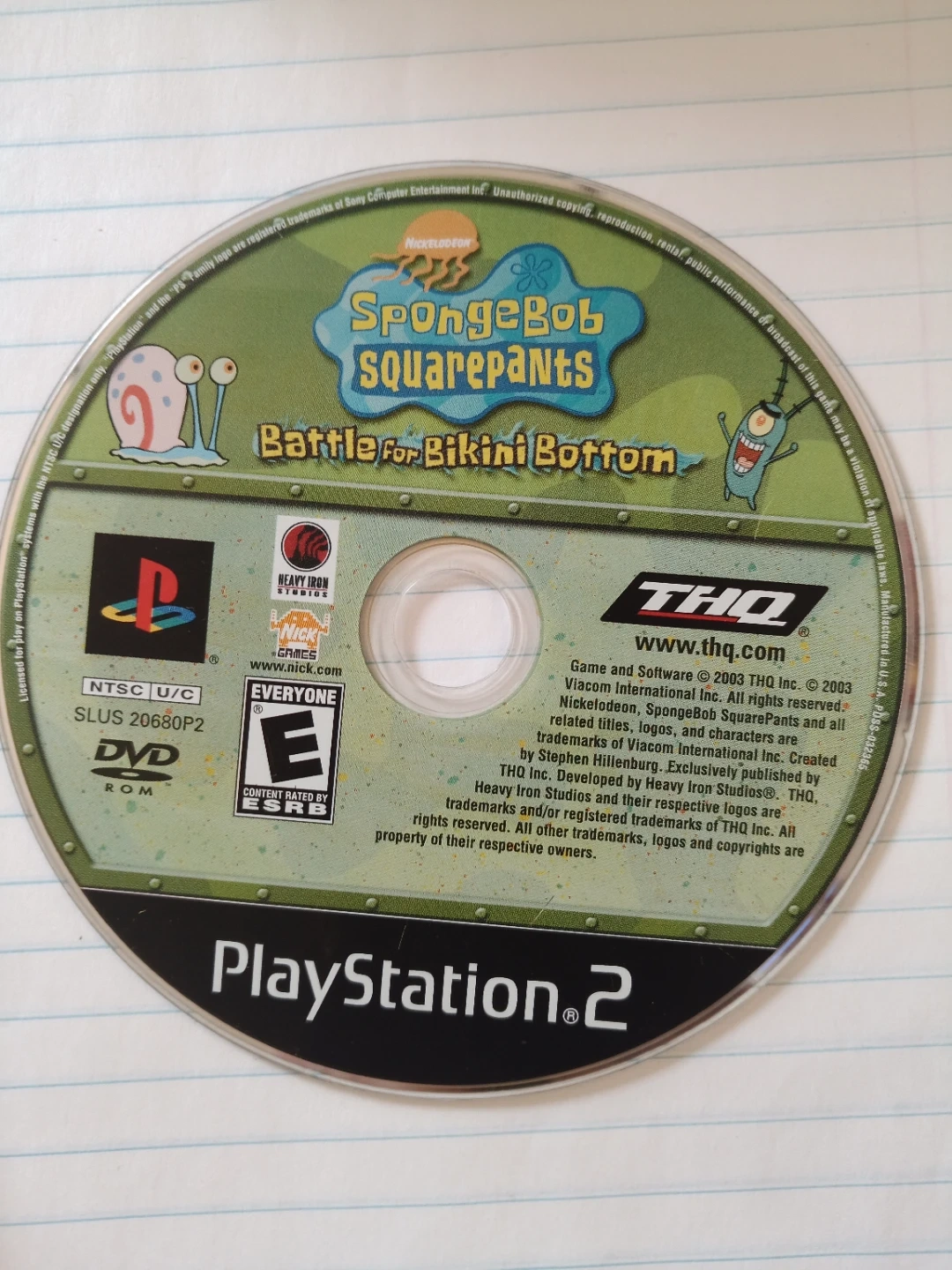 This is the PlayStation 2 game, SpongeBob SquarePants: Battle for Bikini Bottom. It's a DVD-ROM game rated E for Everyone. Developed by Heavy Iron Studios.