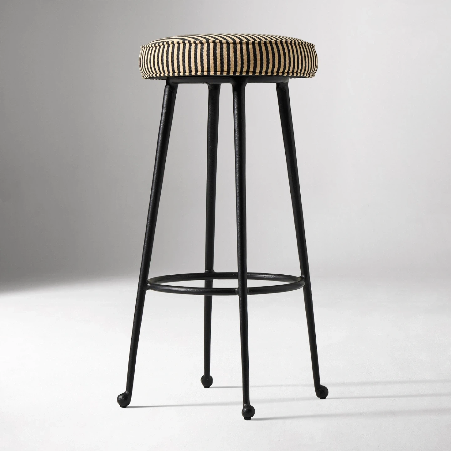 This bar stool features a comfortable, padded seat with a black and beige stripe pattern. Its metal frame is black and has a circular footrest. A great addition to any kitchen or bar area!