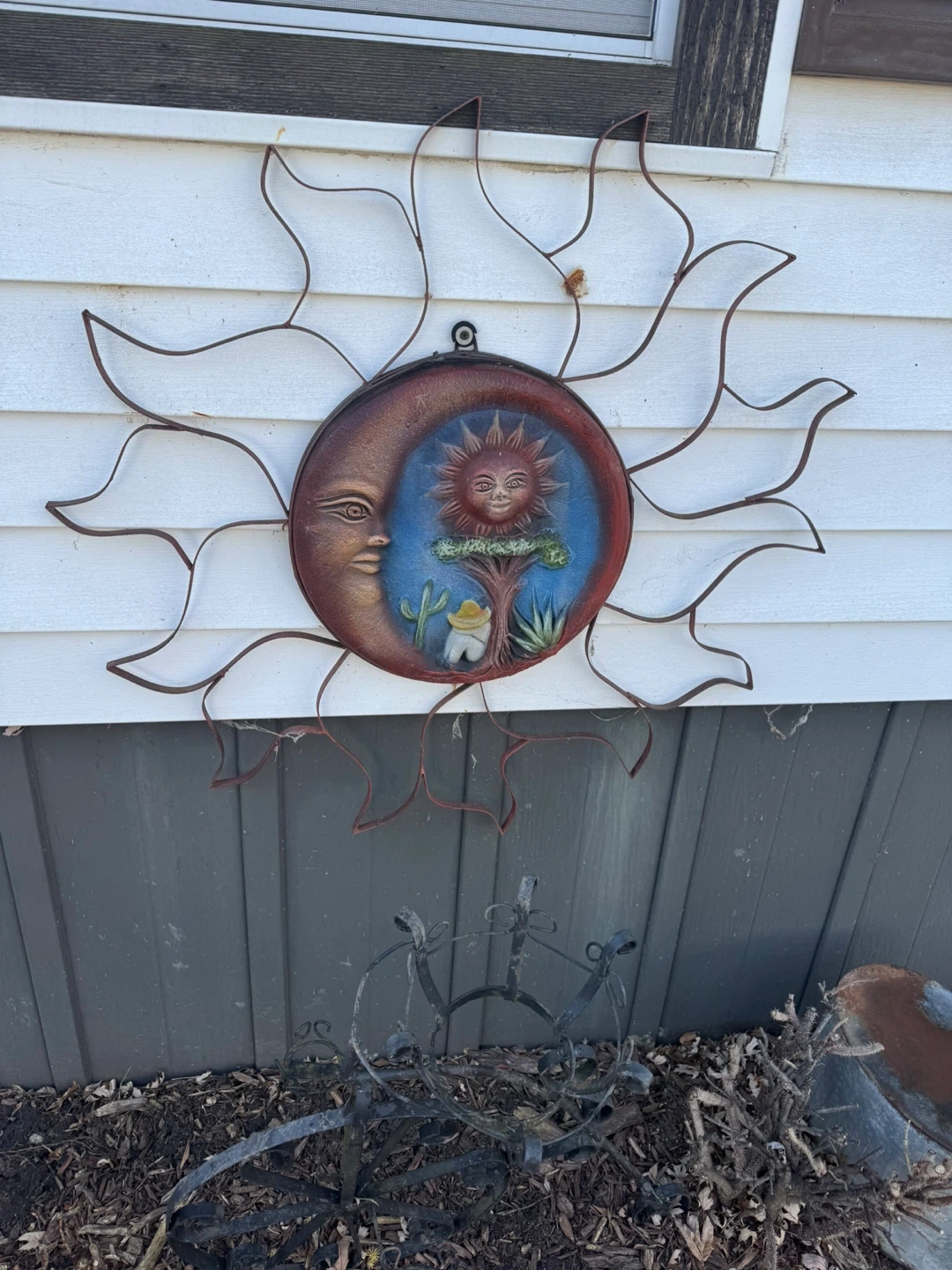Unique metal wall art featuring a sun and moon design with a celestial scene. It's made of painted metal with wire accents. This piece is great for adding character to an outdoor space!