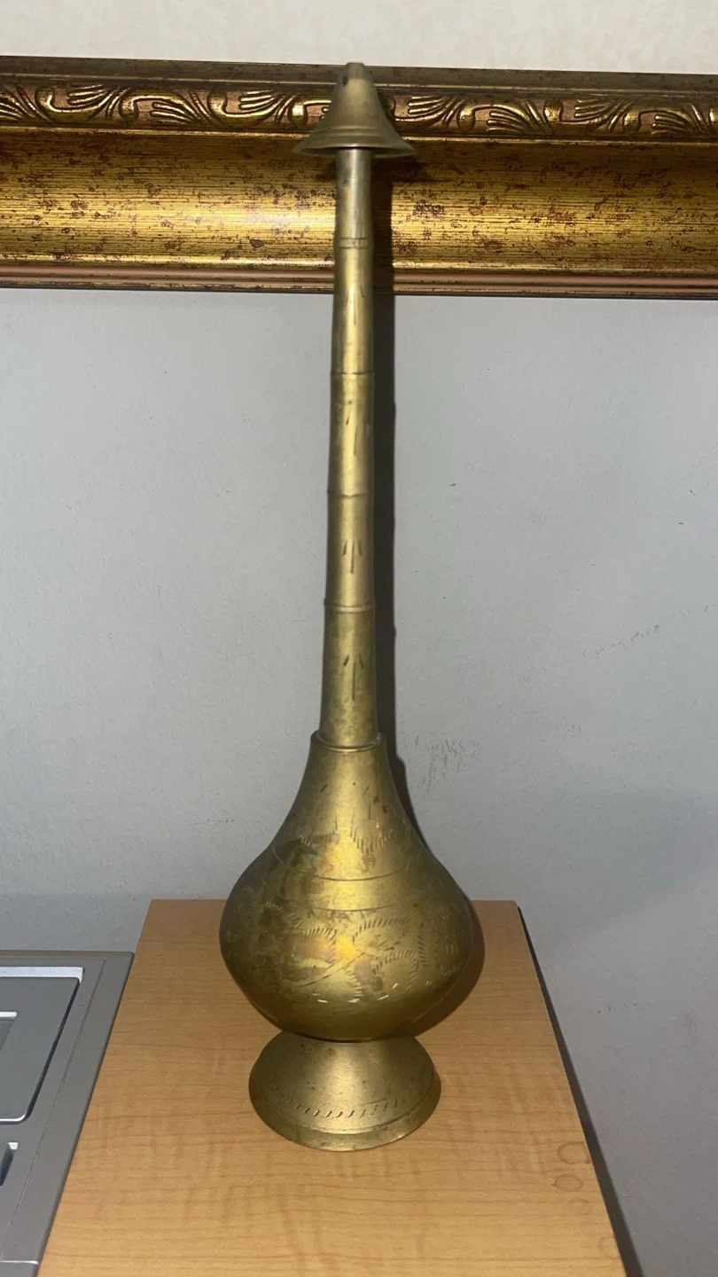 This is a vintage brass vase with an etched floral design. It has a tall, slender neck and a bulbous base. It's likely decorative or could be used as a unique water pitcher. Measures approximately 15 inches tall.m