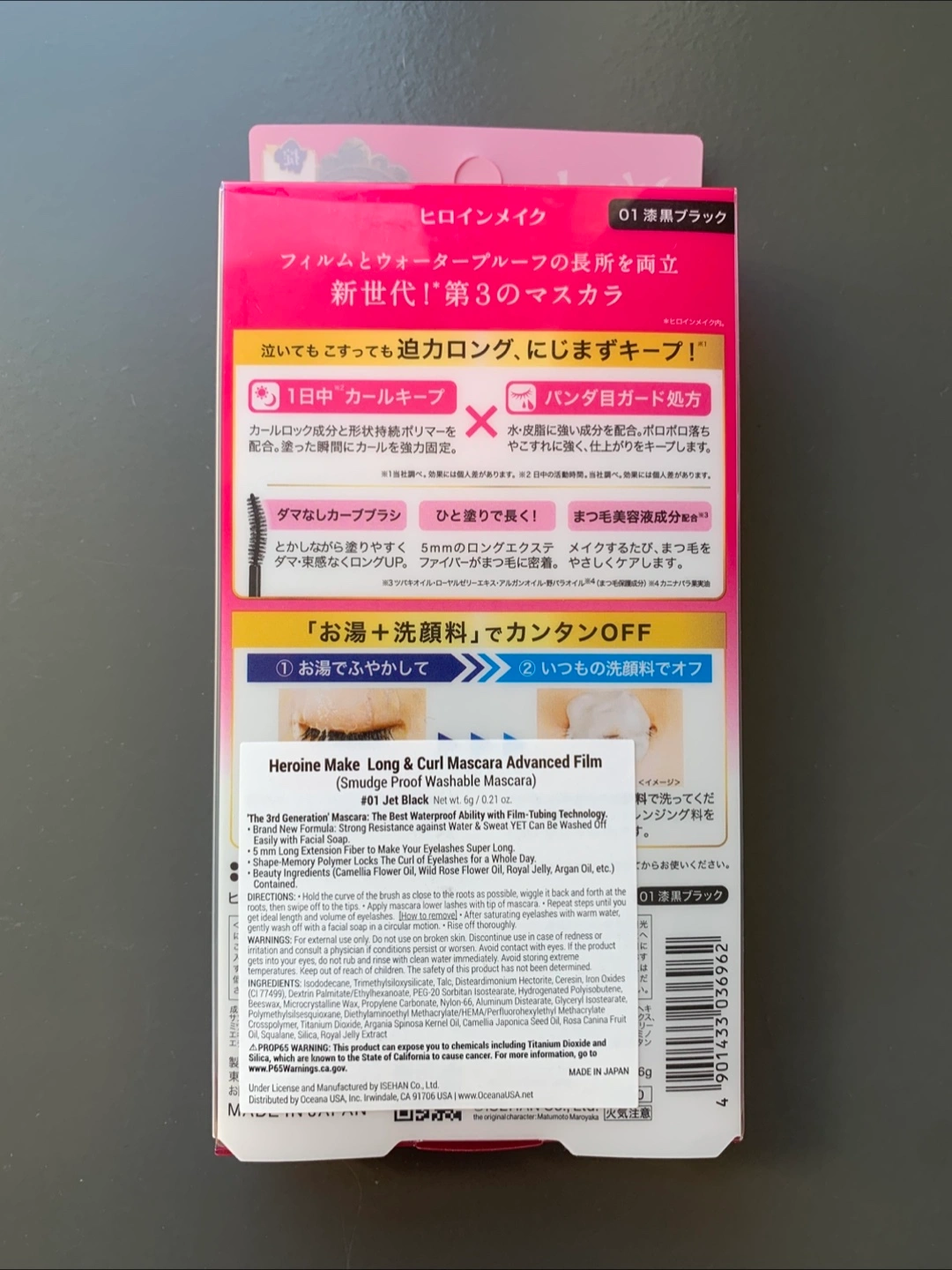 Long and curl mascara. Easy wash-off formula. Smudge proof and washable. Jet Black color.