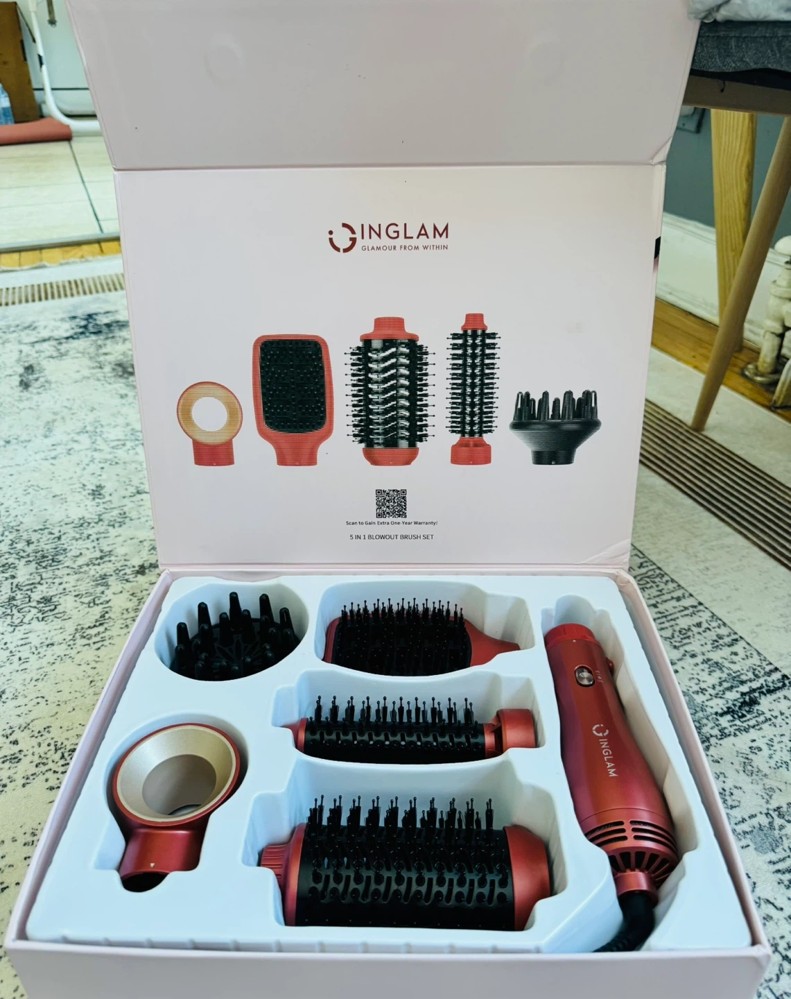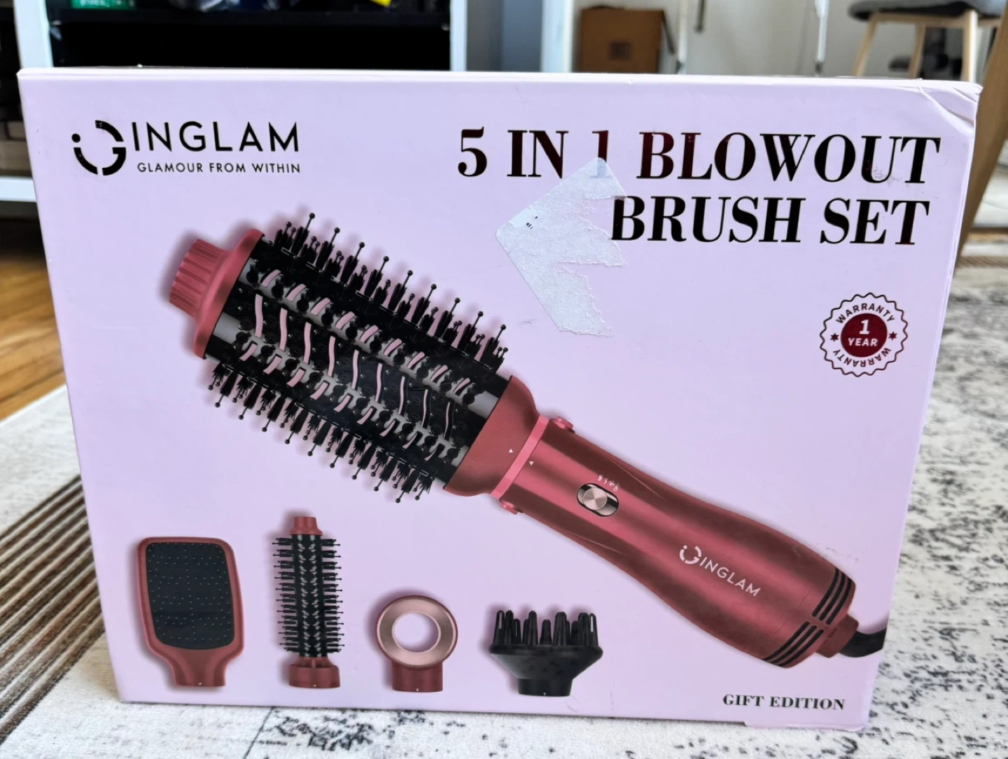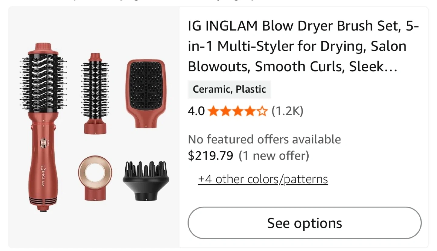 This is an INGLAM 5-in-1 blow dryer brush set. It includes multiple attachments for drying, salon blowouts, and styling smooth curls. Made with ceramic and plastic components.Amazonr price 217 dolar+Tax