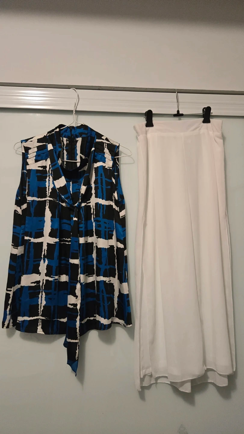 This set includes a sleeveless blouse with a blue, black, and white abstract print and a tie neck detail. It's paired with white wide-leg pants. Great for a stylish casual or dressy look!
