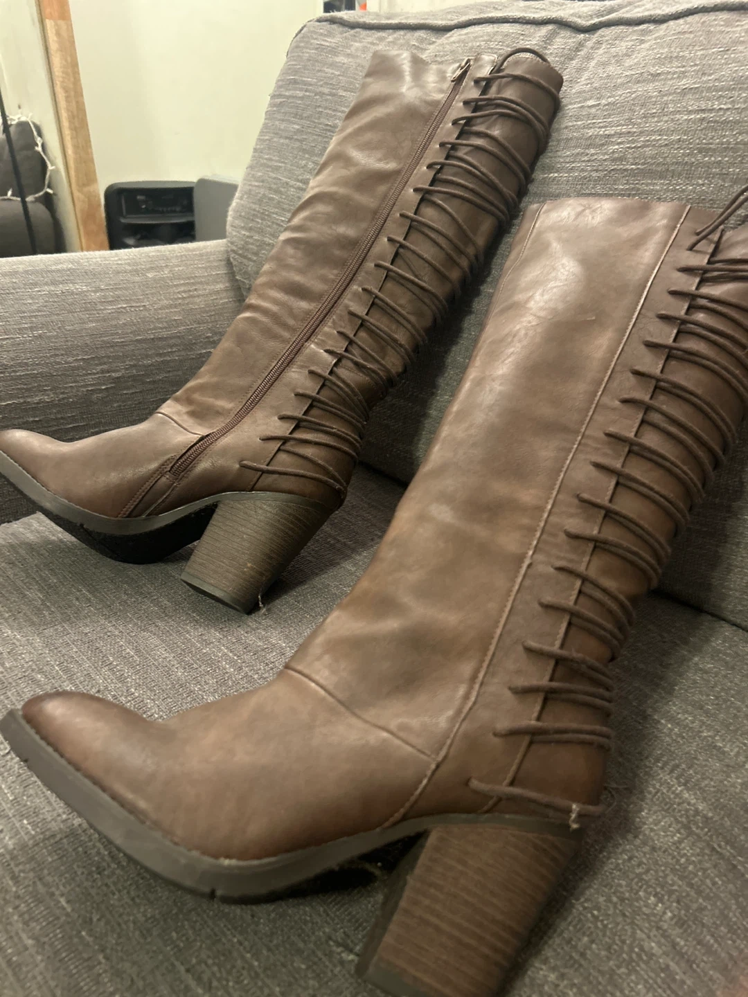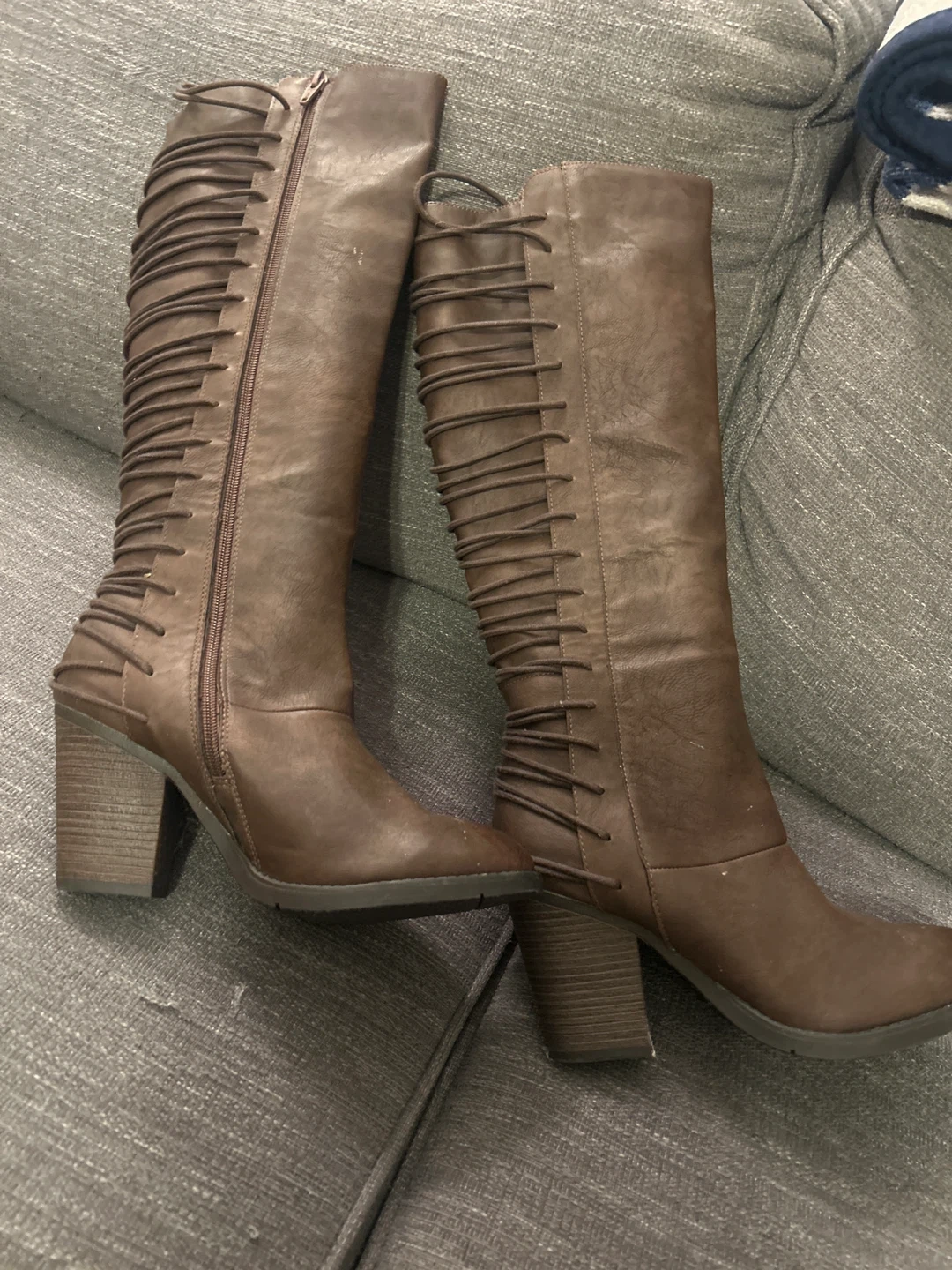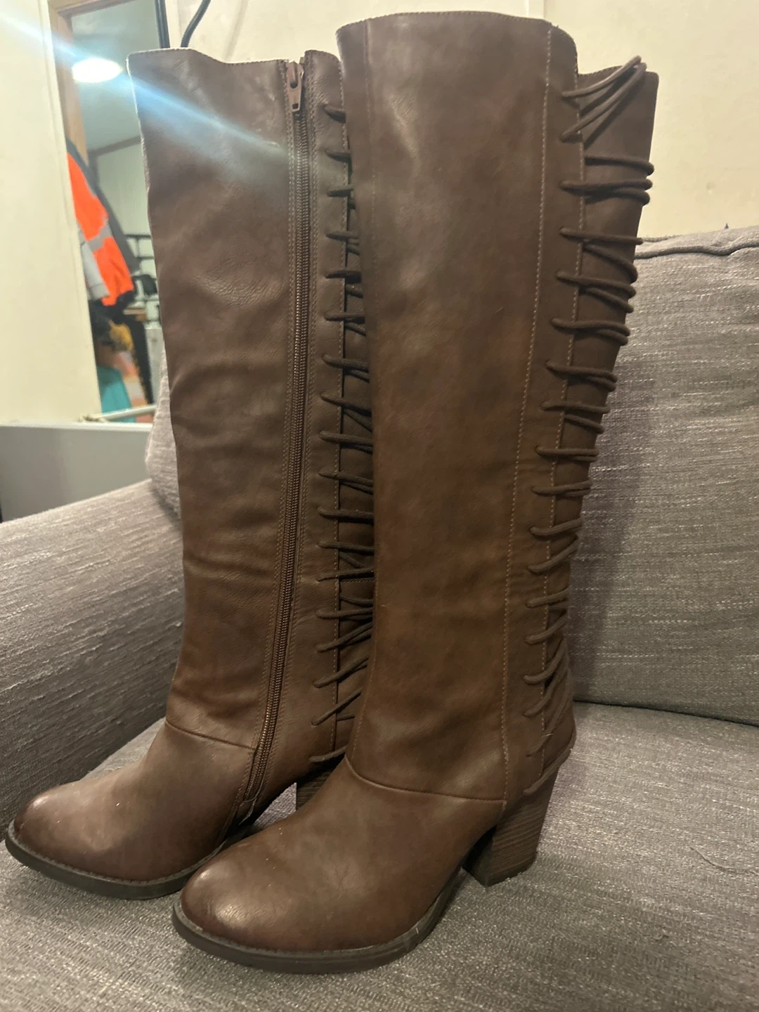 Stylish brown faux leather knee-high boots with a side zipper closure. These boots feature decorative lacing detail up the back of the shaft and a comfortable block heel. Perfect for fall and winter wear!