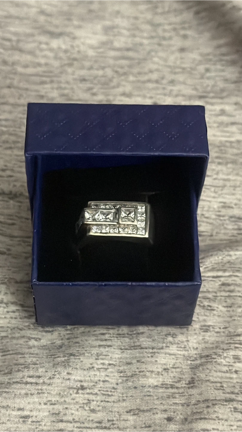 This ring features a row of square-cut stones set in a rectangular silver-tone band. It comes in a blue gift box. The band shows some subtle markings indicating it's likely silver.