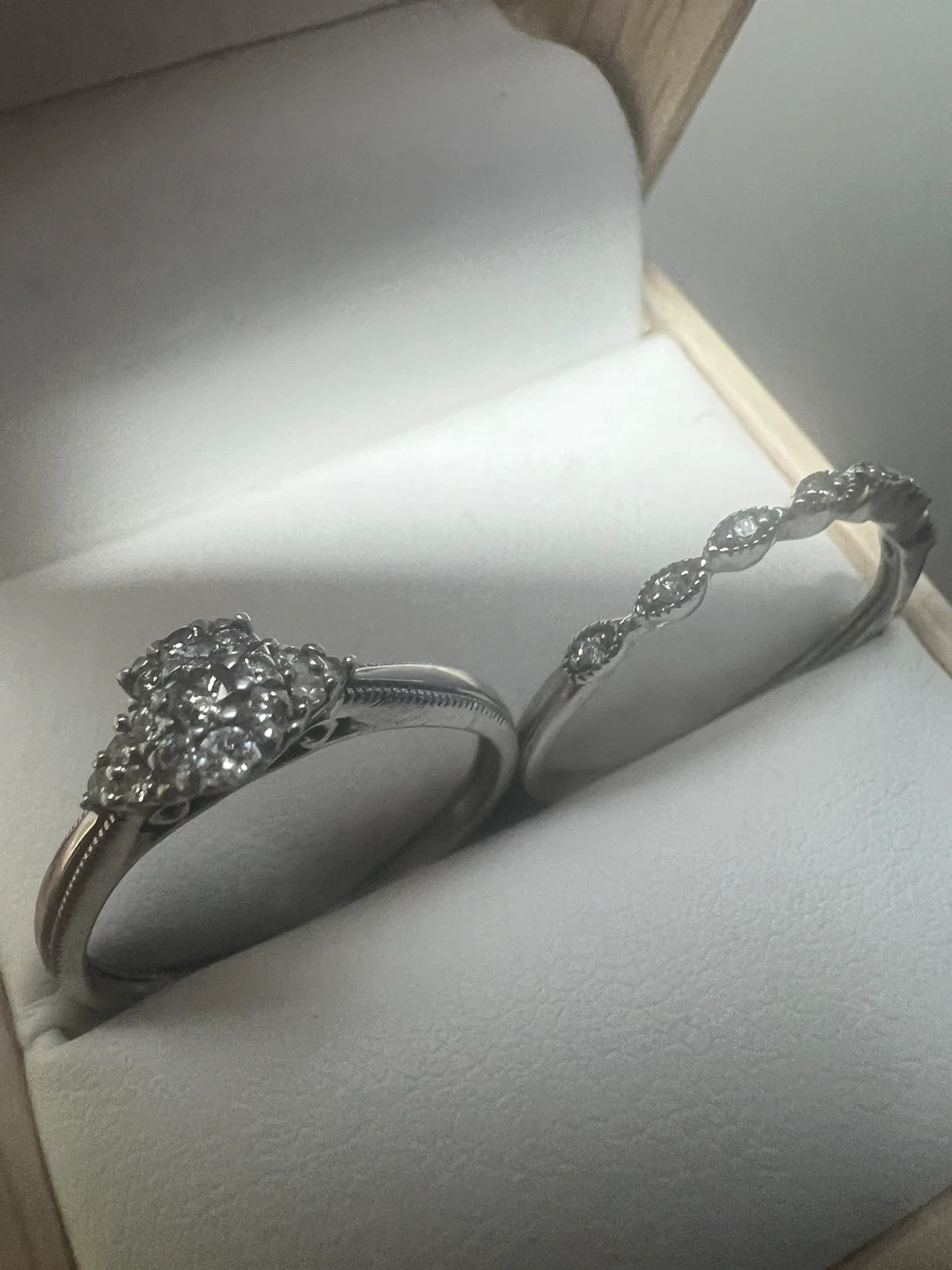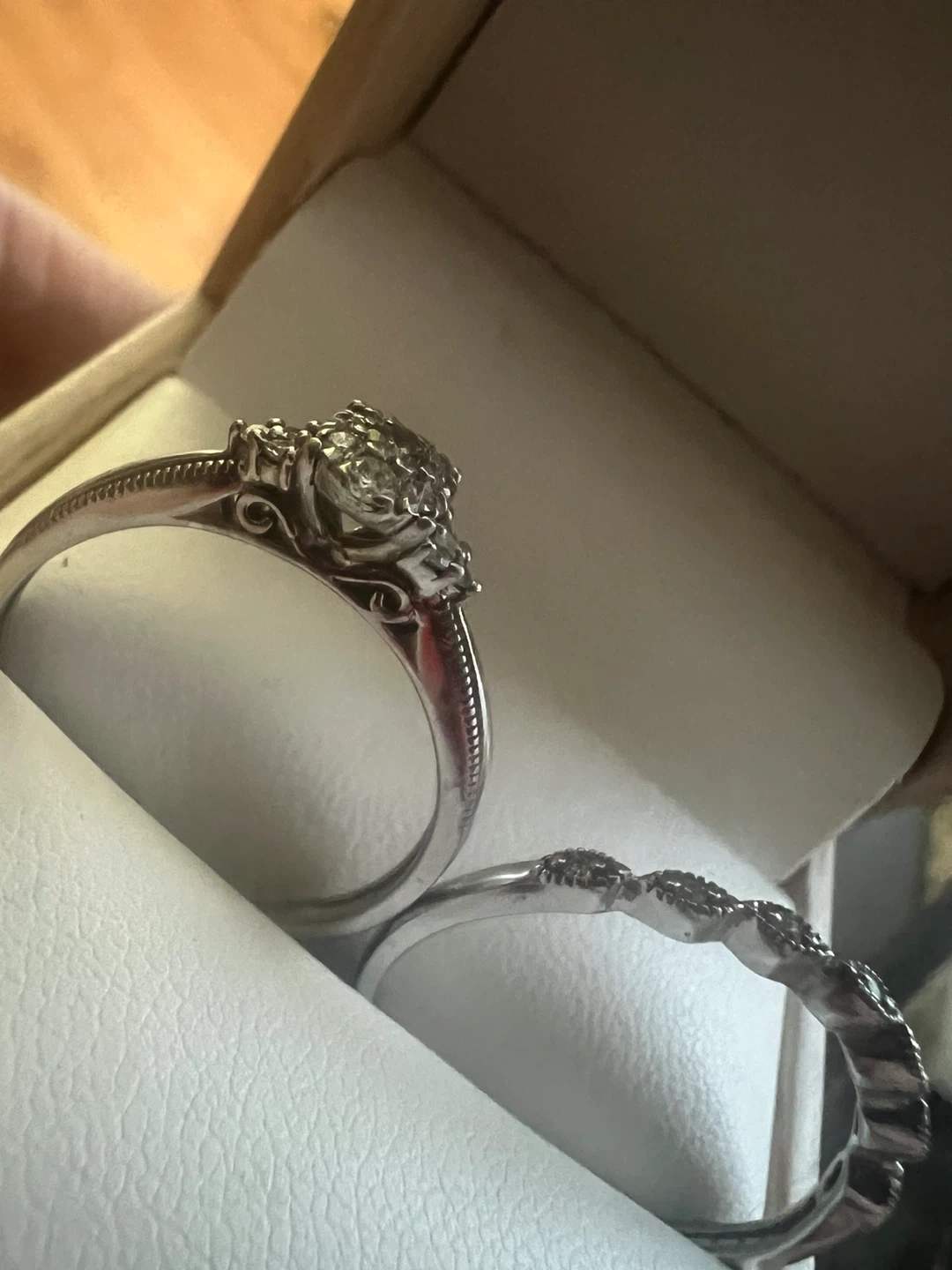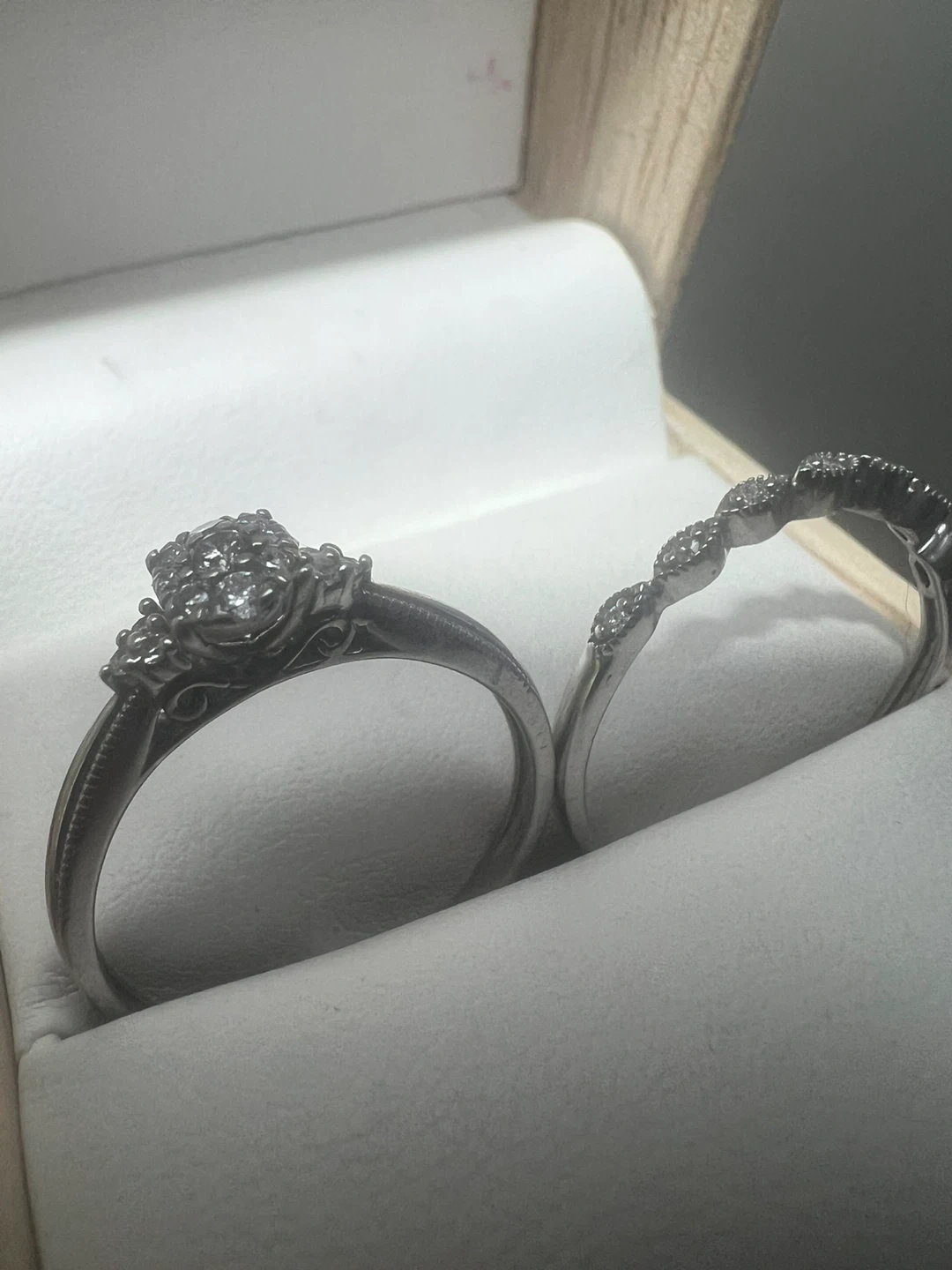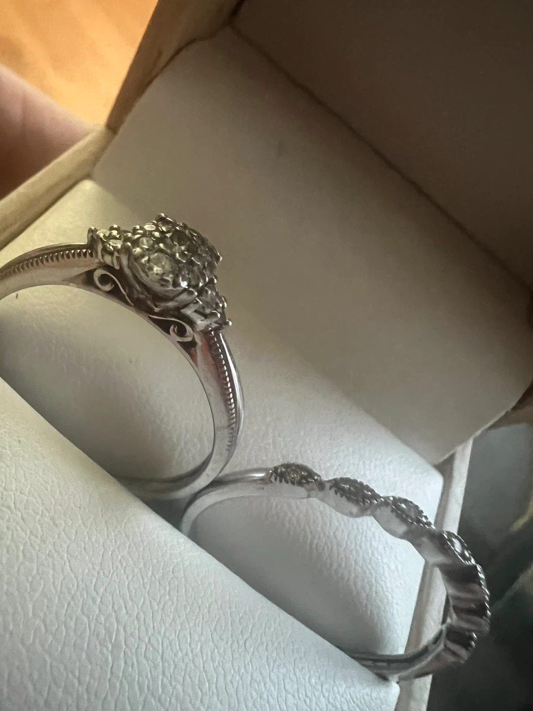 This 925 diamond engagement ring set. Both rings are white metal and feature small diamonds. They are presented in a ring box.