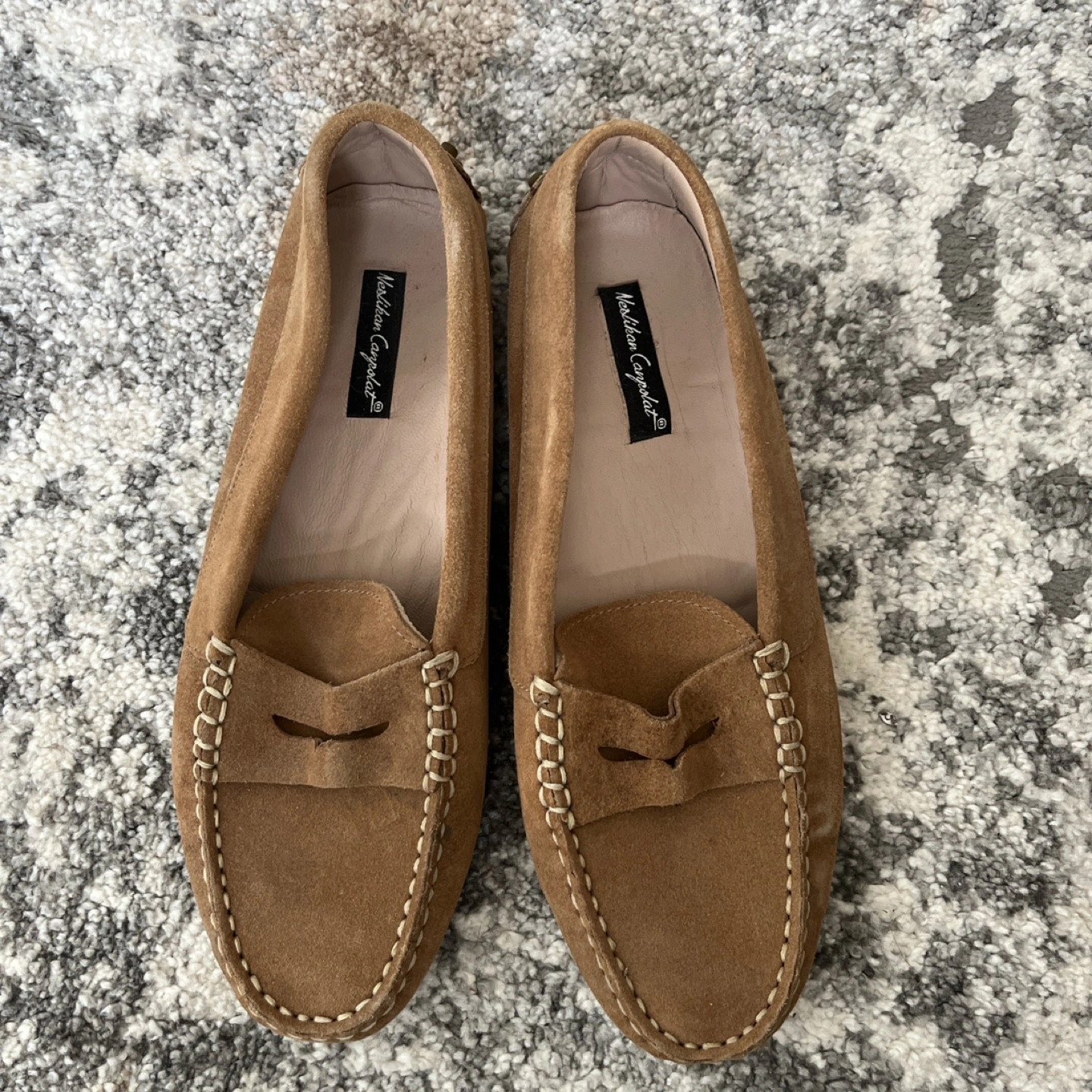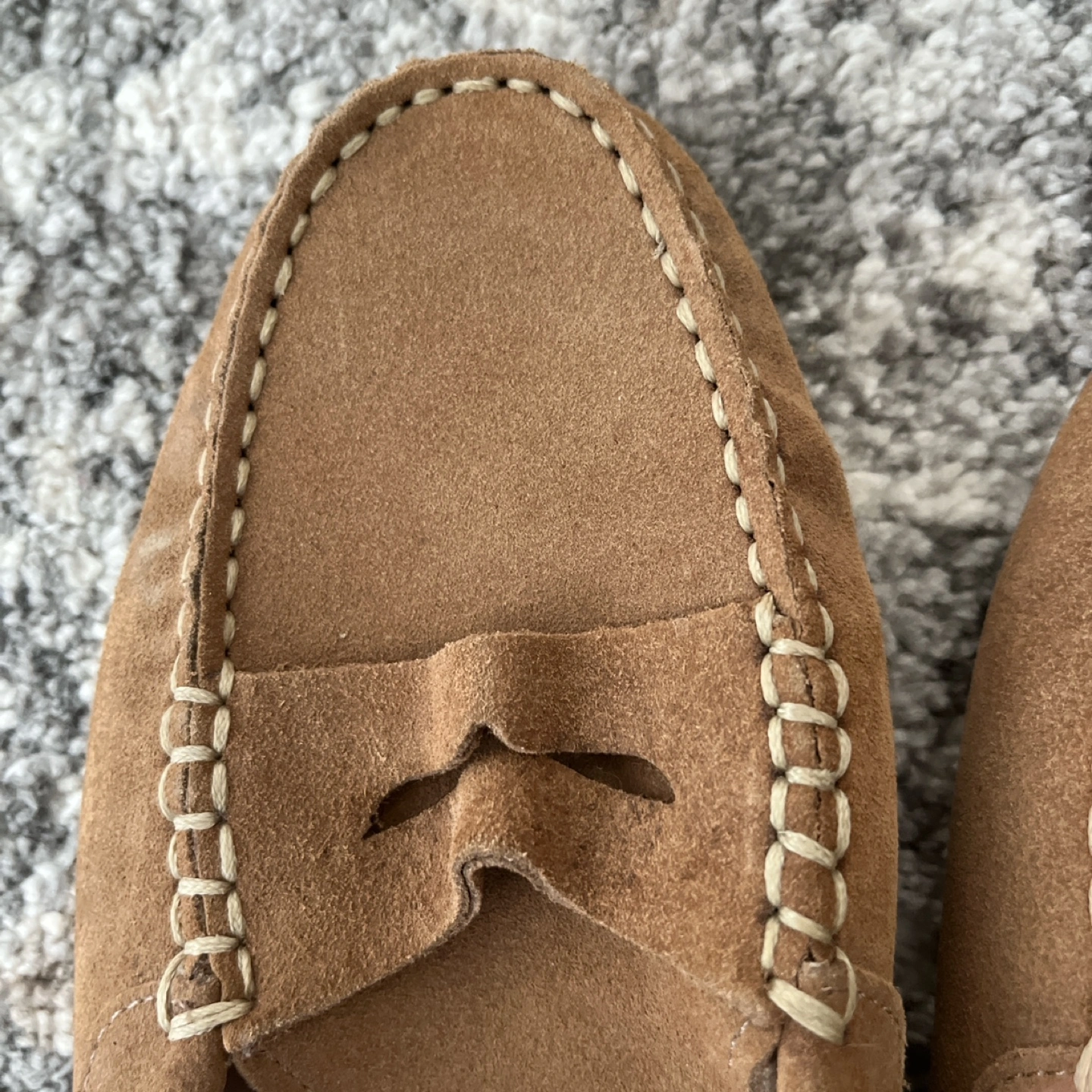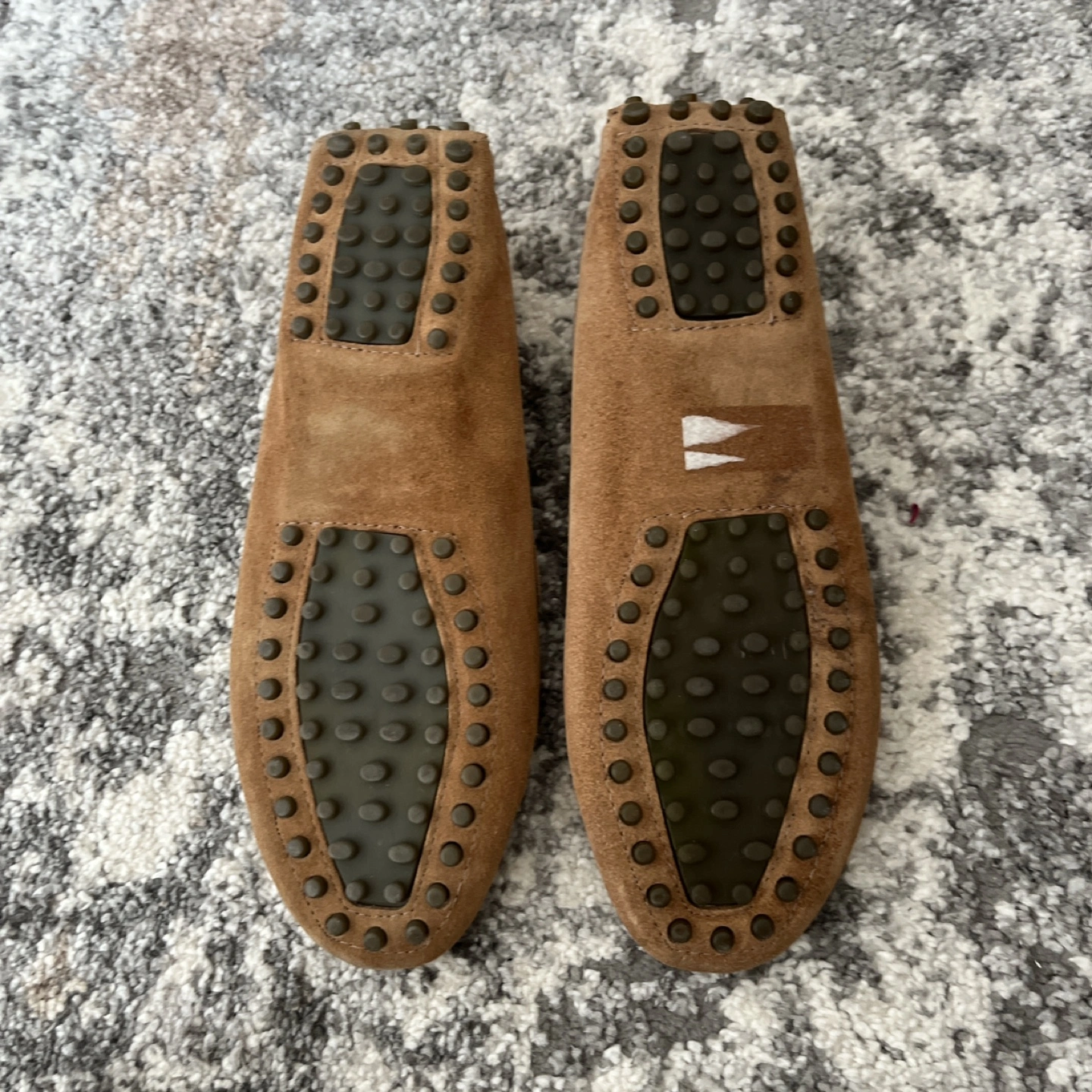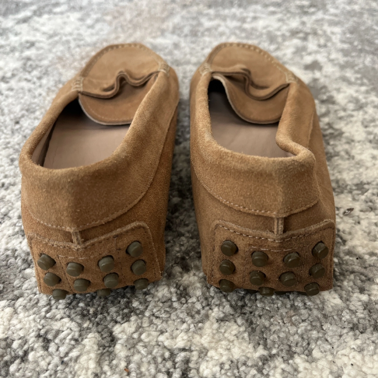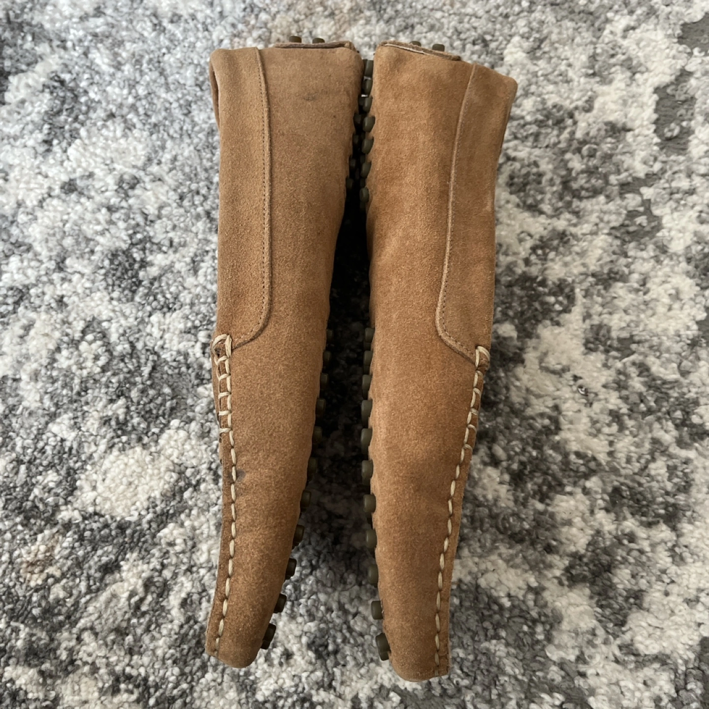 Brown suede driving loafers with a white stitched detail. The loafers have a rubber sole with small, raised bumps for grip.