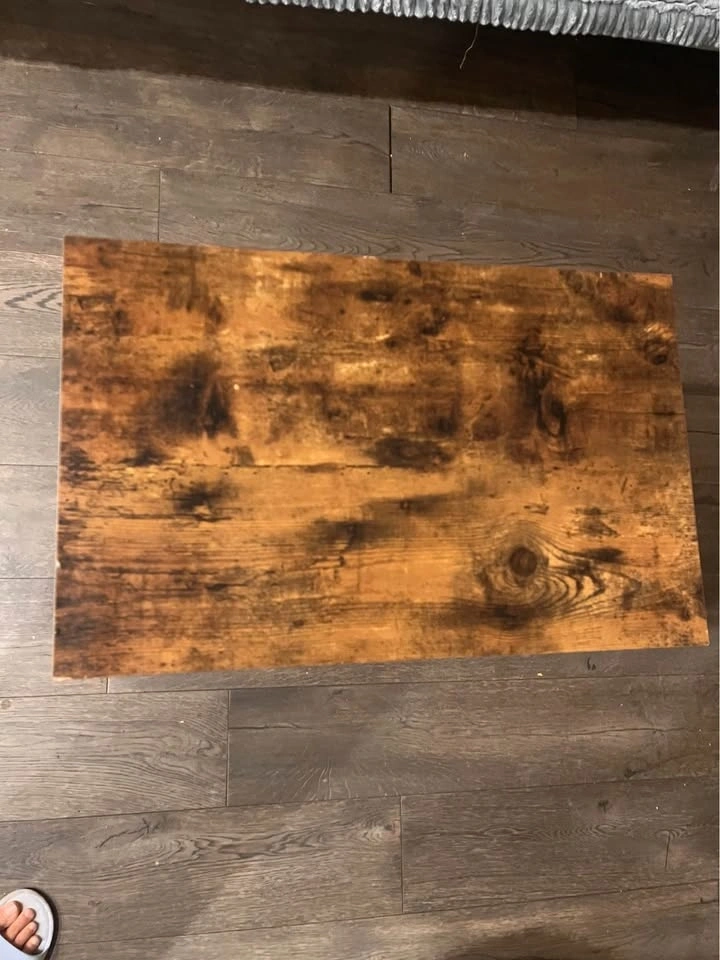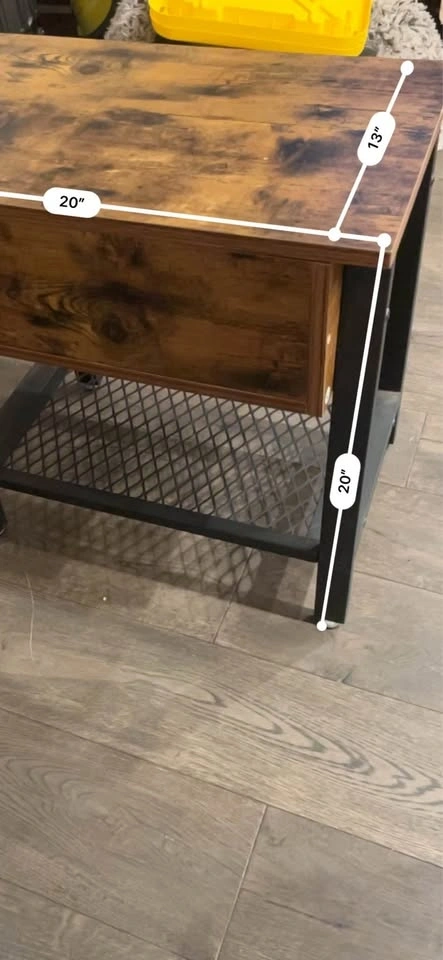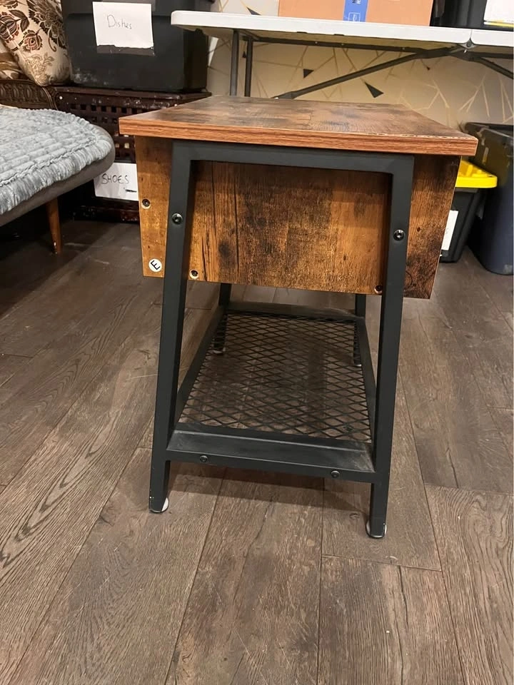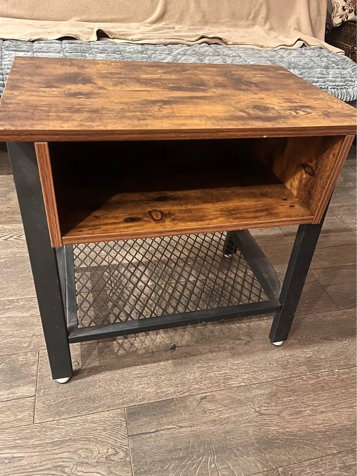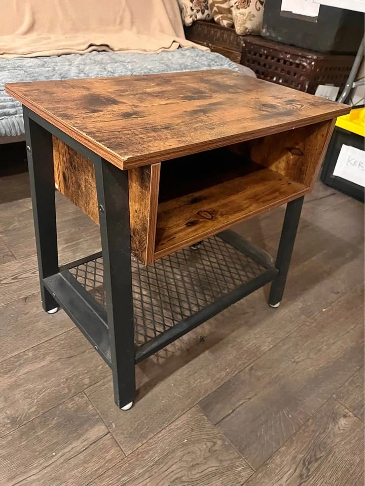 Sturdy end table with a rustic wood-look top and black metal frame. It has an open storage cubby and a metal mesh bottom shelf. Great for a bedroom or living room. Pick up Upper West Side.