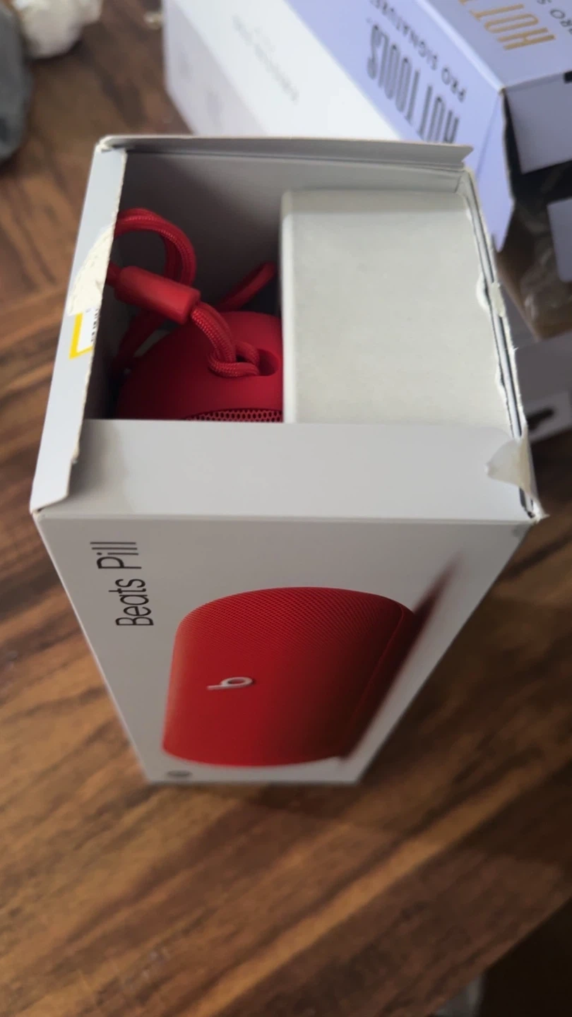 Red Beats Pill portable speaker. Includes charging cable and original box. It's a compact and powerful speaker.