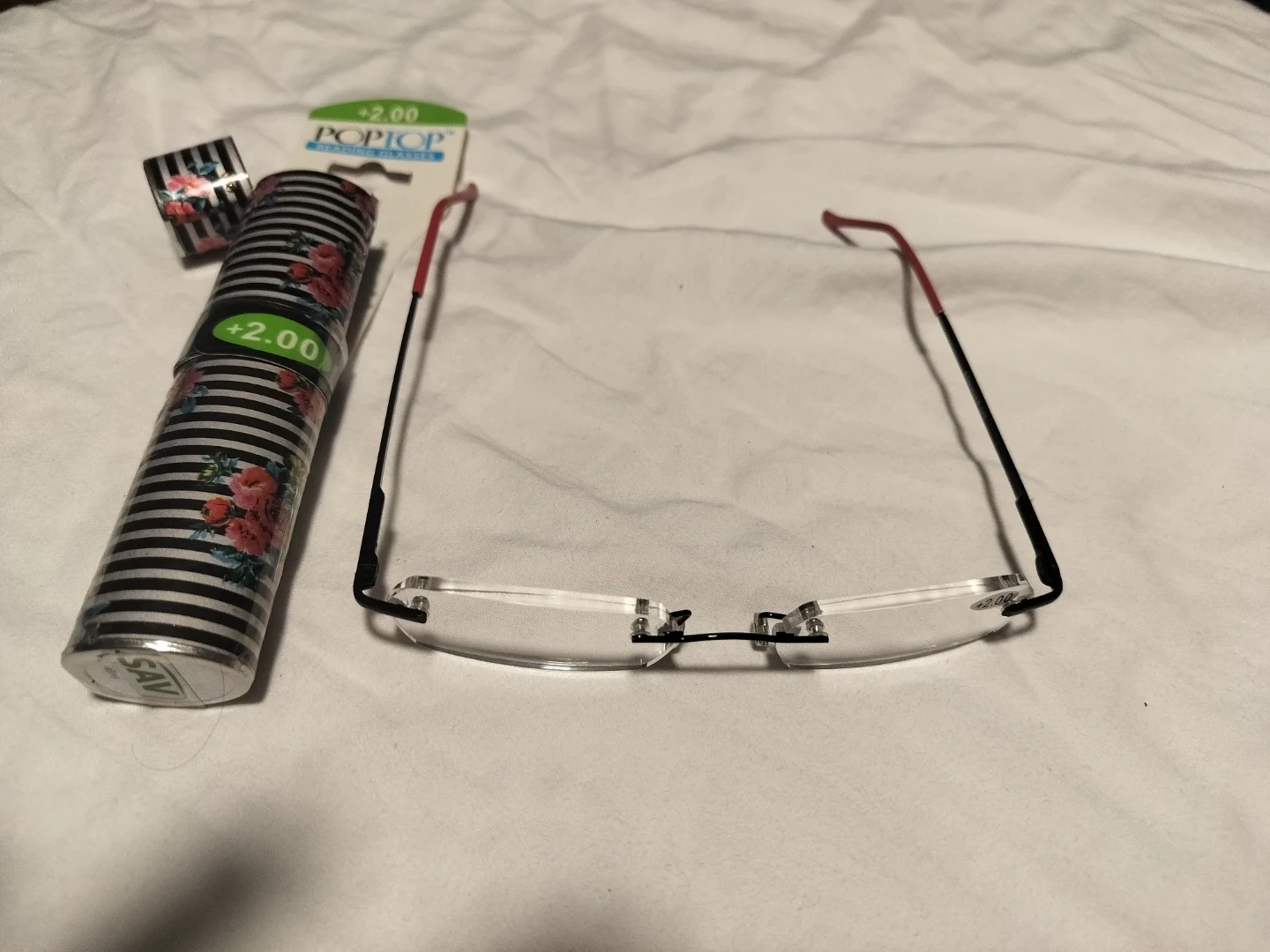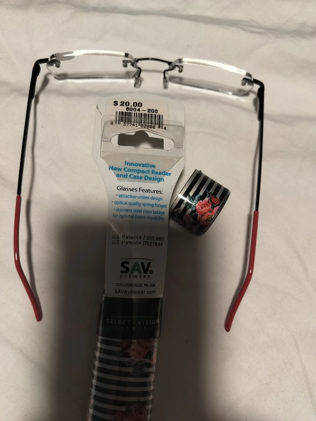 These are rimless reading glasses with a +2.00 magnification. They feature a compact, unisex design with a spring hinge. Includes a stylish striped case with floral accents for easy portability!