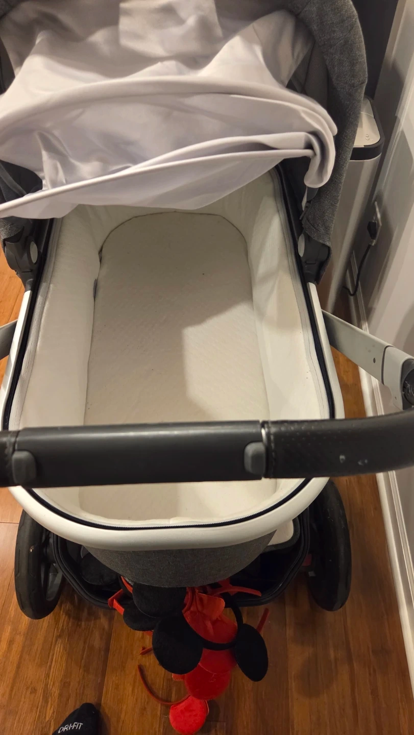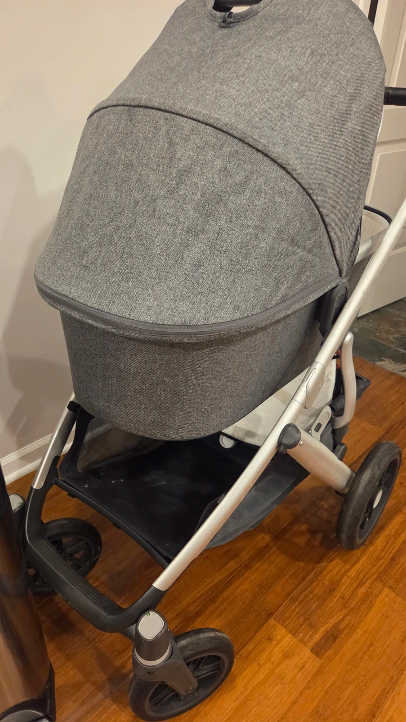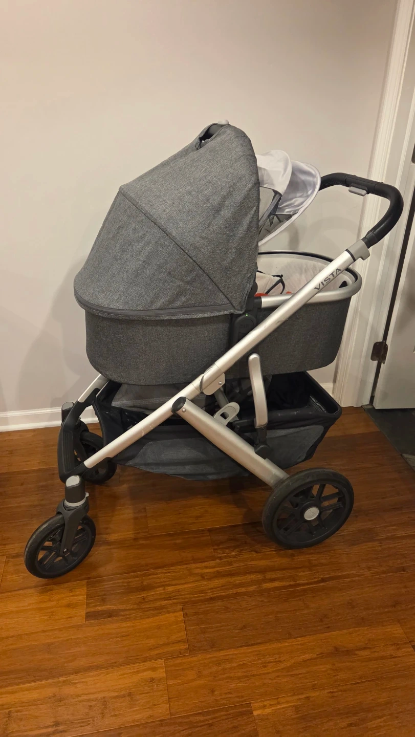 UPPAbaby Vista stroller in a heathered gray color. It's a versatile stroller with a bassinet for infants. This stroller's frame is silver.