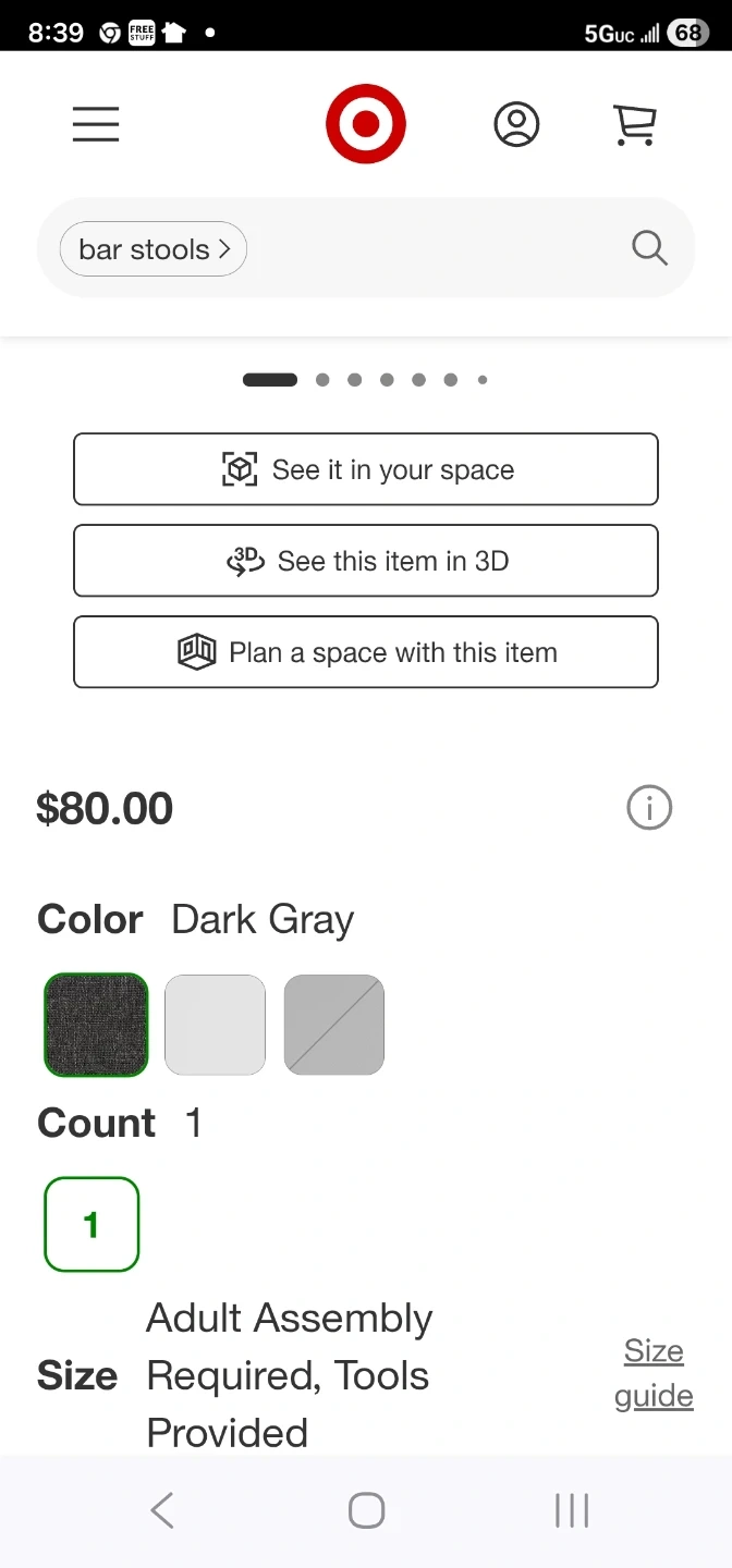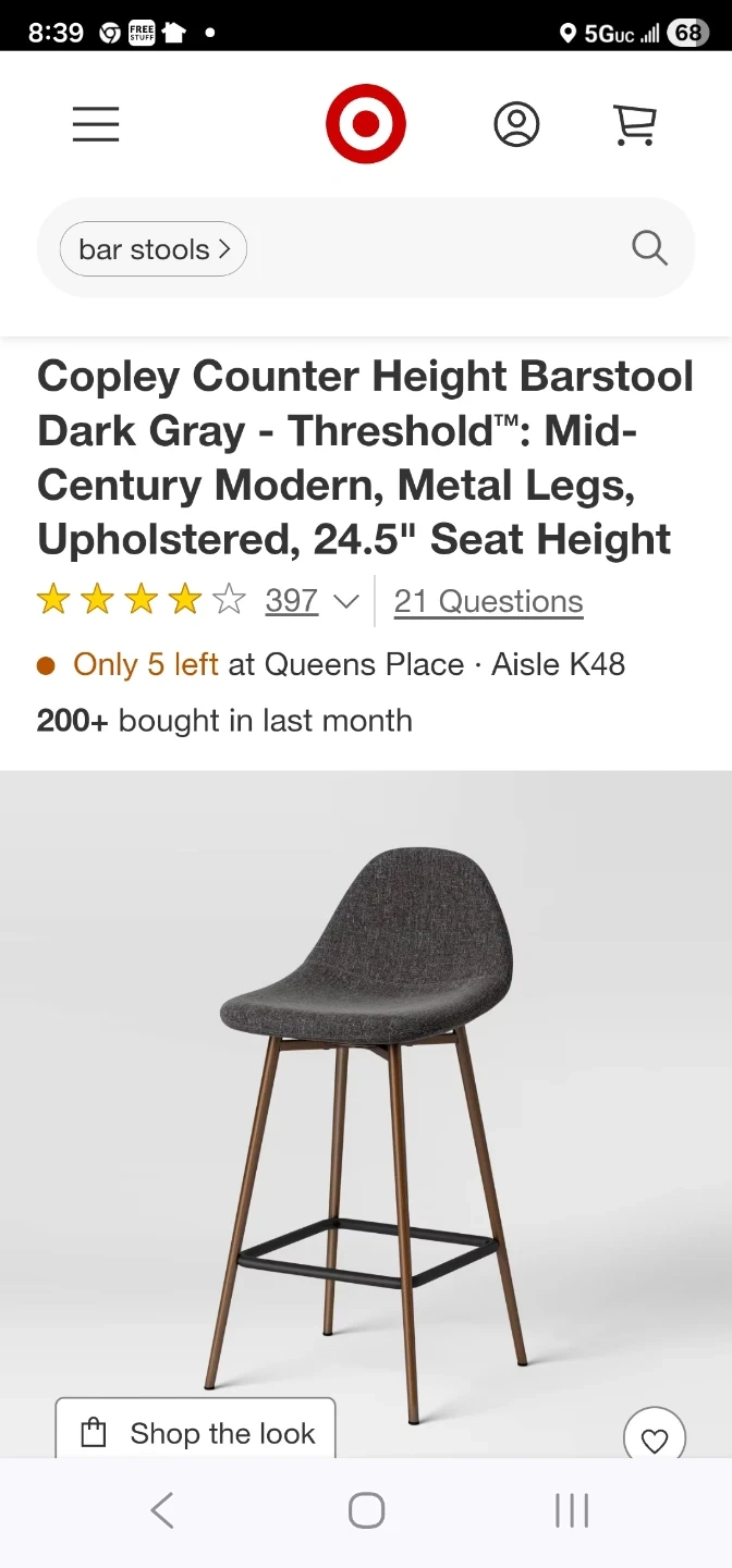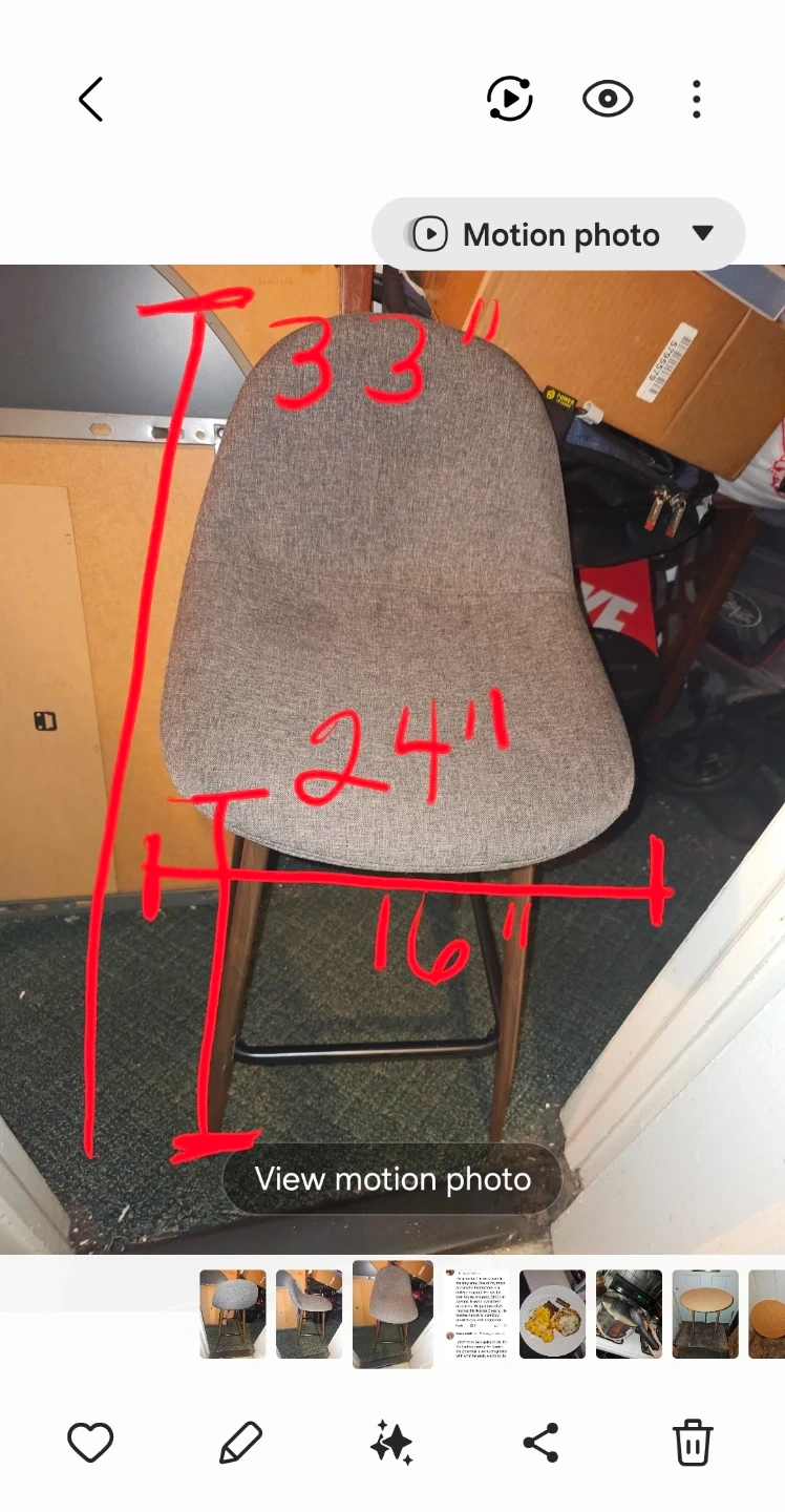 This upholstered bar stool features a gray fabric seat and walnut-finished wood legs. It's 33" tall overall, with a seat width of 16" and depth of 16". A footrest bar is included for added comfort. This stool would be great for a home bar or kitchen island.