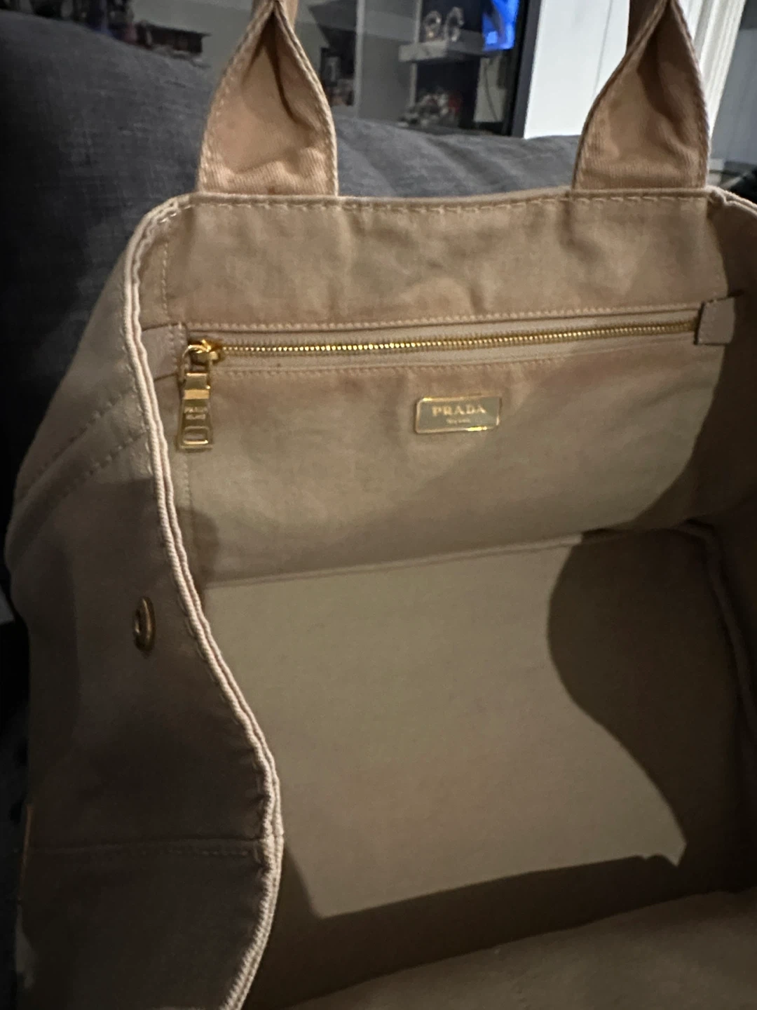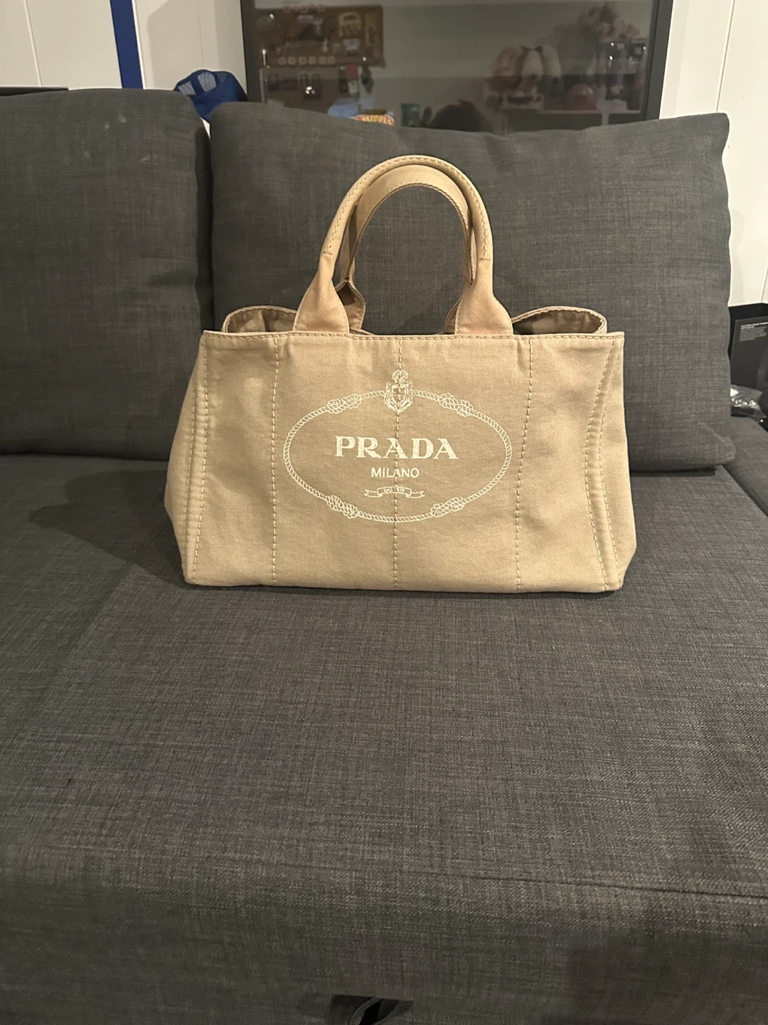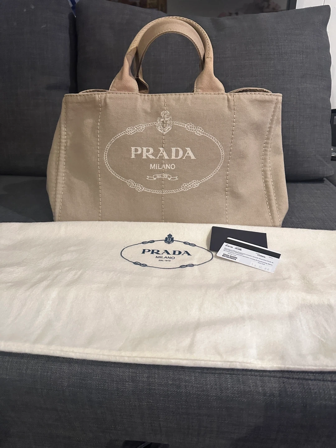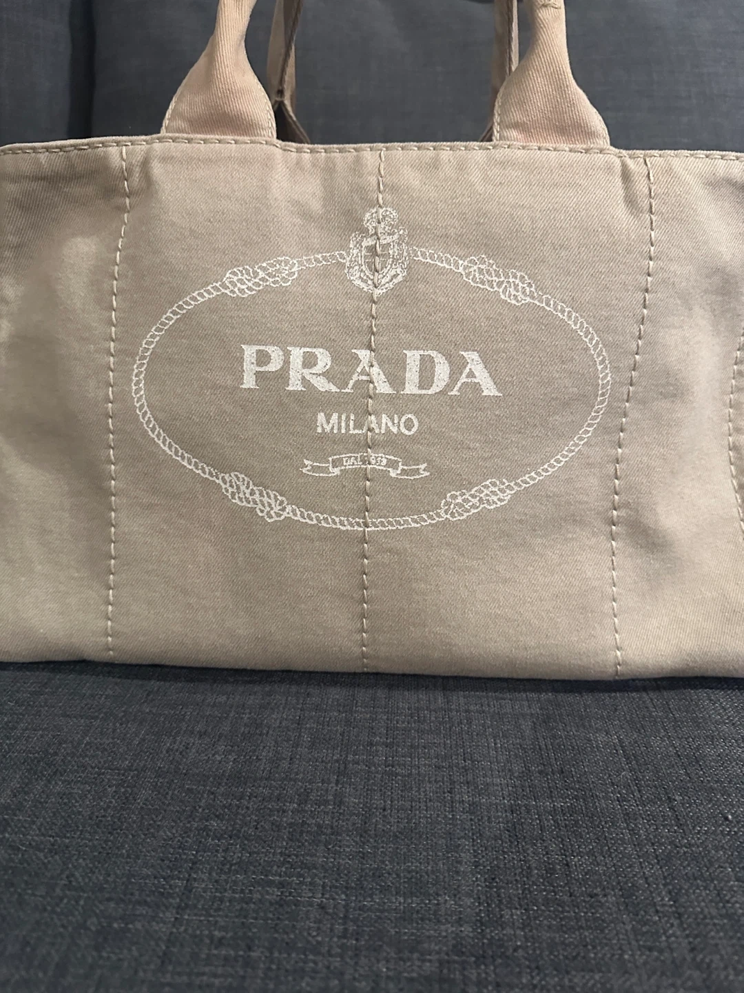 This is a stylish beige canvas tote bag from Prada. It features the iconic Prada logo printed on the front. The bag also comes with its original dust bag and authenticity card. It's a classic accessory for everyday use!