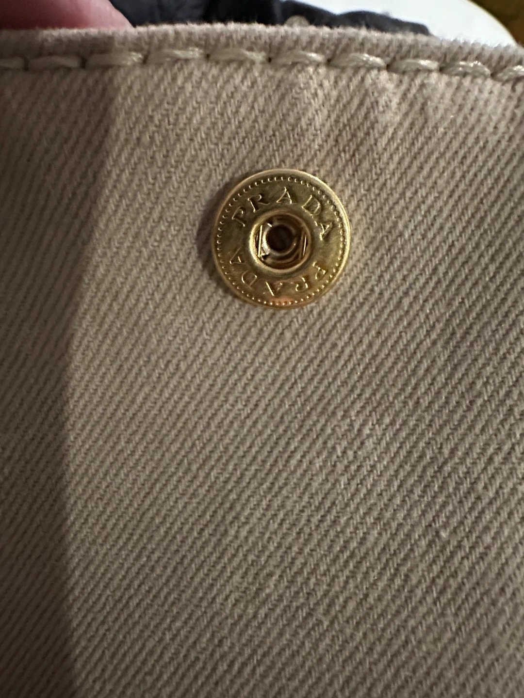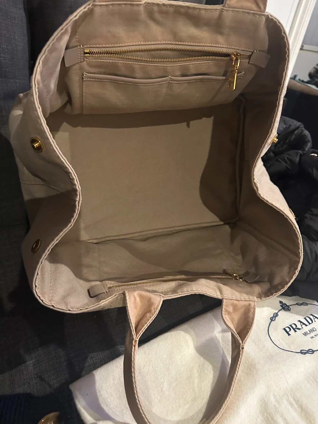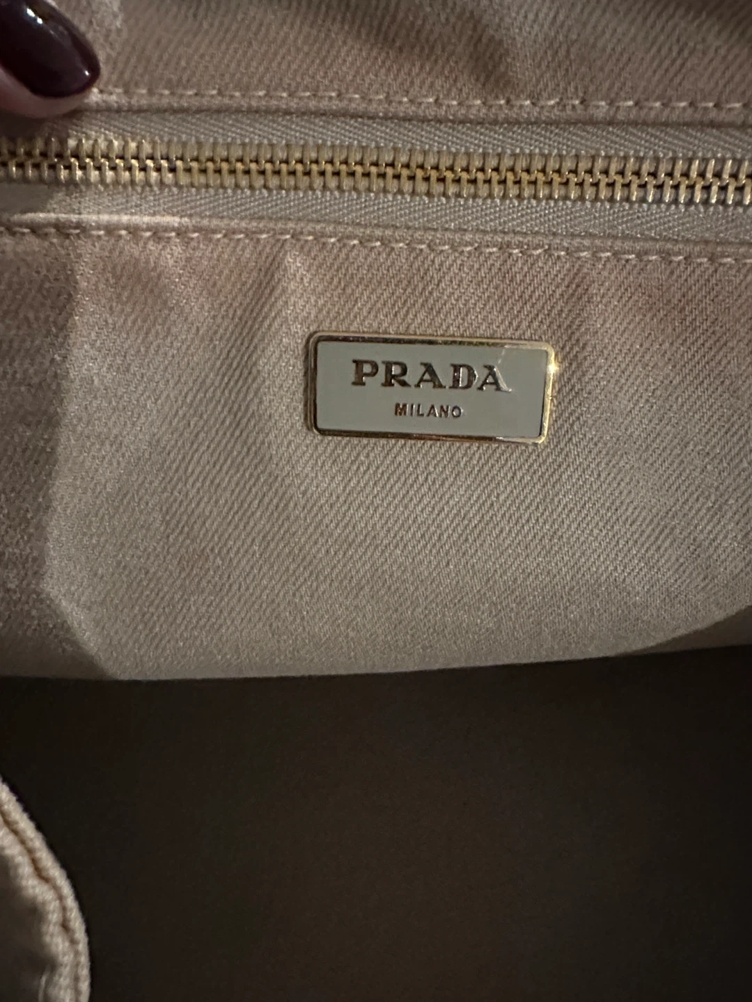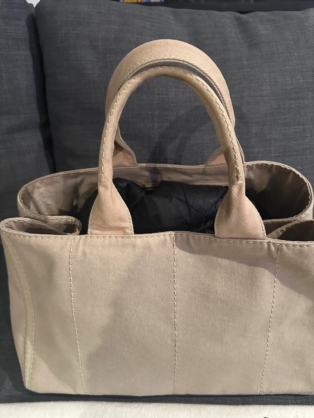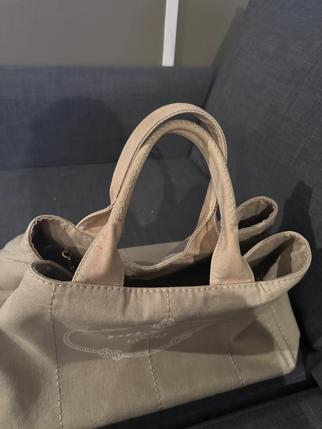 This is a stylish beige canvas tote bag from Prada. It features the iconic Prada logo printed on the front. The bag also comes with its original dust bag and authenticity card. It's a classic accessory for everyday use!