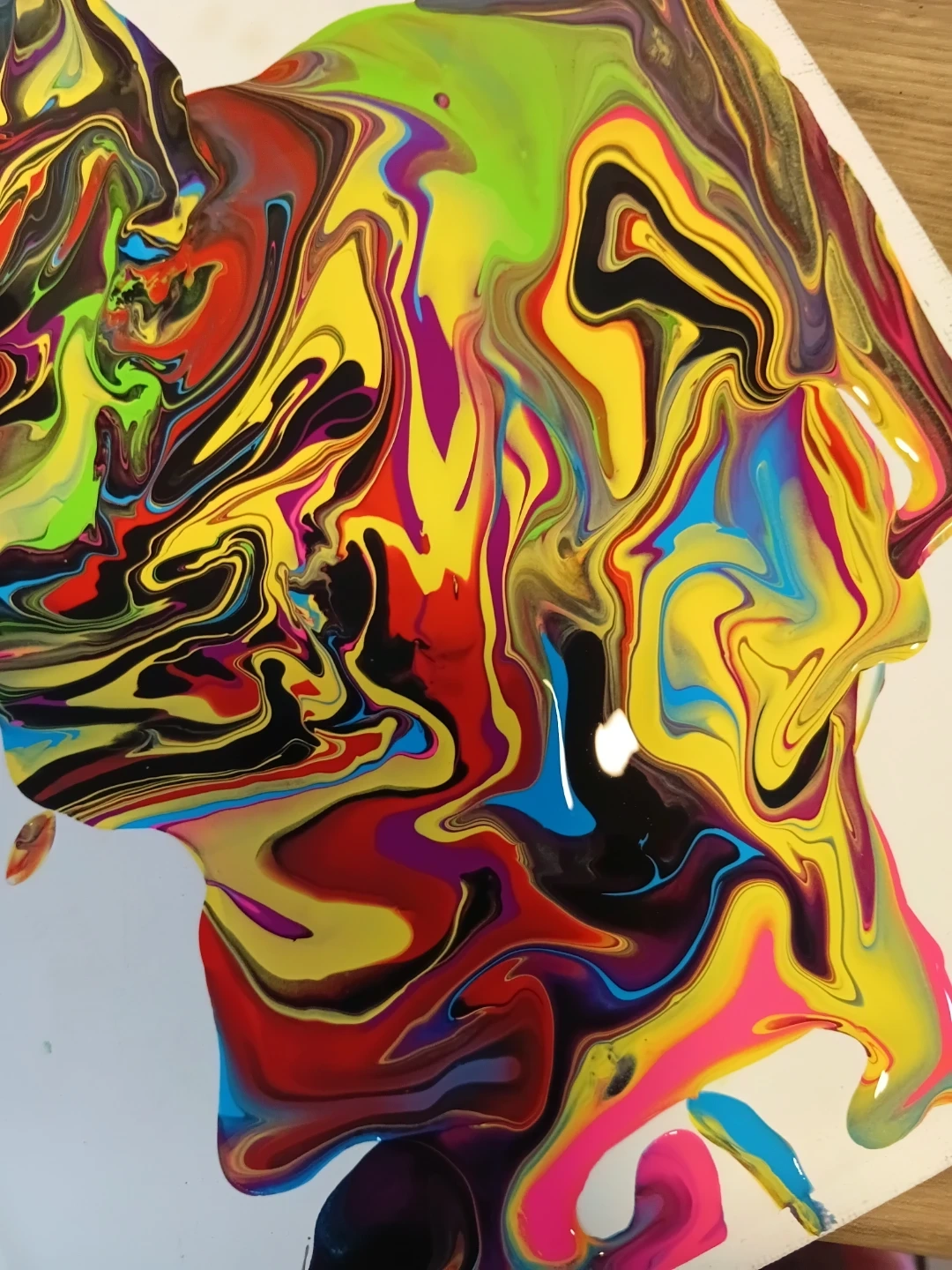 Vibrant multi-coloured acrylic pour paint on canvas. Includes bright yellows, reds, blues, greens, purples, and black. Perfect for adding a pop of colour to any space!