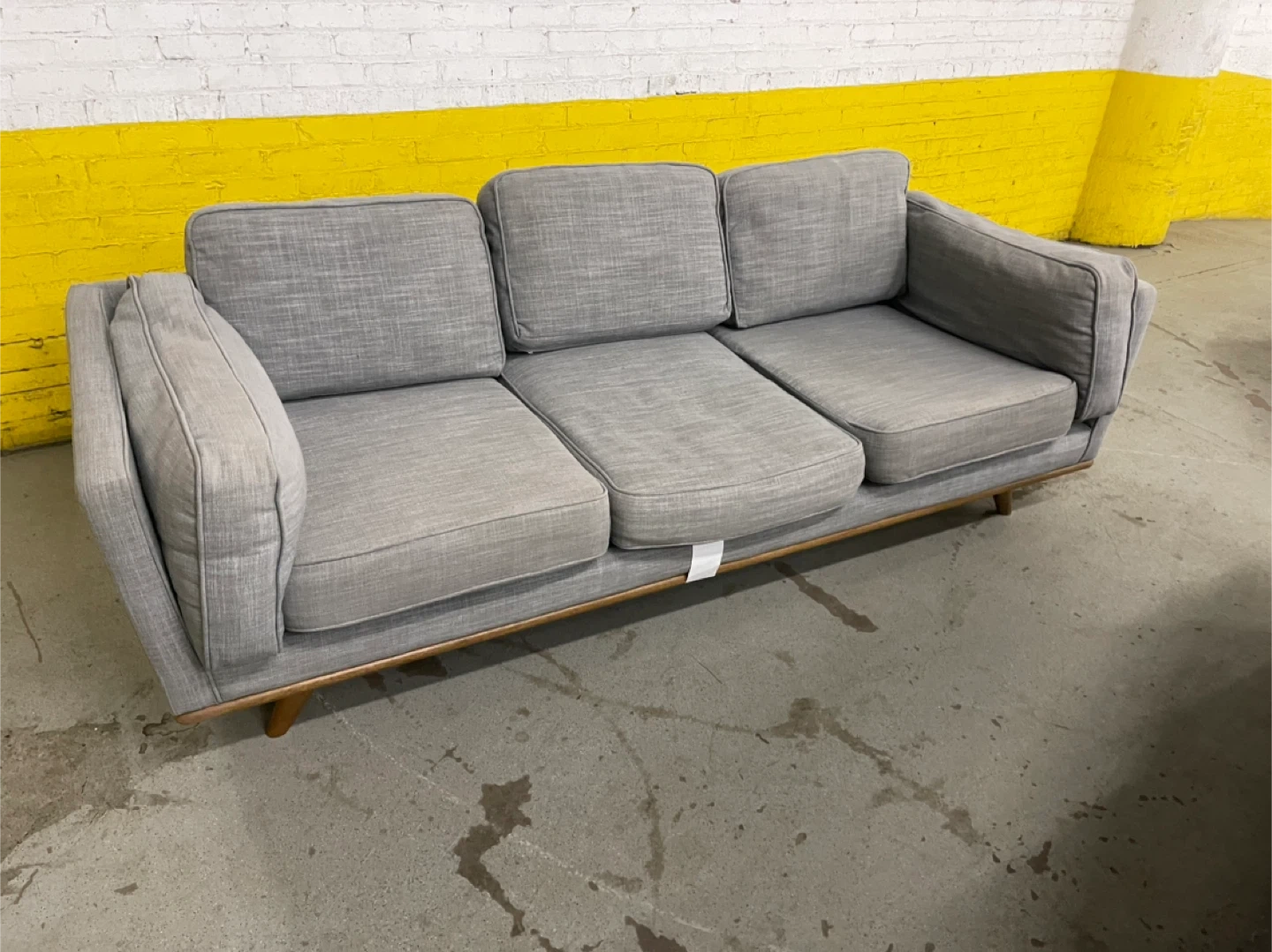 Gray fabric sofa with three seat cushions and three back cushions. It features a light wood base and tapered legs. Upholstered in a textured gray fabric.