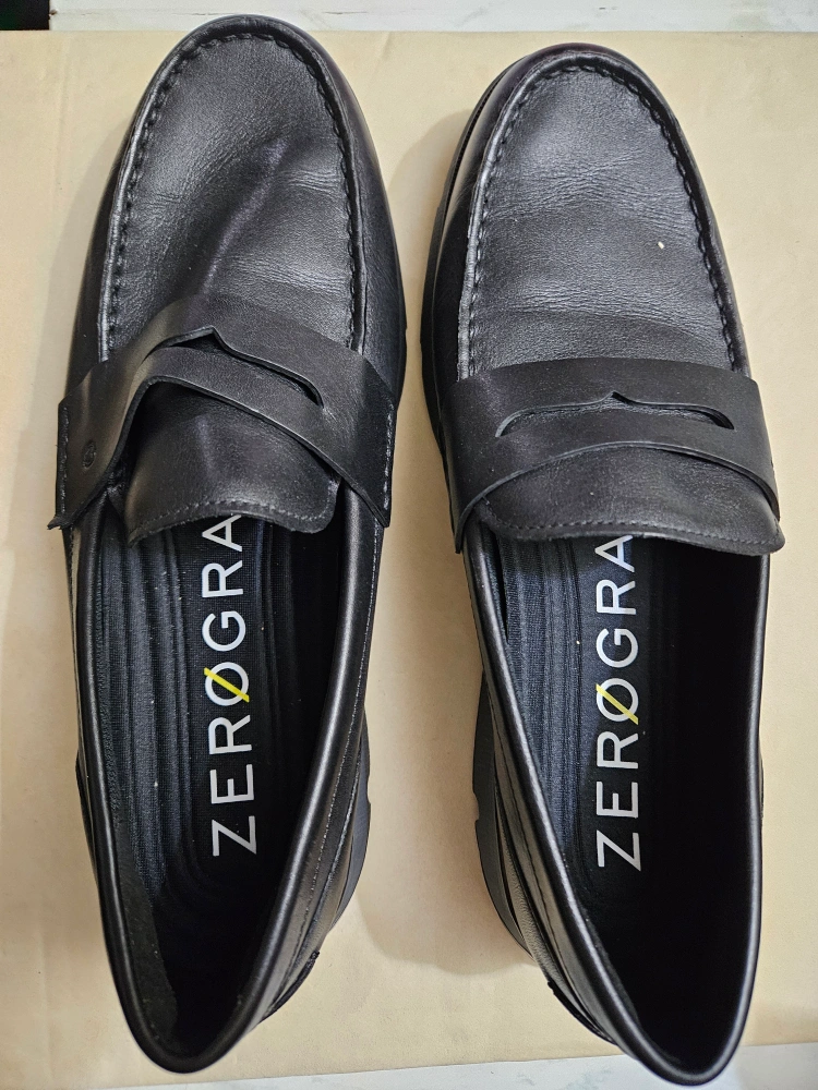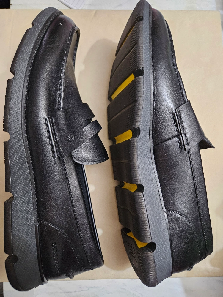 Black leather loafers with yellow accents. Zero Grand technology. Made in Vietnam.