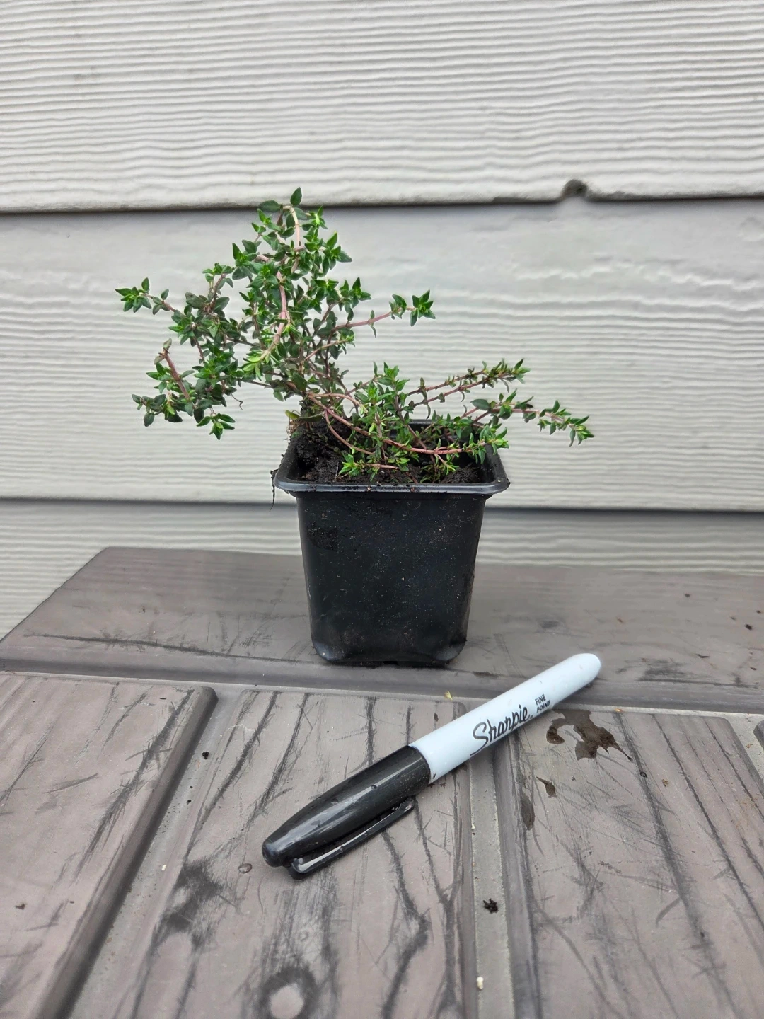 A small thyme plant in a black plastic pot. It's a herb that's great for cooking. You can transplant it to your garden or a larger container.