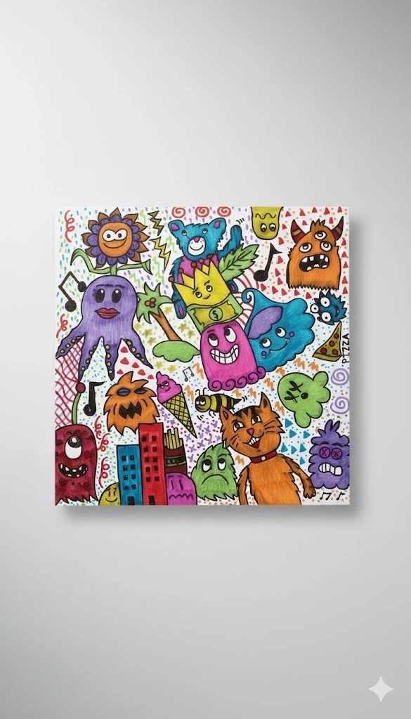 Vibrant canvas art featuring a playful mix of colourful monsters, doodled elements, and cityscapes. This piece adds a fun, energetic touch to any space. Hand-drawn artwork on canvas. (Frame not included, only the canvas)