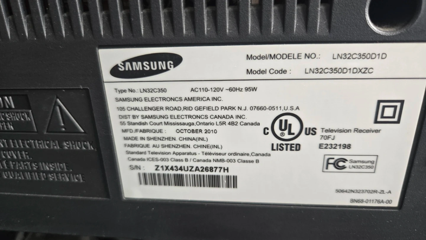 Samsung 32 inch LCD TV. Model number LN32C350D1D. Manufactured in October 2010. It's a standard television receiver.