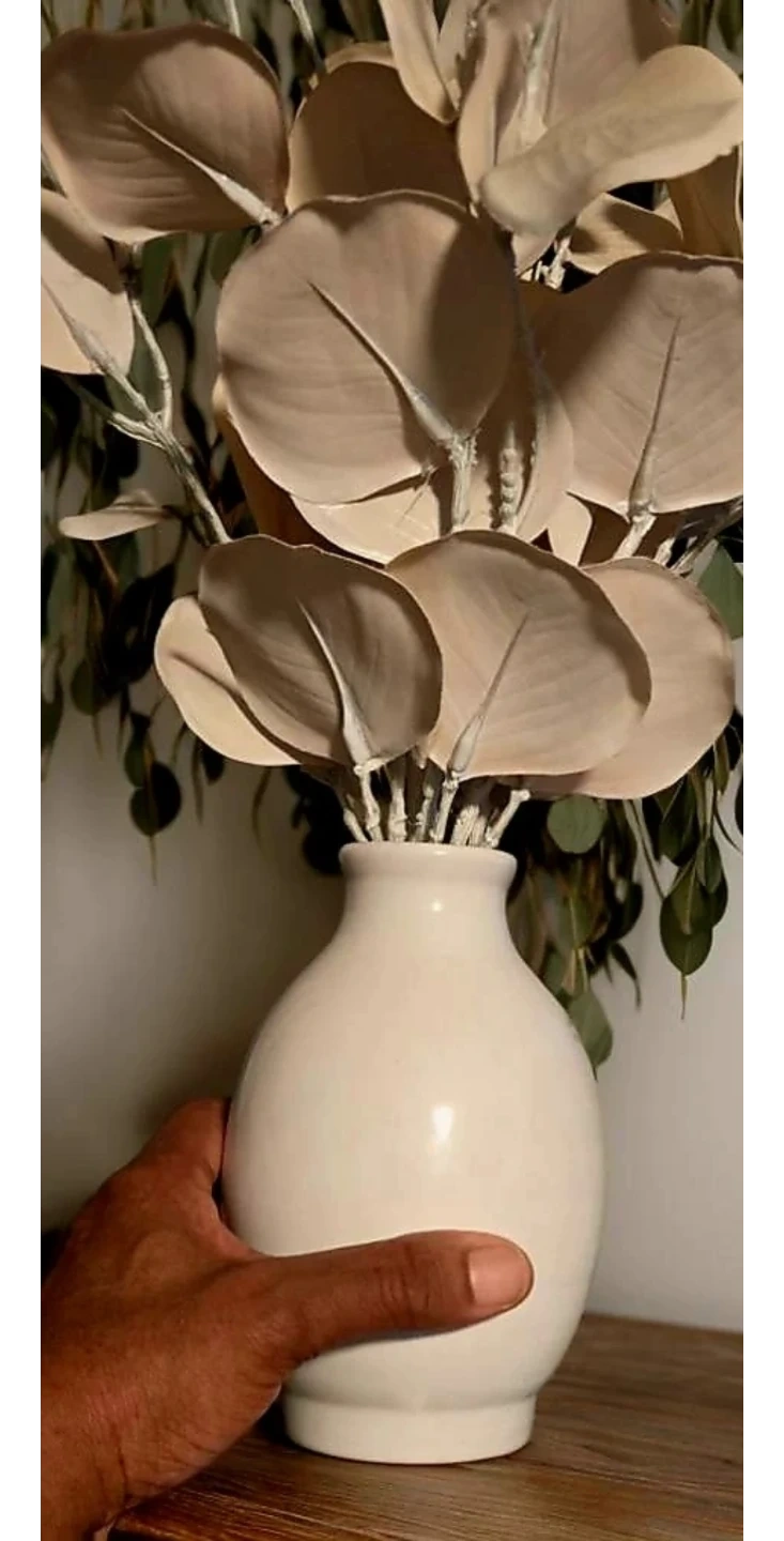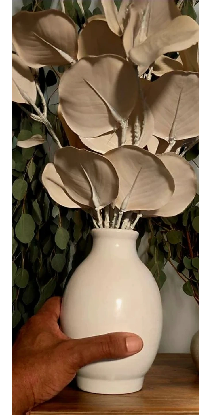 This set includes artificial eucalyptus stems with a neutral beige tone, arranged in a simple white ceramic vase. It's ready to add a touch of style to any room. The vase has a smooth, matte finish.