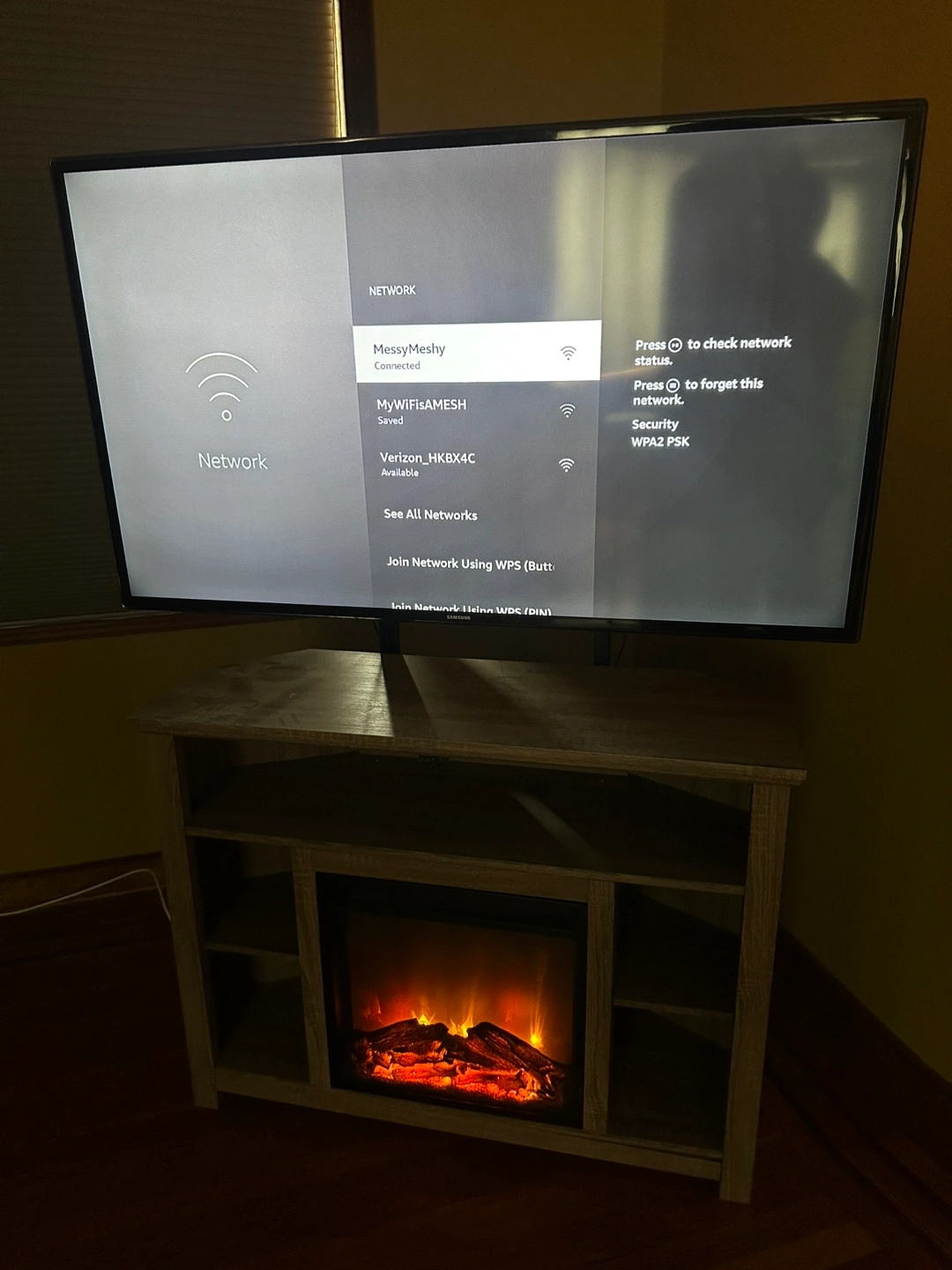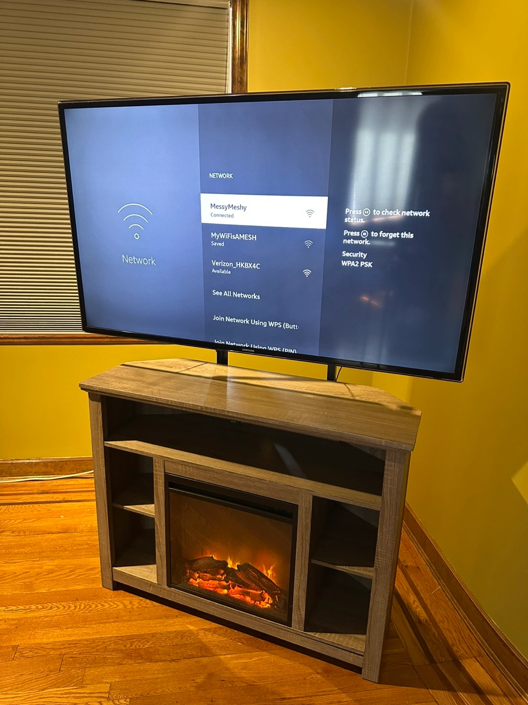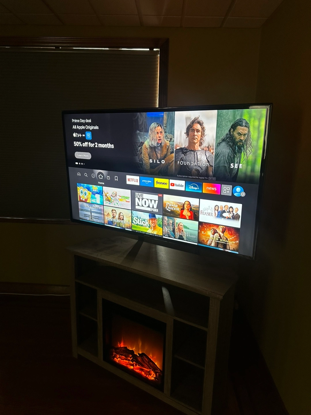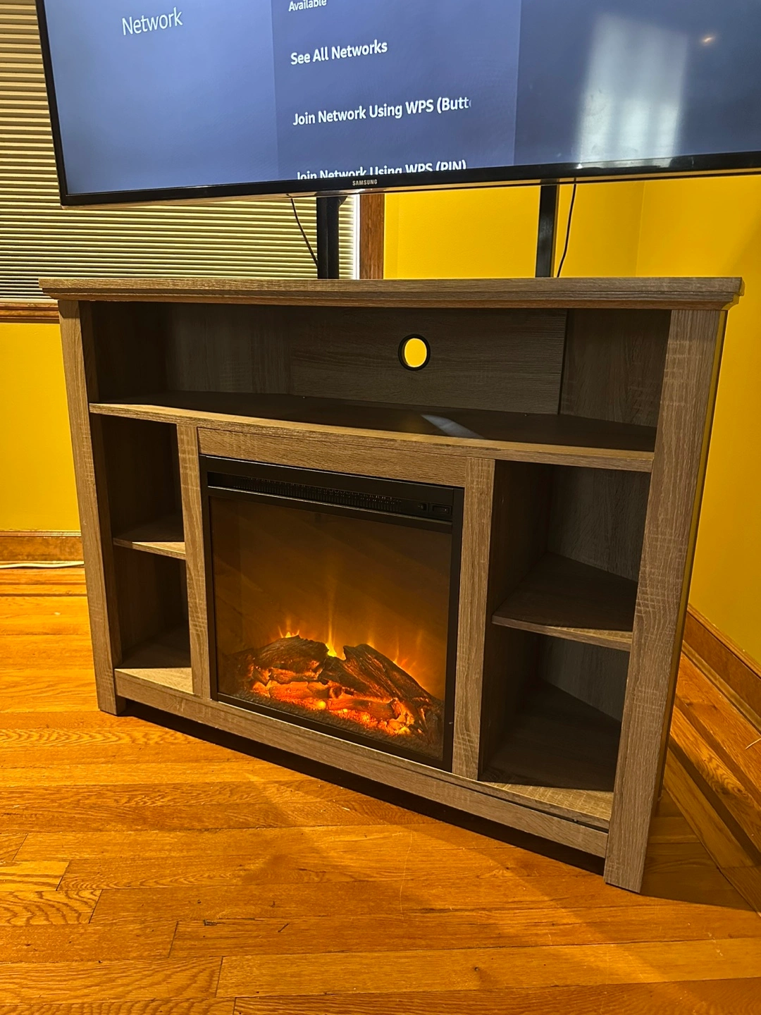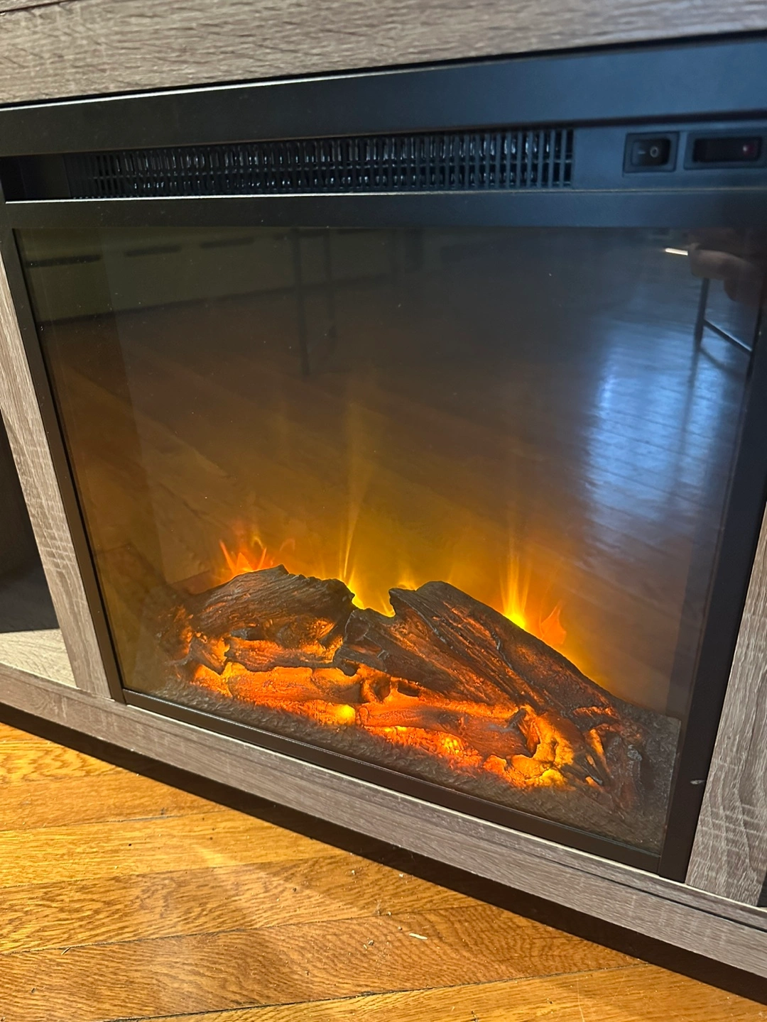 55 inch Samsung smart tv and stand with an electric fireplace that produces heat. I am moving into a smaller place and can not fit this. It has shelves for storage. Tv and stand sold together. Pick up only. Tv alone goes for 380$ online.