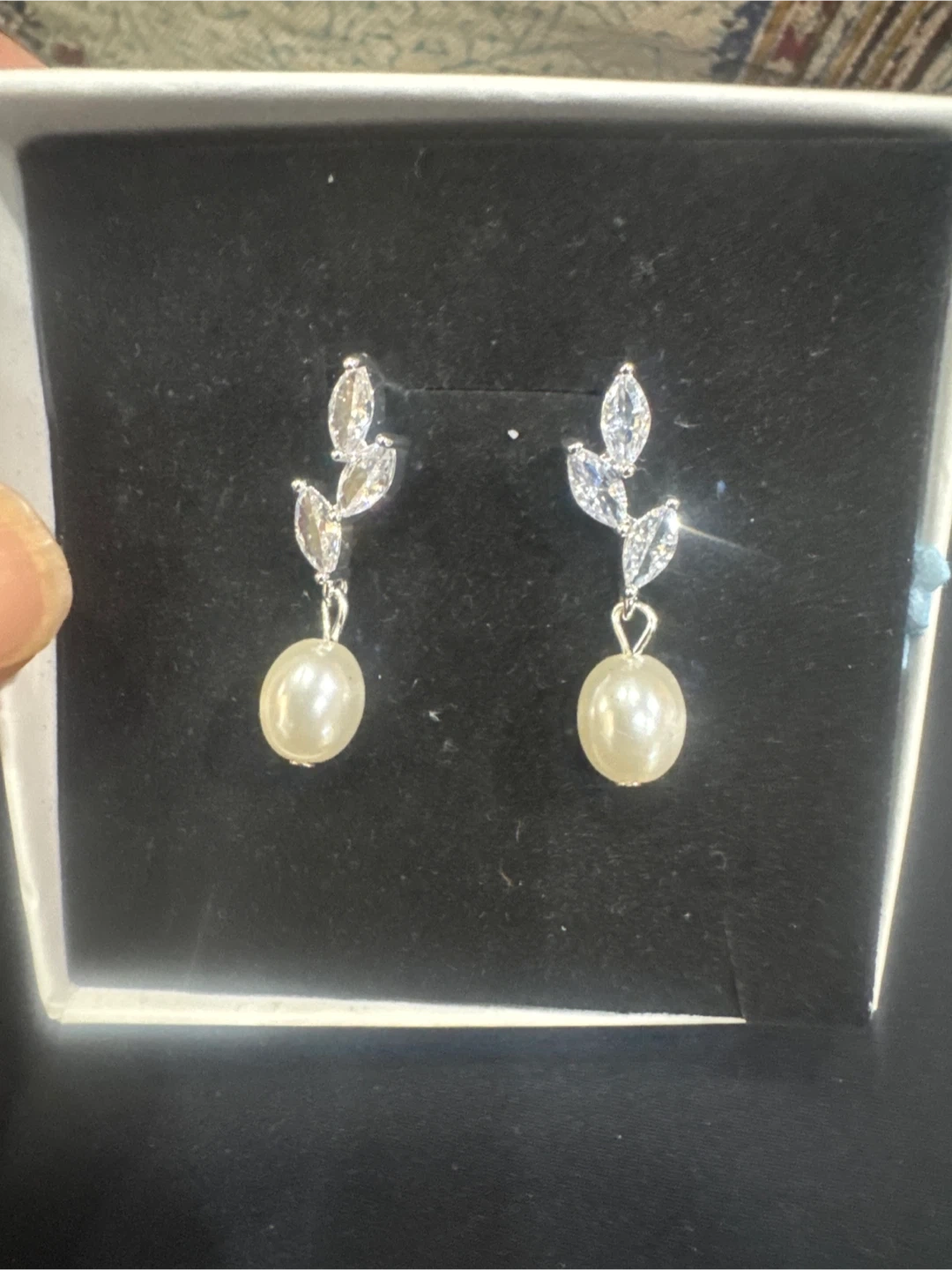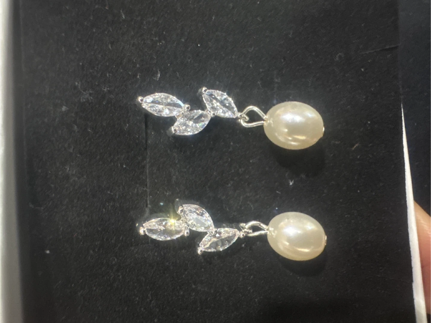 Elegant VEEDOFA earrings featuring pearl drops and sparkling crystal accents. These earrings come in a decorative box. They're perfect for adding a touch of class to any outfit!