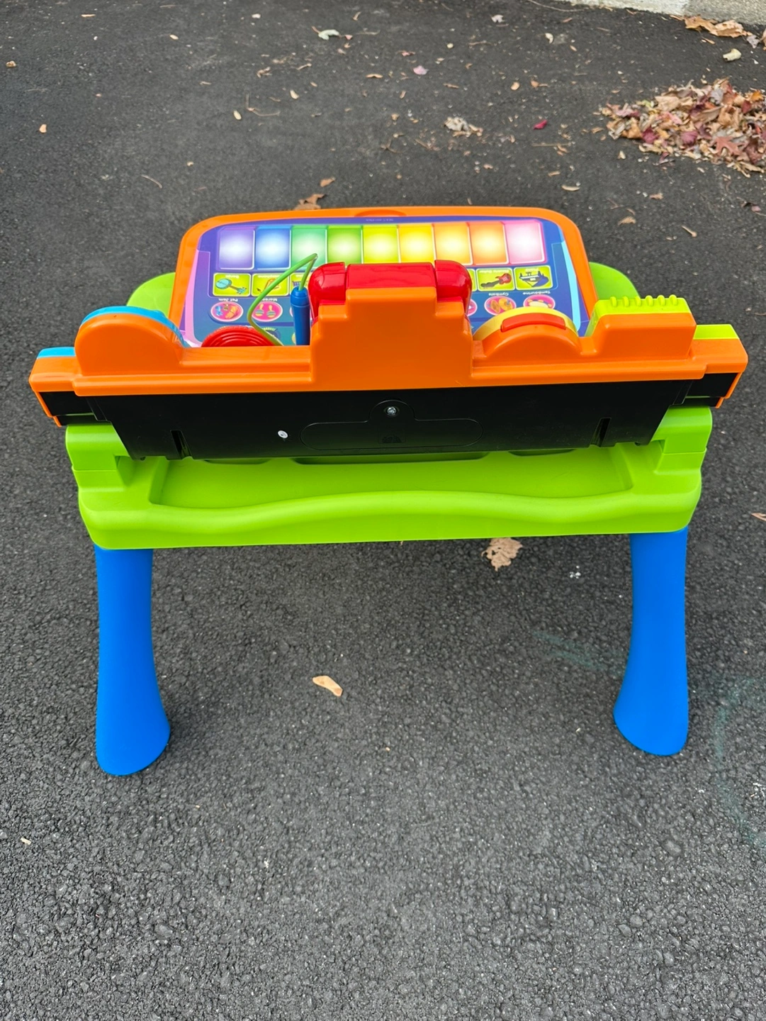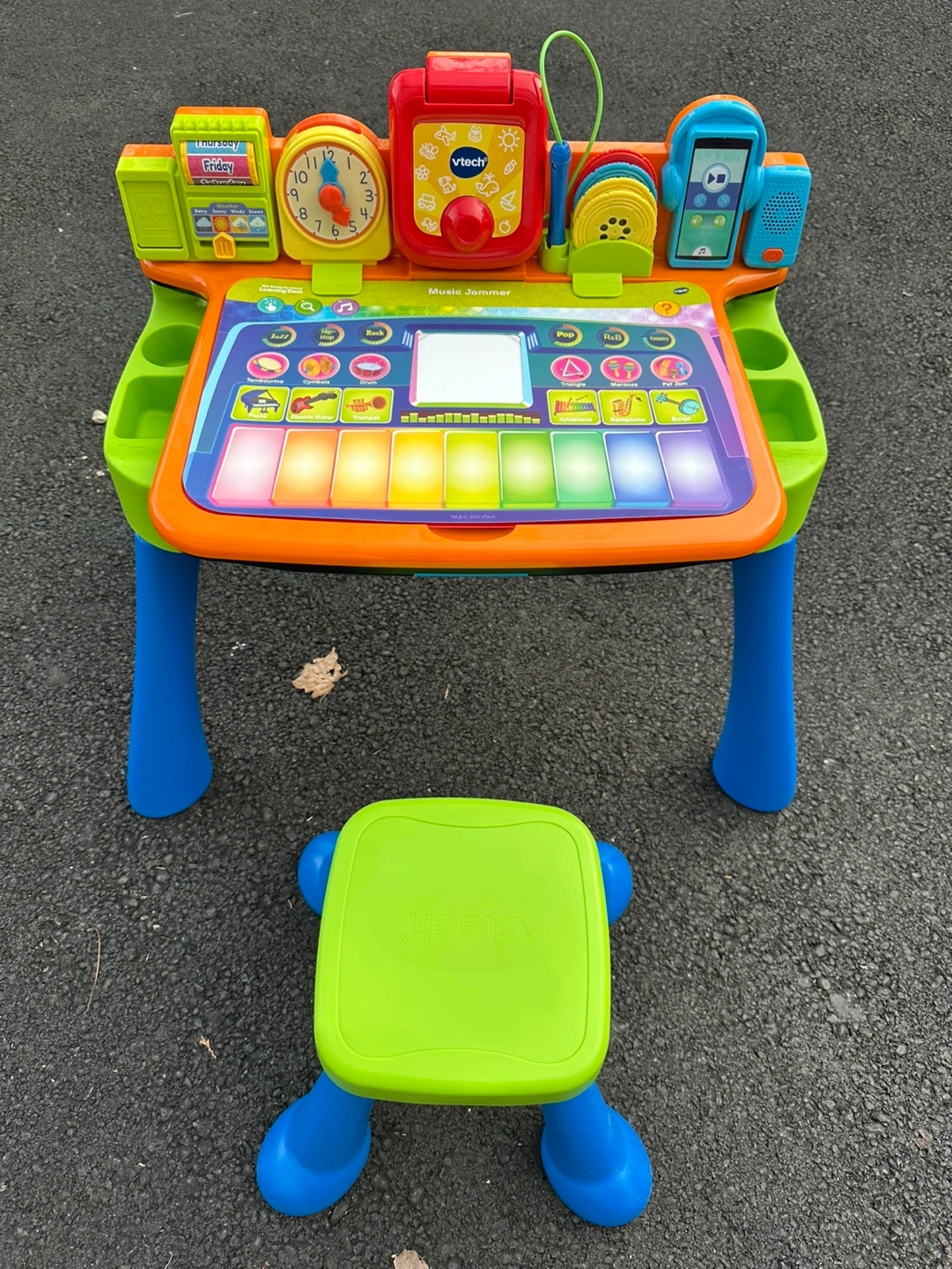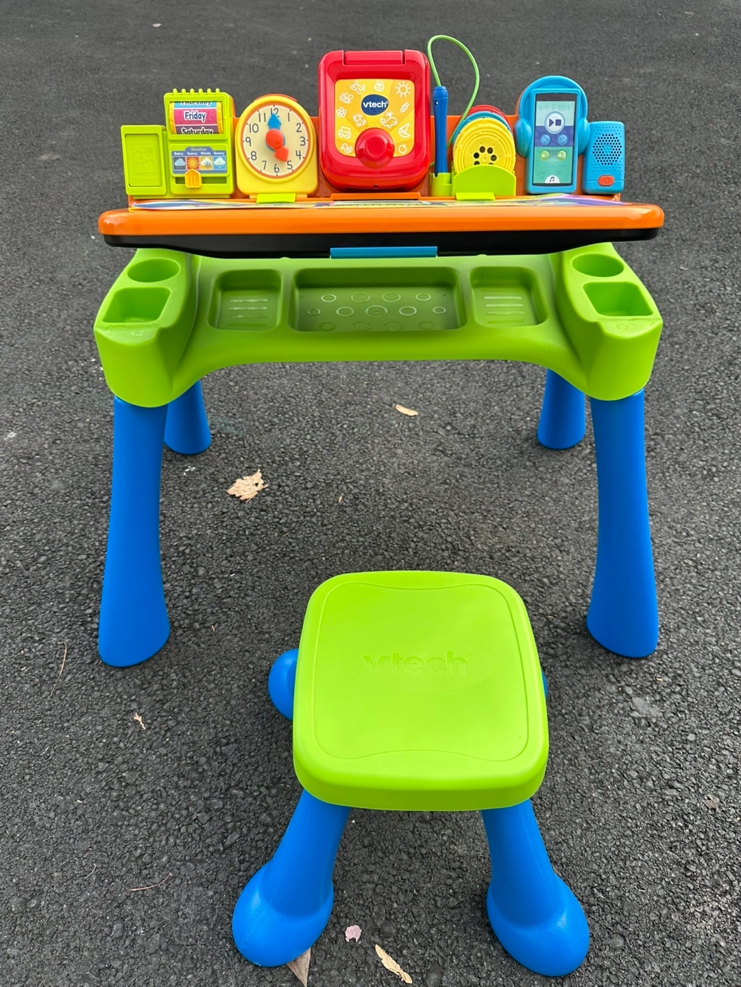 Barely used, Like-new and fully complete 5-in-1 desk with stool with interactive desk top, projector, LED writing pad with stylus, chalkboard and art station Unique projection system and color-coded reels let kids trace projected images, practice drawing; learn about shapes and the human body with the corresponding activity pages Activity pages: Numbers & Counting, Music Jammer, Dress Your Body, Shapes & Colors, and built-in Alphabet & Letter Sounds page Desk accessories: music player, days of the week roller, weather slider, picture frame, practice clock with moveable hour hand Intended for toddlers ages 2+ years requires 4 AA batteries; batteries not included Retails for $54.99