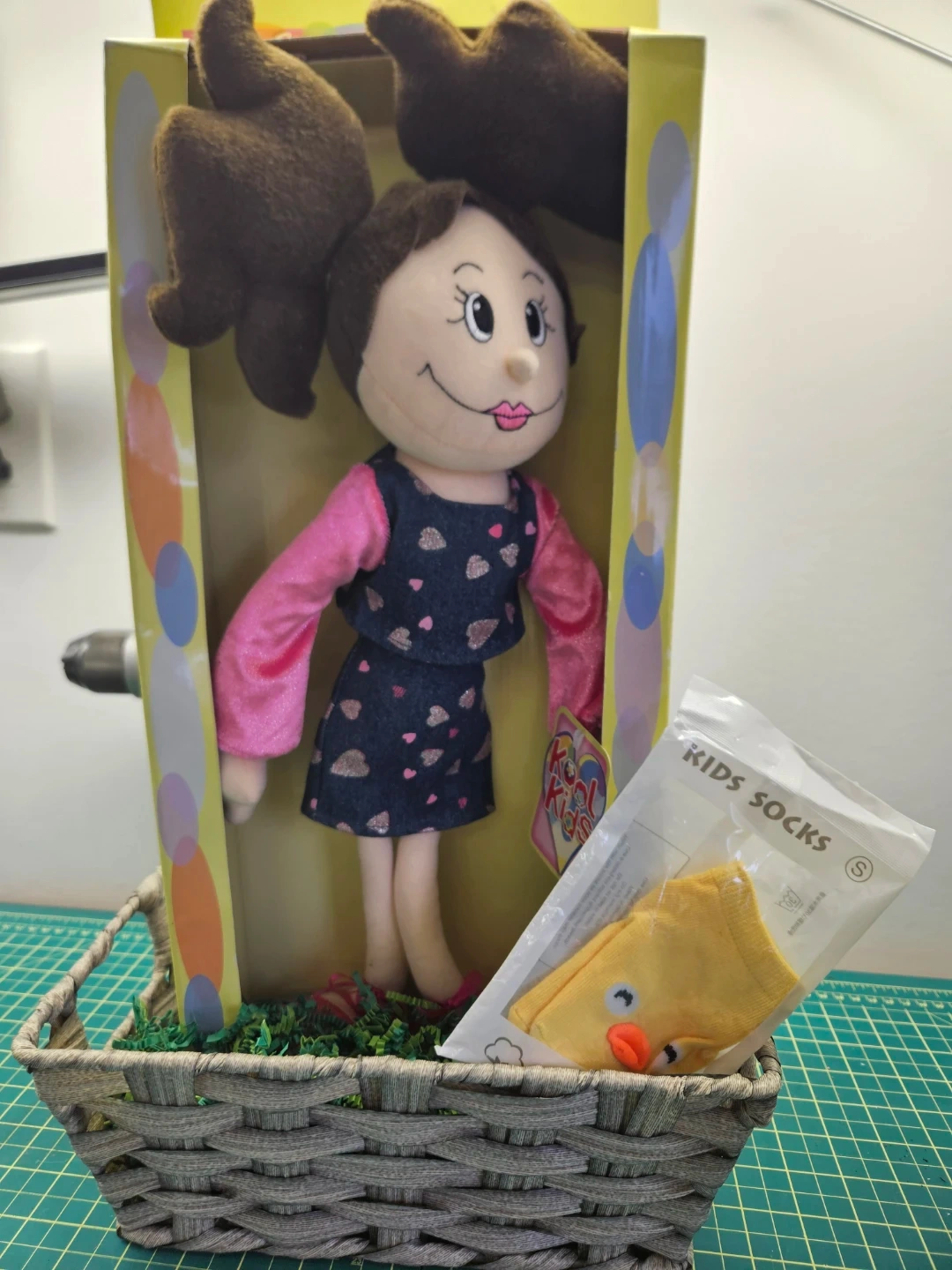 This Kool Kids doll comes dressed in a denim-style dress with pink sparkly hearts and a pink long-sleeved shirt. It also includes a pair of small yellow kids socks with a duck design. Doll is in its original box packaging.