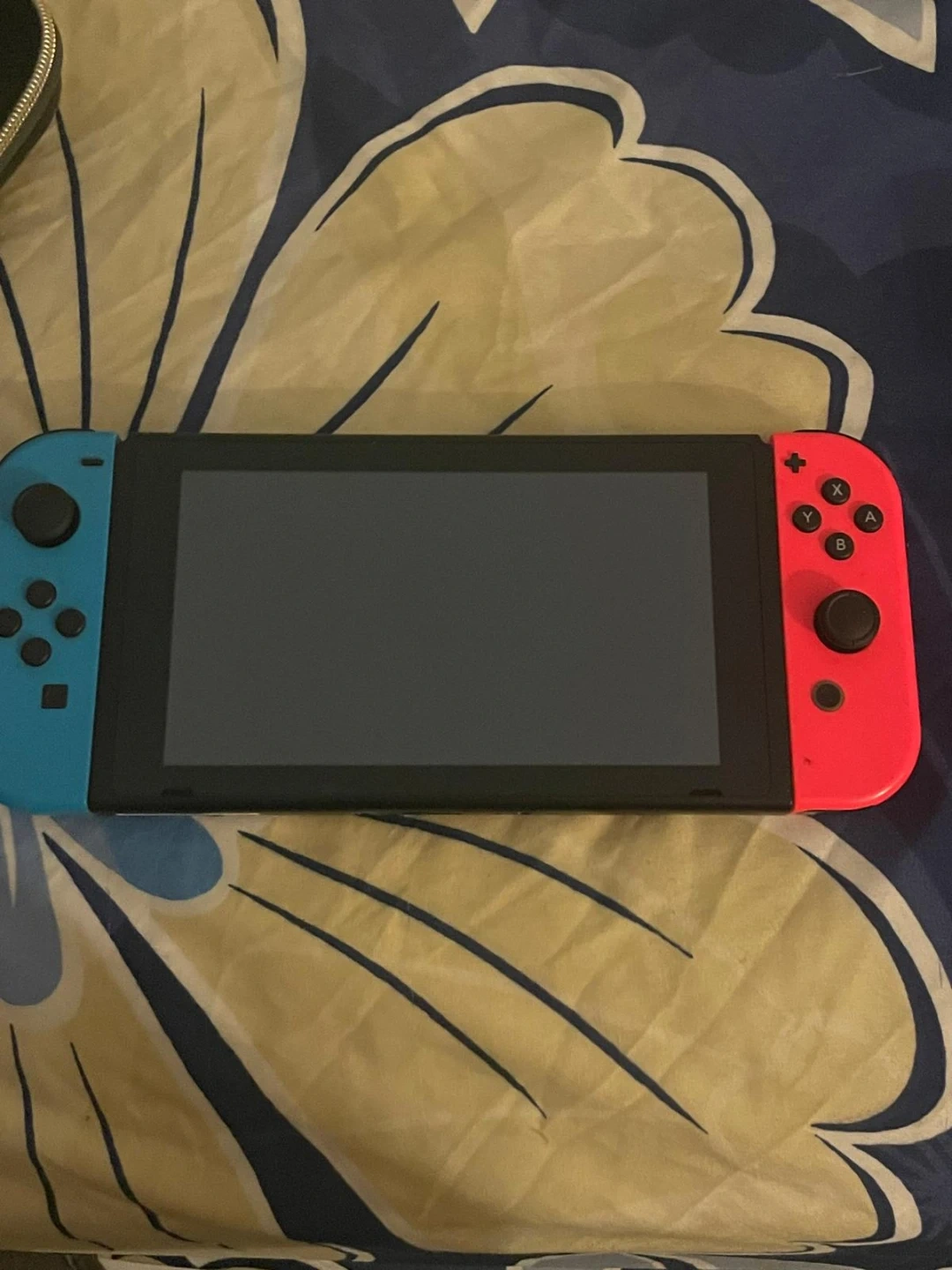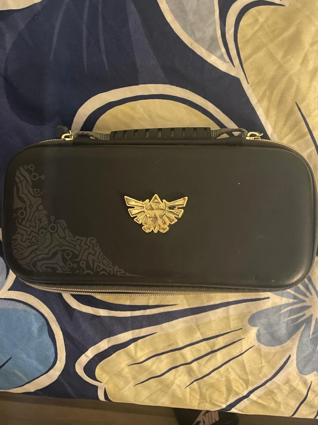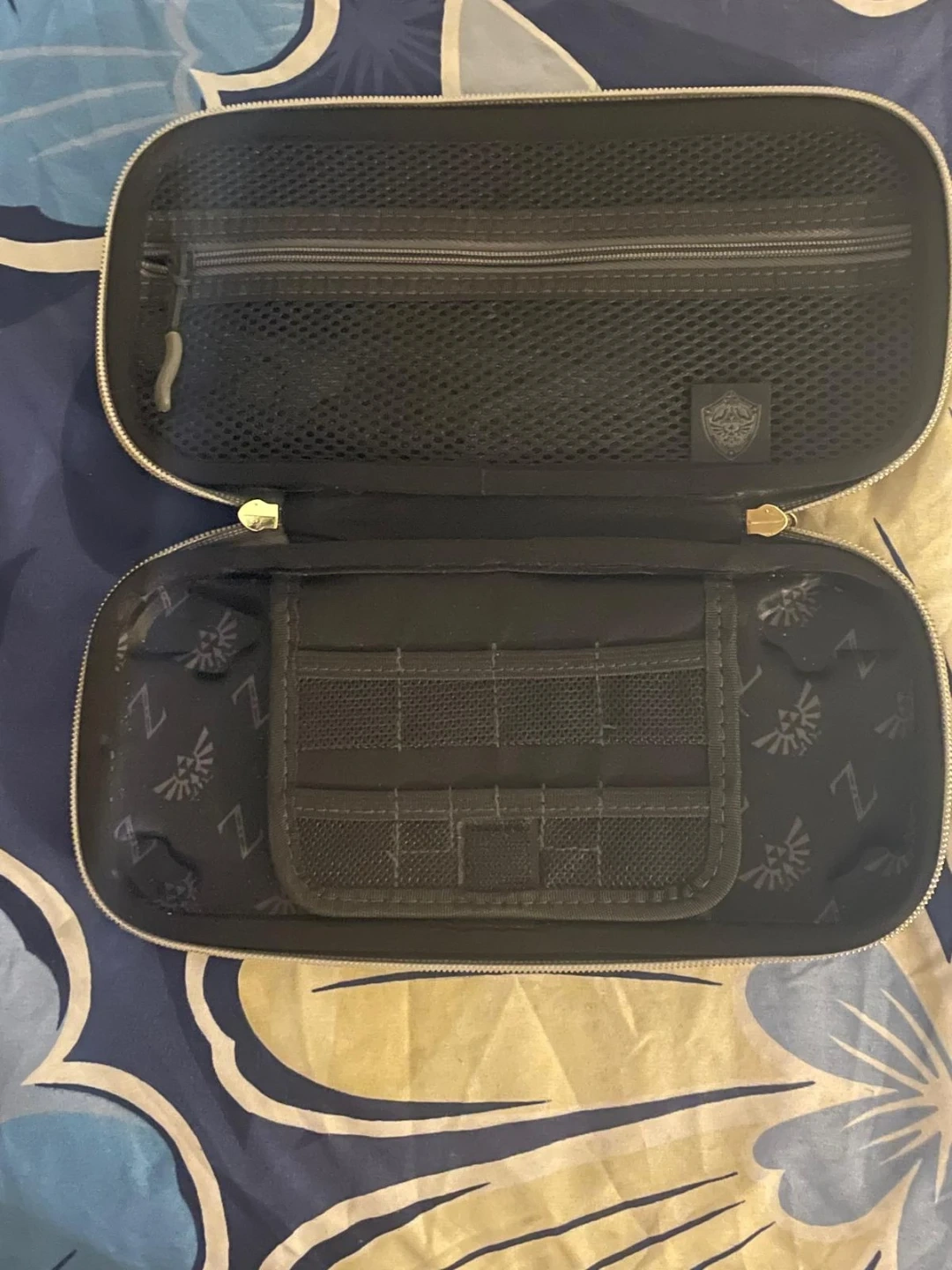 This is a Nintendo Switch gaming console. It comes with a protective carrying case featuring Zelda-themed accents. The case has internal mesh pockets and elastic straps for secure storage.