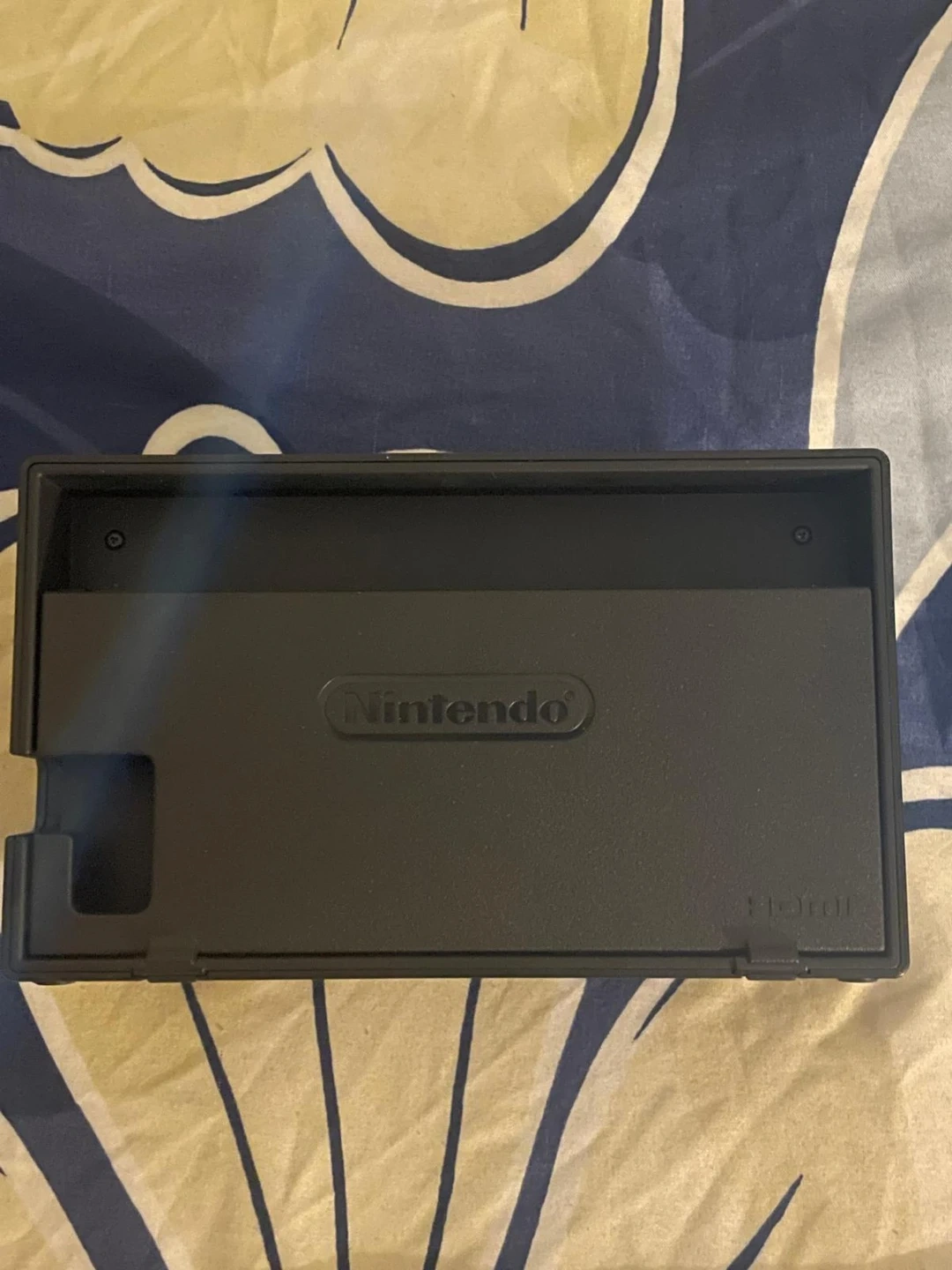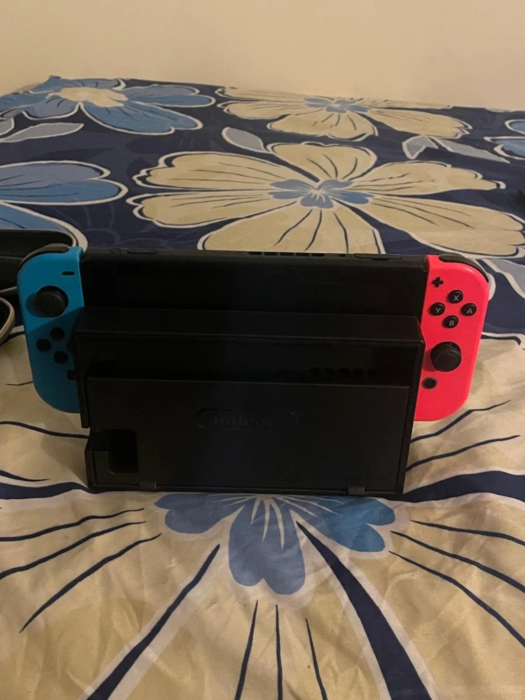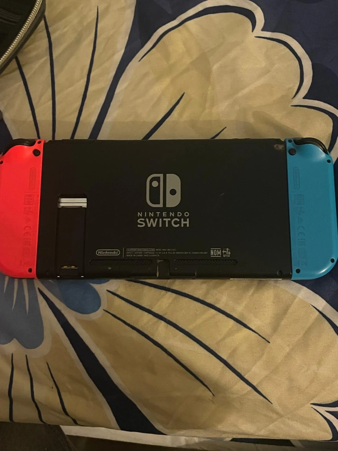 This is a Nintendo Switch gaming console. It comes with a protective carrying case featuring Zelda-themed accents. The case has internal mesh pockets and elastic straps for secure storage.