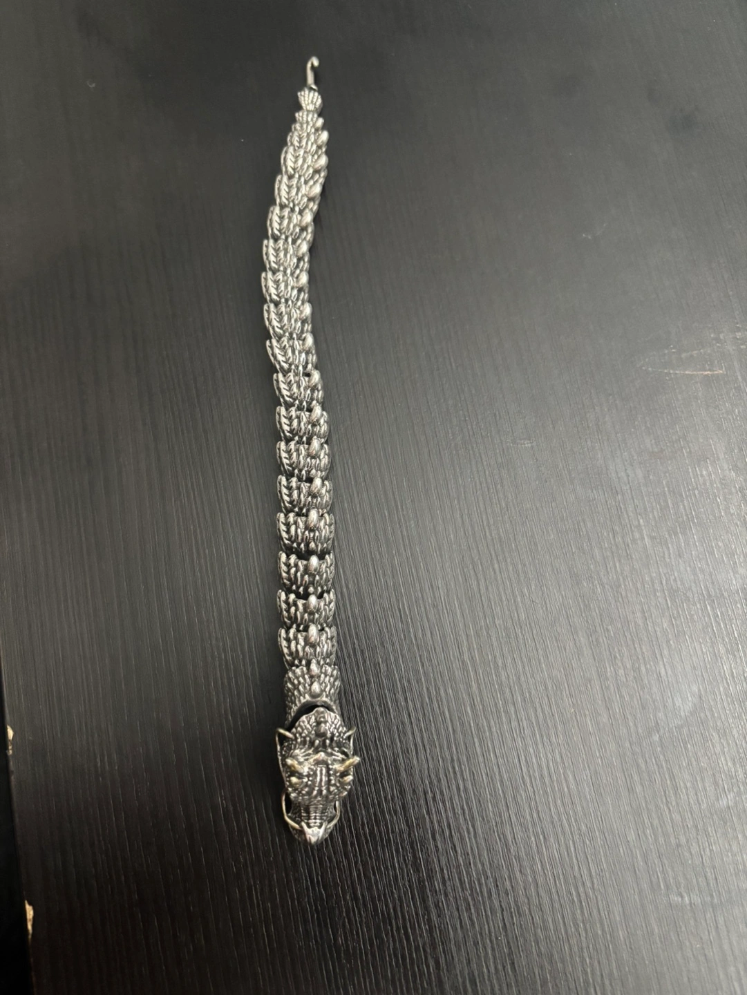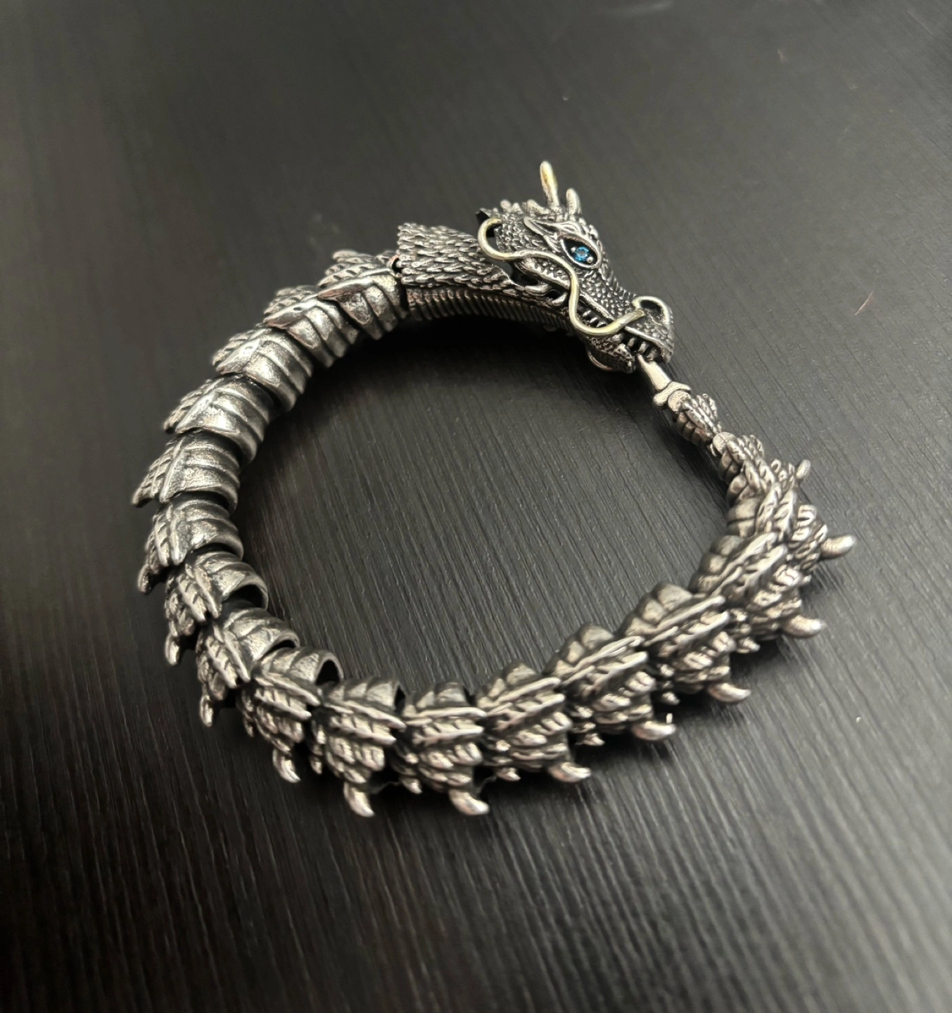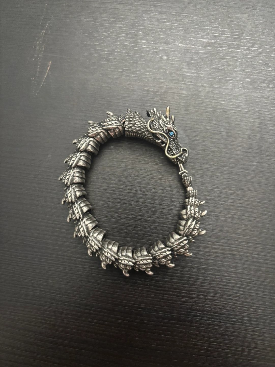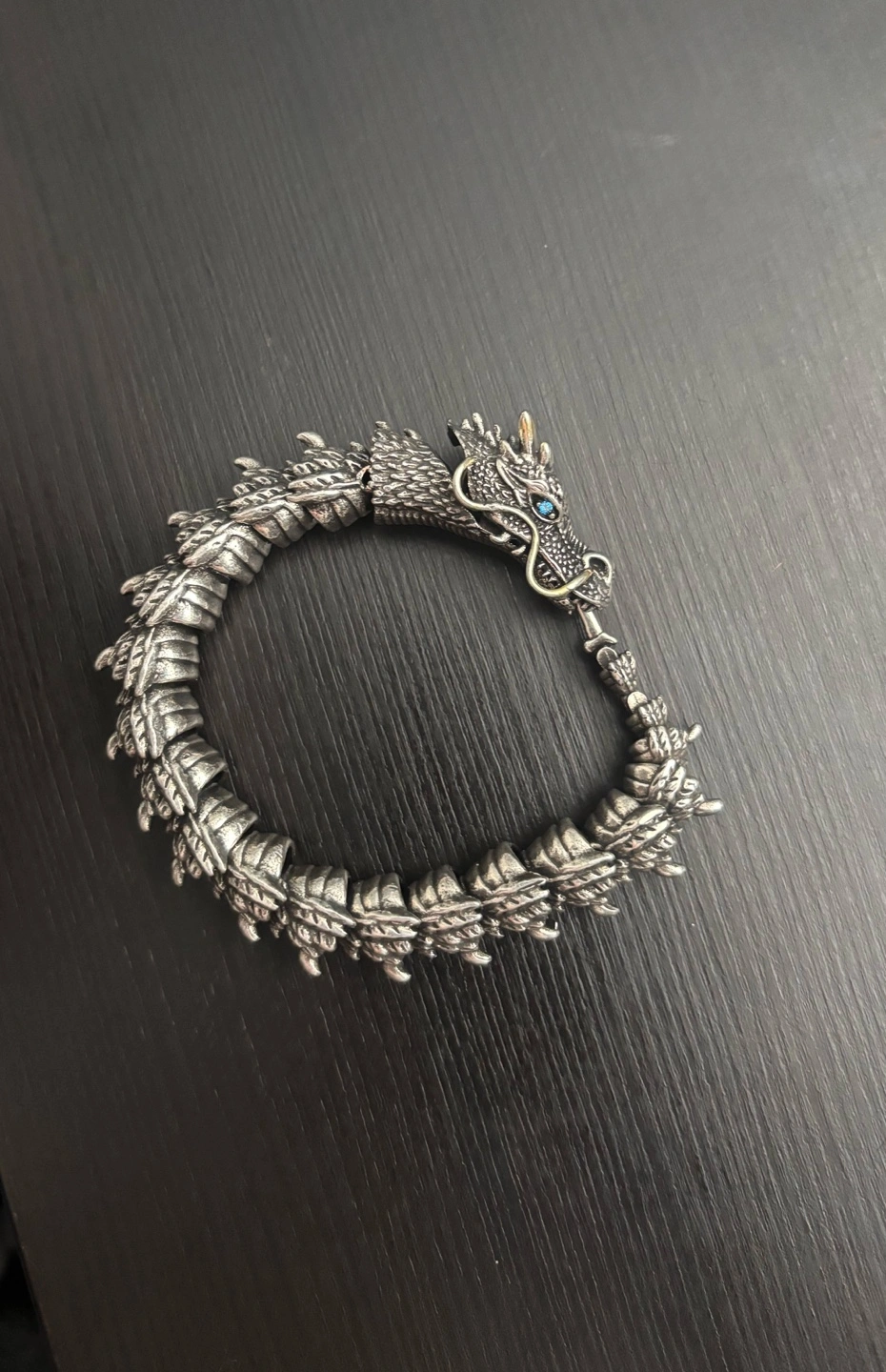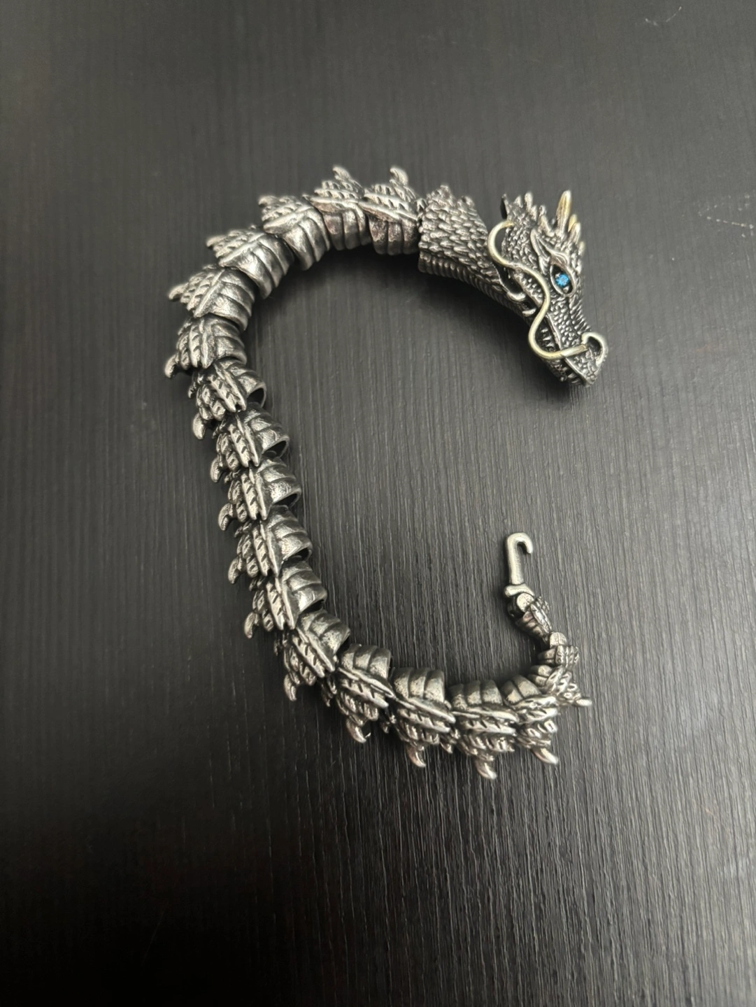A dragon bracelet made of real metal and has blue eyes. The way to attach and detach the bracelet is by pressing the dragon’s jaw and the top of its head for the hook ( tail ) to be attached/detached . It is 18 cm