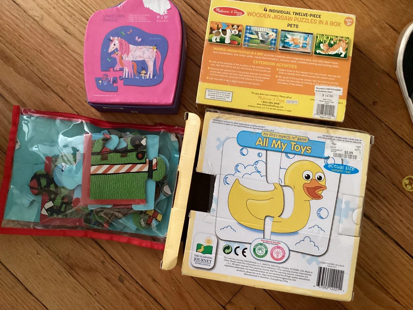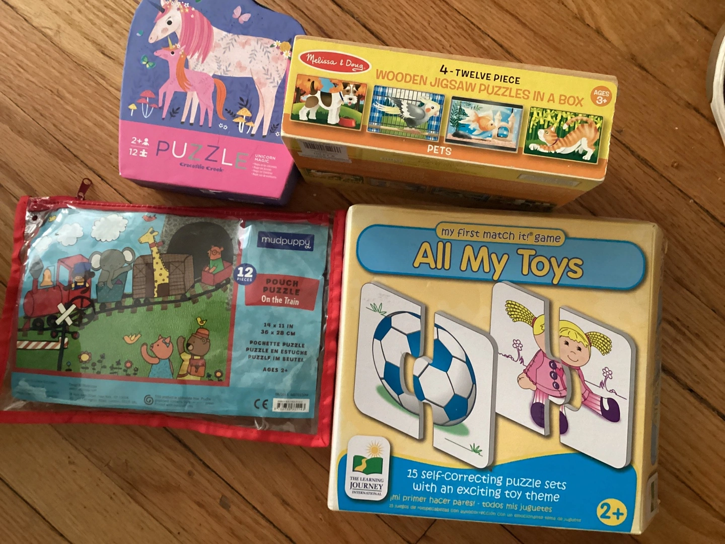 Selling a bundle of kids' puzzles! Includes a Melissa & Doug 4-twelve piece wooden jigsaw puzzle set, a Mudpuppy pouch puzzle on the train, a Unicorn Magic puzzle, and 'My First Match It!' game. All are in good condition and ready for a new home