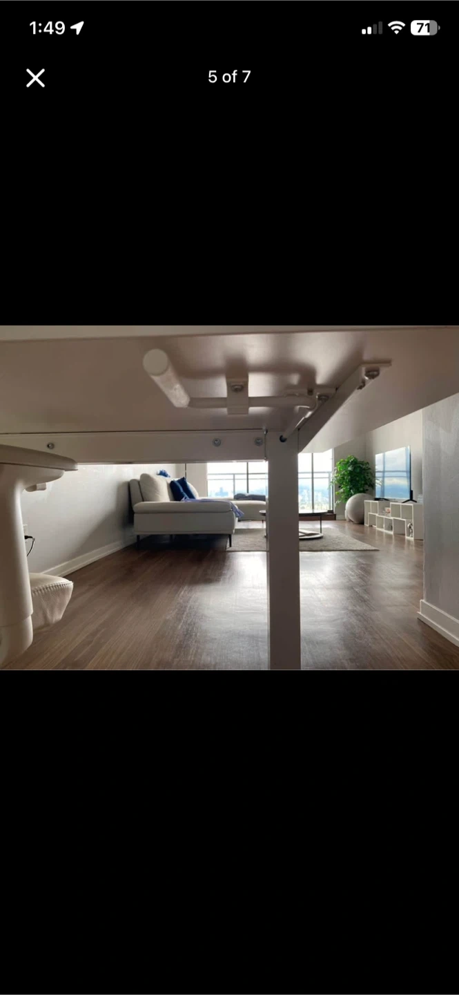 This is a white standing desk. It's a sit-stand desk with an manual motor for height adjustment. The desk has a clean, minimalist design and would work well in an office or home workspace. It's large enough to hold multiple monitors. Current price is 299. Transportation is not included.