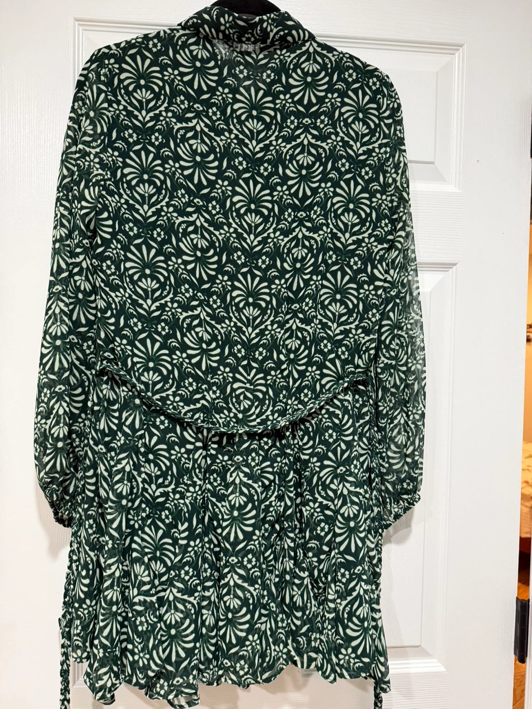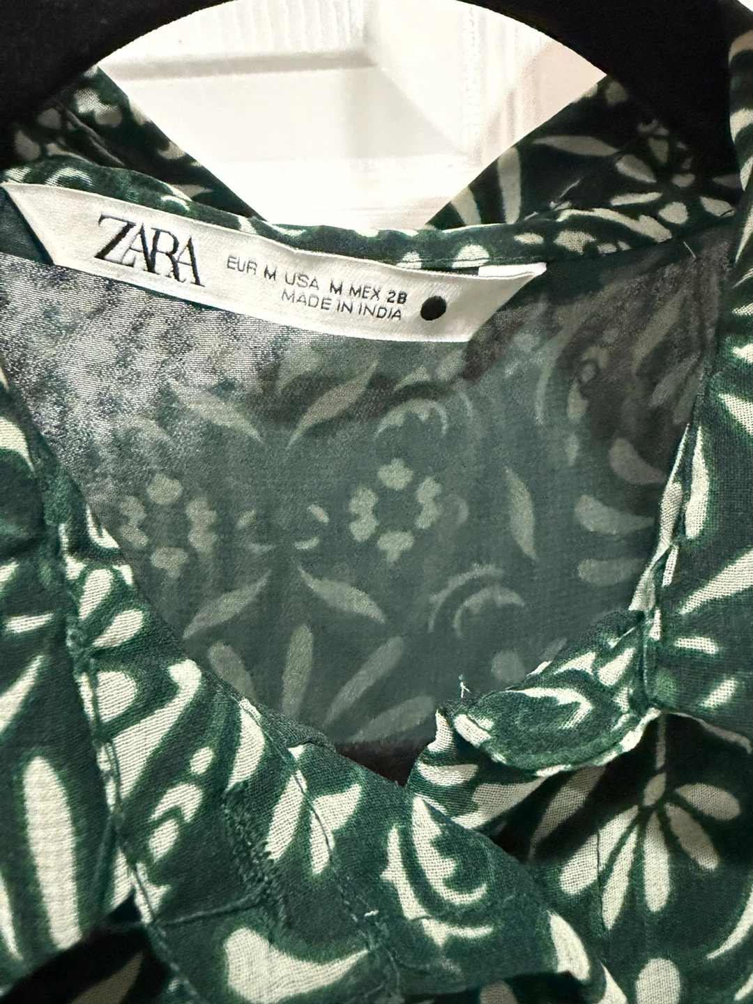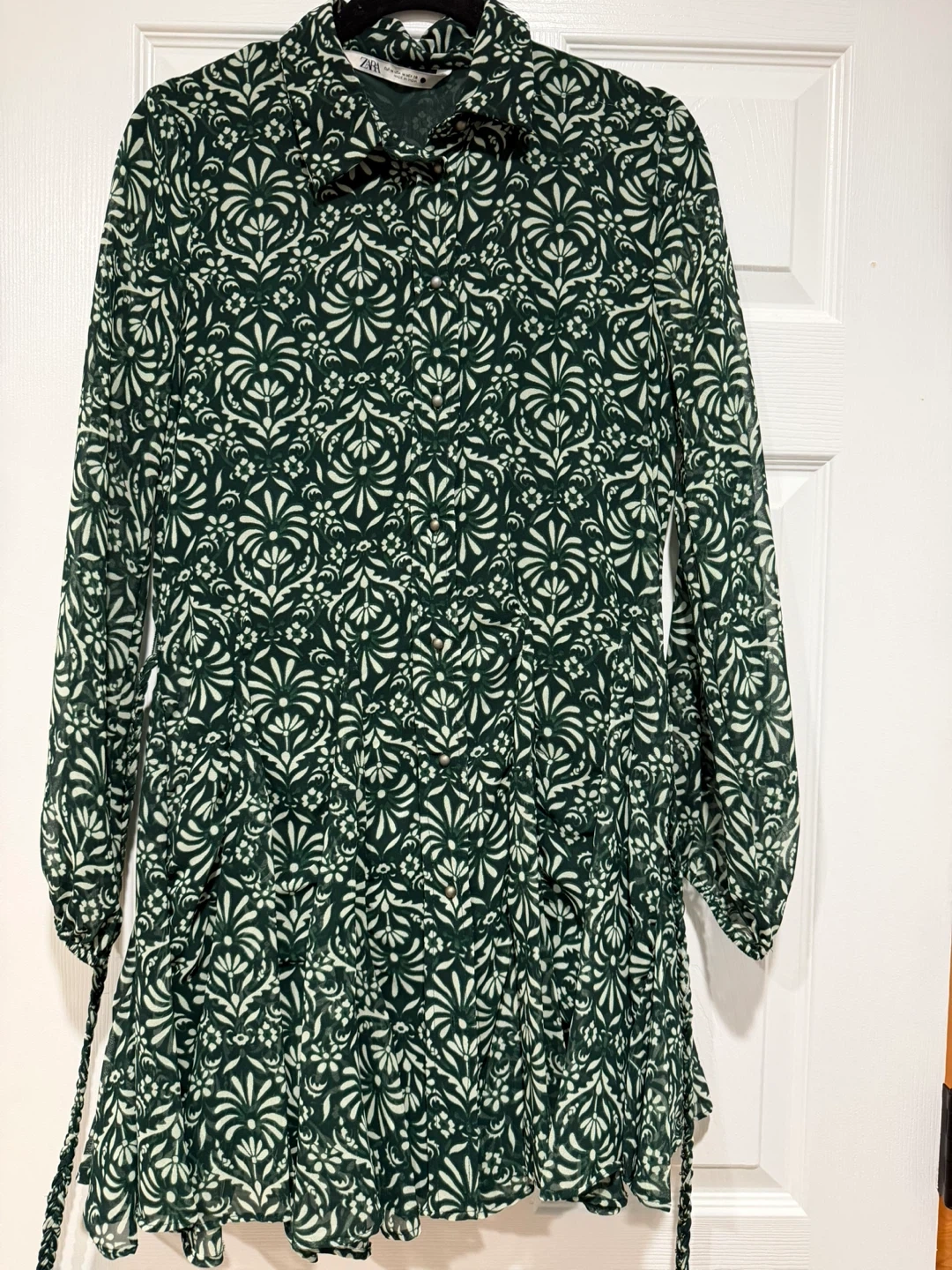 This is a Zara women's dress featuring a green and white floral print. It has long sleeves and a tie belt. Size is medium.