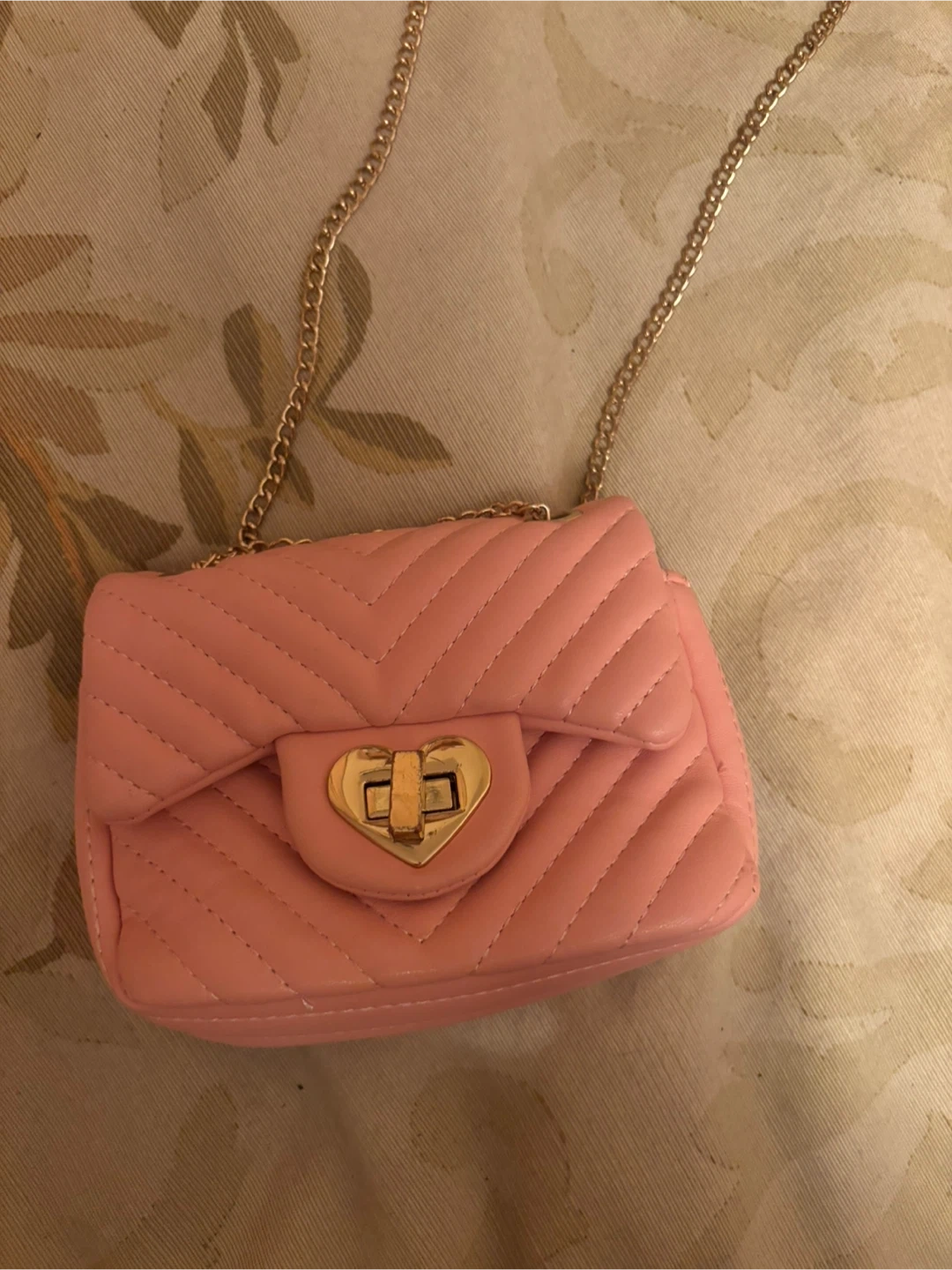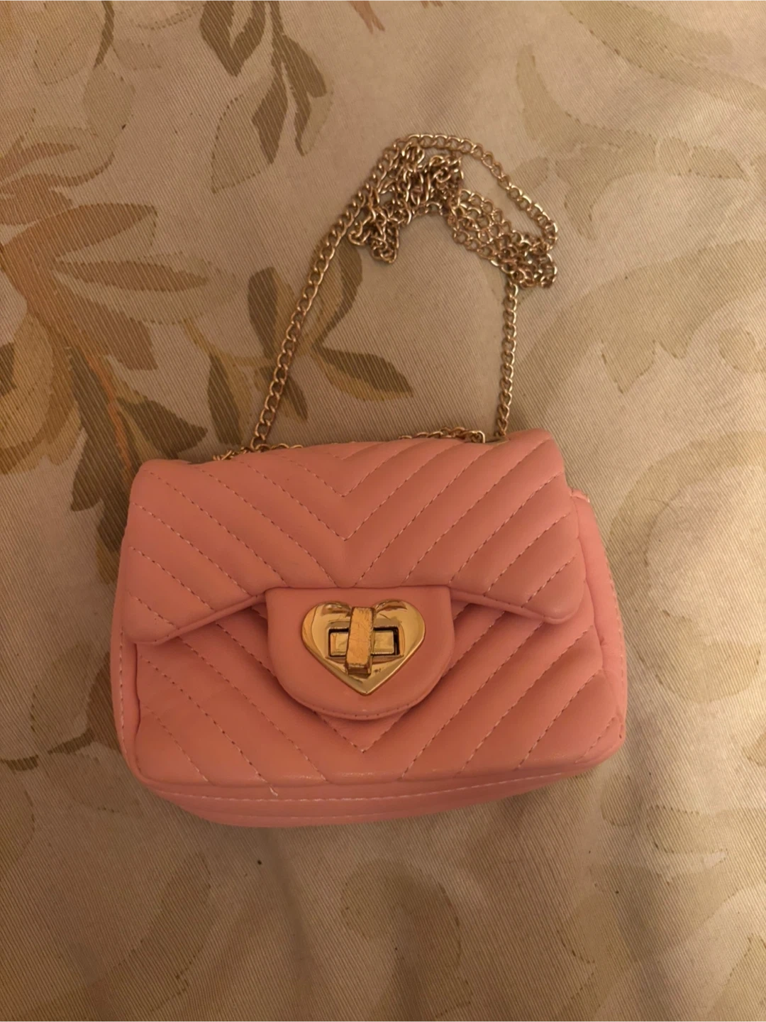 A cute pink crossbody bag with a chevron quilt pattern. It has a gold heart-shaped clasp and a delicate gold chain strap. Perfect for carrying essentials when you don't need a lot.