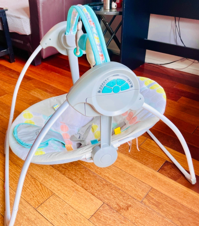 A baby swing with multiple speeds and swing motions, as well as sound and vibration options. It has a removable toy bar with 2 plush toys. The fabric is easy to wipe clean. The swing folds compactly for storage.